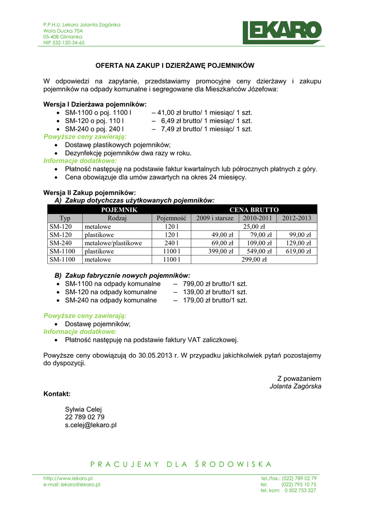 P.P.H.U. Lekaro Jolanta Zagórska Wola Ducka 70A 05-408 Glinianka NIP 532-120-34-65 OFERTA NA ZAKUP I DZIERŻAWĘ POJEMNIKÓW W odpowiedzi na zapytanie, przedstawiamy promocyjne ceny dzierżawy i zakupu pojemników na odpady komunalne i segregowane dla Mieszkańców Józefowa: Wersja I Dzierżawa pojemników: SM-1100 o poj. 1100 l – 41,00 zł brutto/ 1 miesiąc/ 1 szt. SM-120 o poj. 110 l – 6,49 zł brutto/ 1 miesiąc/ 1 szt. SM-240 o poj. 240 l – 7,49 zł brutto/ 1 miesiąc/ 1 szt. Powyższe ceny zawierają: Dostawę plastikowych pojemników; Dezynfekcję pojemników dwa razy w roku. Informacje dodatkowe: Płatność następuję na podstawie faktur kwartalnych lub półrocznych płatnych z góry. Cena obowiązuje dla umów zawartych na okres 24 miesięcy. Wersja II Zakup pojemników: A) Zakup dotychczas użytkowanych pojemników: POJEMNIK CENA BRUTTO Typ Rodzaj Pojemność 2009 i starsze 2010-2011 2012-2013 SM-120 metalowe 120 l 25,00 zł SM-120 plastikowe 120 l 49,00 zł 79,00 zł 99,00 zł SM-240 metalowe/plastikowe 240 l 69,00 zł 109,00 zł 129,00 zł SM-1100 plastikowe 1100 l 399,00 zł 549,00 zł 619,00 zł SM-1100 metalowe 1100 l 299,00 zł B) Zakup fabrycznie nowych pojemników: SM-1100 na odpady komunalne – 799,00 zł brutto/1 szt. SM-120 na odpady komunalne – 139,00 zł brutto/1 szt. SM-240 na odpady komunalne – 179,00 zł brutto/1 szt. Powyższe ceny zawierają: Dostawę pojemników; Informacje dodatkowe: Płatność następuję na podstawie faktury VAT zaliczkowej. Powyższe ceny obowiązują do 30.05.2013 r. W przypadku jakichkolwiek pytań pozostajemy do dyspozycji. Z poważaniem Jolanta Zagórska Kontakt: Sylwia Celej 22 789 02 79 [email protected] P R A C U J E M Y http://www.lekaro.pl e-mail: [email protected] D L A Ś R O D O WI S K A tel./fax.: (022) 789 02 79 tel. (022) 795 10 75 tel. kom 0 502 753 227