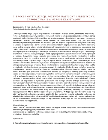 7. PROCES KRYSTALIZACJI. ROZTWÓR NASYCONY I PRZESYCONY. ZARODKOWANIE A WZROST KRYSZTAŁÓW Opracowanie: dr hab. inż. Jarosław Chojnacki Politechnika Gdańska, Gdańsk 2015 Ciała krystaliczne mogą ulegać rozpuszczaniu w cieczach i tworzyć z nimi jednorodne mieszaniny roztwory. Roztwór nazywamy nienasyconym, jeżeli można w nim jeszcze rozpuścić dodatkową porcję substancji stałej. Roztwór, który znajduje się w równowadze z kryształami, nazywamy roztworem nasyconym. Ważne, aby zdawać sobie sprawę, że utworzenie nowej fazy jest procesem niekorzystnym termodynamicznie. W związku z tym, np. poprzez rozpuszczanie dużej ilości substancji w wyższej temperaturze i bardzo wolne chłodzenie możemy doprowadzić do powstania roztworu, który będzie zawierał więcej substancji niż roztwór nasycony i mimo to pozostawał jednorodną fazą ciekłą. Taki roztwór nazywamy roztworem przesyconym. W przypadku oziębienia stopionej substancji poniżej temperatury krzepnięcia mówimy o roztworze przechłodzonym. Znanym z życia codziennego przykładem roztworu przesyconego jest miód, będący przede wszystkim roztworem cukrów prostych w wodzie. Oczywiście, każdy roztwór przesycony jest termodynamicznie niestabilny i będzie samorzutnie dążył do przejścia w roztwór nasycony poprzez wydzielenie nadmiaru substancji w postaci kryształów. Szybkość tego przejścia będzie jednak bardzo mała, jeśli zachowana jest duża czystość i nie ma tzw. zarodków krystalizacji. Przesyceniu sprzyja duża lepkość roztworu. Dodanie do takiego roztworu małego kryształu danej substancji (tzw. zaszczepianie kryształów) powoduje szybką krystalizację, aż do osiągnięcia stanu równowagi. Krystalizacja składa się więc z dwóch procesów: zarodkowania i wzrostu kryształów. Klasyczna teoria krystalizacji (Volmer i Weber, 1935 r.) mówi, że wzrost kryształu jest procesem samorzutnym dopiero po osiągnięciu pewnej granicznej wielkości klastra atomów(cząsteczek). Tworzenie kryształów o mniejszym rozmiarze nie jest samorzutne, gdyż zysk z połączenia cząstek w fazę stałą nie jest wystarczająco duży aby zrekompensować straty związane z wytworzeniem dużej powierzchni międzyfazowej (energia powierzchniowa). Klaster atomów lub cząsteczek o wymiarze granicznym, dla którego zmiana entalpii swobodnej G=0, nazywa się zarodkiem krystalizacji. Możemy mieć do czynienia z zarodkowaniem homogenicznym lub heterogenicznym. Zarodkowanie homogeniczne ma miejsce, gdy zarodek jest zbudowany z tej samej substancji, która będzie krystalizowała z roztworu. W przypadku, gdy substancja zacznie się wydzielać poprzez osadzanie na powierzchni innej substancji (tzw. podkładki) mówimy o zarodkowaniu heterogenicznym. Ma to bardzo często miejsce w praktyce. W tego typu zarodkowaniu dużą rolę odgrywa tzw. kąt zwilżania powierzchni podkładki. Gdy wynosi on zero, to podkładka zachowuje się właściwie jak duży zarodek, gdy wynosi 180° podkładka nie odgrywa żadnej roli i proces zachodzi tak, jak dla zarodkowania homogenicznego. Dla kąta zwilżania mniejszego od 180° uprzywilejowane jest zarodkowanie heterogeniczne. Materiały i sprzęt: Zlewki 100 cm3, zestaw probówek, wata, bibuła filtracyjna, zestaw do sączenia, termometr o zakresie pomiarowym obejmującym przedział od 10 do 120°C. Substancje do sporządzenia roztworu przesyconego, np. KNO3 100g; krystaliczny octan sodu 100g, krystaliczny tiosiarczan sodu 50g Wykonanie: 1. Roztwór nasycony i przesycony. Zarodkowanie heterogeniczne i zaszczepianie kryształów. Do kilku probówek wsypujemy, do około połowy wysokości, krystalicznego, uwodnionego octanu sodu CH3OCOONa·3H2O, zwilżamy kryształy za pomocą około 2 cm3 wody i ogrzewamy na łaźni wodnej (w zlewce z wodą) mieszając od czasu do czasu zawartość probówek, do całkowitego rozpuszczenia soli, co powinno nastąpić dla temperatury około 55-65°C. Probówki przestawiamy do statywu i pozostawiamy do ochłodzenia do temperatury pokojowej. Po ostudzeniu do roztworów wrzucamy po kilka małych kryształków substancji rozpuszczanej lub wybranej innej substancji i mierzymy temperaturę roztworu. Próbę powtórzyć stosując KNO3. 2. Ciecz przechłodzona jako roztwór przesycony. Zarodkowanie homogeniczne i heterogeniczne Do kilku probówek wsypujemy (około 1/3 wysokości) krystalicznego, uwodnionego tiosiarczanu sodu Na2S2O3·5H2O i ogrzewamy na łaźni wodnej (w zlewce z wodą) do całkowitego stopienia i niewielkiego przegrzania - do około 60-70°C. Jeśli w probówce rozpocznie się krystalizacja, to ponownie ogrzewamy do całkowitego roztopienia kryształów. Następnie probówki odstawiamy do ostygnięcia do temperatury pokojowej. Po ostygnięciu do pierwszej wrzucamy kryształek Na2S2O3·5H2O, drugą wstrząsamy i zanurzamy termometr, do kolejnych wrzucamy nieco np. żelu krzemionkowego, ziemi okrzemkowej, albo innej wybranej substancji. 3. Wpływ czystości roztworu na jakość otrzymywanych krystalitów. W zlewce odważamy 30-50g substancji stałej (np. KNO3) wskazanej przez prowadzącego i dolewamy taką samą ilość ml wody. Ogrzewamy całość do rozpuszczenia kryształów, mieszając roztwór. Rozpuszczenie powinno nastąpić dla temperatury około 55-65°C ale roztwór podgrzewamy dalej aż do początków wrzenia. Połowę roztworu przesączamy na gorąco do małej kolbki stożkowej. Po przesączeniu zawartość zlewki ponownie ogrzewamy do rozpuszczenia ewentualnych kryształów, zatykamy zwitkiem waty (dla ochrony przed kurzem) i odstawiamy do ostudzenia. Podobnie pozostawiamy do ochłodzenia nieprzesączony roztwór. Porównać wielkość i jakość kryształów wydzielonych z obu roztworów. Zadania: Wyjaśnij zaobserwowane zjawiska na podstawie danych odnośnie rozpuszczalności substancji w wodzie w różnych temperaturach, literaturowych diagramów fazowych oraz poznanej teorii. Literatura dodatkowa: E. Fraś, "Krystalizacja