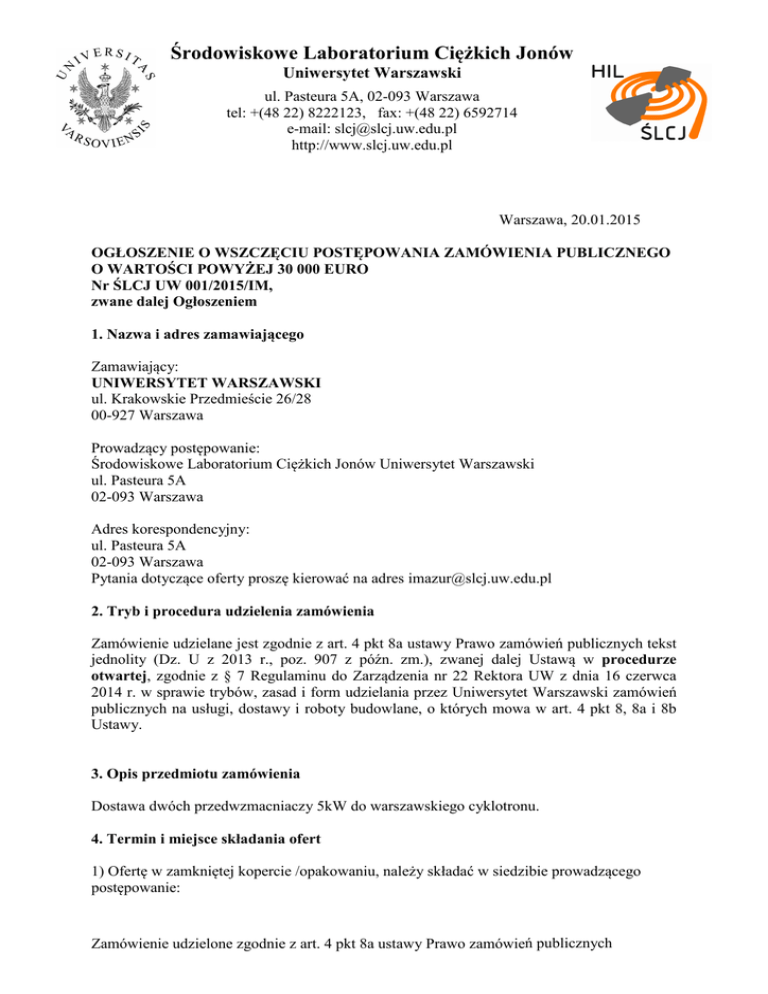 Środowiskowe Laboratorium Ciężkich Jonów Uniwersytet Warszawski ul. Pasteura 5A, 02-093 Warszawa tel: +(48 22) 8222123, fax: +(48 22) 6592714 e-mail: [email protected] http://www.slcj.uw.edu.pl Warszawa, 20.01.2015 OGŁOSZENIE O WSZCZĘCIU POSTĘPOWANIA ZAMÓWIENIA PUBLICZNEGO O WARTOŚCI POWYŻEJ 30 000 EURO Nr ŚLCJ UW 001/2015/IM, zwane dalej Ogłoszeniem 1. Nazwa i adres zamawiającego Zamawiający: UNIWERSYTET WARSZAWSKI ul. Krakowskie Przedmieście 26/28 00-927 Warszawa Prowadzący postępowanie: Środowiskowe Laboratorium Ciężkich Jonów Uniwersytet Warszawski ul. Pasteura 5A 02-093 Warszawa Adres korespondencyjny: ul. Pasteura 5A 02-093 Warszawa Pytania dotyczące oferty proszę kierować na adres [email protected] 2. Tryb i procedura udzielenia zamówienia Zamówienie udzielane jest zgodnie z art. 4 pkt 8a ustawy Prawo zamówień publicznych tekst jednolity (Dz. U z 2013 r., poz. 907 z późn. zm.), zwanej dalej Ustawą w procedurze otwartej, zgodnie z § 7 Regulaminu do Zarządzenia nr 22 Rektora UW z dnia 16 czerwca 2014 r. w sprawie trybów, zasad i form udzielania przez Uniwersytet Warszawski zamówień publicznych na usługi, dostawy i roboty budowlane, o których mowa w art. 4 pkt 8, 8a i 8b Ustawy. 3. Opis przedmiotu zamówienia Dostawa dwóch przedwzmacniaczy 5kW do warszawskiego cyklotronu. 4. Termin i miejsce składania ofert 1) Ofertę w zamkniętej kopercie /opakowaniu, należy składać w siedzibie prowadzącego postępowanie: Zamówienie udzielone zgodnie z art. 4 pkt 8a ustawy Prawo zamówień publicznych Środowiskowe Laboratorium Ciężkich Jonów Uniwersytet Warszawski ul. Pasteura 5A, 02-093 Warszawa tel: +(48 22) 8222123, fax: +(48 22) 6592714 e-mail: [email protected] http://www.slcj.uw.edu.pl Środowiskowe Laboratorium Ciężkich Jonów Uniwersytet Warszawski ul. Pasteura 5A 02-093 Warszawa 2) Ofertę należy złożyć nie później niż do dnia 19.02.2015r do godziny 12:00. 5. Sposób przygotowania ofert 1) Zaleca się, aby oferta była złożona na Formularzu ofertowym stanowiącym Załącznik nr 1 do Ogłoszenia. 2) Oferta musi zawierać wszystkie informacje wymagane w treści Ogłoszenia. 3) Oferta musi być podpisana przez osoby uprawnione do reprezentowania wykonawcy (podpisy i pieczęcie oryginalne, należy składać podpisy w sposób umożliwiający identyfikację podpisującego np. pieczęcie imienne). 6. Kryterium oceny i wyboru ofert Wykonawca usługi objętej niniejszym postępowaniem zostanie wybrany na podstawie kryterium: cena - 60 % gwarancja - 20 % szybkość usunięcia awarii - 20 % Procenty zostaną przeliczone w stosunku 1:1 1. Kryterium cena. 60 pkt otrzyma najniższa cena spośród przedstawionych ofert obliczona według następującego wzoru Pkt cena = cena oferty z najniższą ceną x 60 cena oferty badanej 2. Kryterium Gwarancja. 20 pkt otrzyma oferta sprzętu z najdłuższą gwarancją spośród przedstawionych ofert. okres gwarancji oferty badanej x20 najdłuższy okres gwarancji z ofert badanych 3. Kryterium szybkości usunięcia awarii uniemożliwiającej pracę przedmiotu zamówienia. 20 pkt otrzyma oferta z najkrótszym czasem usunięcia awarii. Pkt okres gwarancji = Zamówienie udzielone zgodnie z art. 4 pkt 8a ustawy Prawo zamówień publicznych Środowiskowe Laboratorium Ciężkich Jonów Uniwersytet Warszawski ul. Pasteura 5A, 02-093 Warszawa tel: +(48 22) 8222123, fax: +(48 22) 6592714 e-mail: [email protected] http://www.slcj.uw.edu.pl Pkt czas = czas usunięcia awarii oferty z najkrótszym czasem usunięci awarii x 20 czas usunięcia awarii oferty badanej Wynik ostateczny to suma trzech składowych W= cena + gwarancja +czas. Max liczba punktów do uzyskania to 100 pkt. W przypadku, gdy więcej niż jedna oferta uzyska tyle samo punktów na liście rankingowej ostatecznym kryterium wyboru oferty najkorzystniejszej będzie cena. 7. Termin wykonania zamówienia 1) Wymagany termin (okres) realizacji przedmiotu zamówienia: nie dłużej niż do 24.07.2015 r. 2) Oferty proponujące dłuższy termin zostaną odrzucone. 8. Warunki udziału w postępowaniu Warunkiem udziału Wykonawcy w postępowaniu jest posiadanie wiedzy i umiejętności niezbędnych do należytego wykonania przedmiotu zamówienia. Do formularz oferty Wykonawca złoży odpis z Krajowego Rejestru Sądowego (lub właściwego rejestru) wystawionego nie wcześniej niż 6 miesięcy przed upływem terminu składania ofert, 9. Informacje dotyczące wniesienia wadium i zabezpieczenia należytego wykonania umowy Zamawiający nie będzie żądał wniesienia wadium oraz zabezpieczenia należytego wykonania umowy. 10. Informacje o możliwości unieważnienia postępowania Zamawiający zastrzega sobie możliwość unieważnienia postępowania bez podania przyczyny. 11. Szczegółowy opis przedmiotu zamówienia Zamówienie udzielone zgodnie z art. 4 pkt 8a ustawy Prawo zamówień publicznych Środowiskowe Laboratorium Ciężkich Jonów Uniwersytet Warszawski ul. Pasteura 5A, 02-093 Warszawa tel: +(48 22) 8222123, fax: +(48 22) 6592714 e-mail: [email protected] http://www.slcj.uw.edu.pl Przedmiot zamówienia: I. Przedmiot dostawy: Dwa identyczne wzmacniacze mocy wysokiej częstotliwości, każdy zdolny do dostarczenia co najmniej 5 kW mocy w.cz. II. Szczegółowe wymagania i parametry przedmiotu dostawy: 1. Parametry wzmacniacza mocy a. Zakres częstotliwości pracy wzmacniaczy: 11 MHz do 20 MHz. b. Moc wyjściowa ciągła z obciążeniem 50: minimum 5 kW. c. Podłączenie wyjścia: koncentryczne, złącze typu N, lub uzgodnione z Kupującym. d. Poziom sygnału wejściowego przy nominalnej mocy wyjściowej: maksimum 1Vpp/50Ω. e. Podłączenie wejścia: złącze typu BNC (ew. inne uzgodnione z Kupującym). f. Impedancja wejściowa / wyjściowa: 50 omów +/- 10% w całym zakresie częstotliwości roboczych. g. Stopień mocy – lampa mocy wysokiej częstotliwości: Lampa powinna być łatwo dostępna na rynku europejskim, a konstrukcja wzmacniacza powinna umożliwiać j