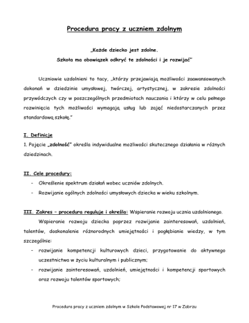 Procedura pracy z uczniem zdolnym „KaŜde dziecko jest zdolne. Szkoła ma obowiązek odkryć te zdolności i je rozwijać” Uczniowie uzdolnieni to tacy, „którzy przejawiają moŜliwości zaawansowanych dokonań w dziedzinie umysłowej, twórczej, artystycznej, w zakresie zdolności przywódczych czy w poszczególnych przedmiotach nauczania i którzy w celu pełnego rozwinięcia tych moŜliwości wymagają usług lub zajęć niedostarczanych przez standardową szkołę.” I. Definicje 1. Pojęcie „zdolność” określa indywidualne moŜliwości skutecznego działania w róŜnych dziedzinach. II. Cele procedury: - Określenie spektrum działań wobec uczniów zdolnych. - Rozwijanie ogólnych zdolności umysłowych dziecka w wieku szkolnym. III. Zakres – procedura reguluje i określa: Wspieranie rozwoju ucznia uzdolnionego. Wspieranie rozwoju dziecka poprzez rozwijanie zainteresowań, uzdolnień, talentów, doskonalenie róŜnorodnych umiejętności i pogłębianie wiedzy, w tym szczególnie: - rozwijanie kompetencji kulturowych dzieci, przygotowanie do aktywnego uczestnictwa w Ŝyciu kulturalnym i publicznym; - rozwijanie zainteresowań, uzdolnień, umiejętności i kompetencji sportowych oraz rozwoju talentów sportowych; Procedura pracy z uczniem zdolnym w Szkole Podstawowej nr 17 w Zabrzu - prowadzenie działań promujących twórczość dziecięcą oraz jednostki uzdolnionej; - działania alternatywne wykorzystujące kontakt ze szkołą, kulturą, wiedzą, nowoczesną technologią. IV. Osoby odpowiedzialne: - Wychowawcy - Pedagog szkolny - Nauczyciele przedmiotów - Dyrektor V. Opis działań: 1. Sposoby wyłaniania uczniów zdolnych: - nauczyciele, wychowawca i pedagog analizują osiągnięcia szkolne uczniów; - obserwacja uczniów przez wychowawcę i nauczycieli uczących danego przedmiotu; - kontakty z rodzicami dotyczące zainteresowań uczniów. 2. Wspieranie rozwoju ucznia zdolnego (działania szkoły): a) poznawanie ucznia i jego zainteresowań, mocnych stron, zdolności, b) w ocenie ucznia uwzględnianie nie tylko opanowanych wiadomości, ale i jego zainteresowań i twórczego zaangaŜowania, c) połoŜenie większego nacisku na myślenie twórcze niŜ odtwórcze, d) zachęcanie do twórczego rozwiązywania problemów, e) zaangaŜowanie uczniów zdolnych w prowadzenie lekcji, uczynienie ich asystentami nauczyciela, f) zachęcanie uczniów do wykonywania samodzielnych projektów związanych z ich zainteresowaniami, g) uczenie umiejętności planowania swojej pracy, Procedura pracy z uczniem zdolnym w Szkole Podstawowej nr 17 w Zabrzu h) inspirowanie uczniów do korzystania z rozmaitych zajęć pozalekcyjnych w celu rozwijania zainteresowań oraz aktywności poznawczej, i) organizowanie pracy w grupach uczniów zdolnych (np. kołach zainteresowań), j) zachęcanie do udziału w konkursach i olimpiadach, k) zindywidualizowanie nauczania ucznia zdolnego na lekcji, l) pomaganie w kształtowaniu pozytywnej samooceny, wzmacnianie wiary w swoje zdolności, wyraŜanie zadowolenia z sukcesów, m) uczenie przyjmowania uwag i radzenia sobie z niepowodzeniami. 3.Uczeń zdolny ma moŜliwość: a) rozwijania zainteresowań w ramach kół zainteresowań, b) uzyskania od nauczyciela pomocy w przygotowywaniu się do olimpiad przedmiotowych, konkursów szkolnych i pozaszkolnych, c) wykonywania zadań dodatkowych o podwyŜszonym stopniu trudności, d) pełnienie roli asystenta nauczyciela w trakcie zajęć, a) indywidualizacji pracy w toku zajęć – dostosowanie stopnia trudności, poziomu i ilości zadań na zajęciach i w domu. f) skorzystanie ze stypendium. VI. W pracy z uczniem zdolnym nauczyciel: - przydziela dodatkowe zadania do rozwiązania w czasie lekcji; - zadaje pewne problemy do rozwiązania na okres ferii lub wakacji; - układa systematycznie, na przykład raz w miesiącu, zestawy zadań z uwzględnieniem zasady stopniowania trudności; - stwarza sytuacje problemowe; - zachęca do samodzielnego układania zadań, rebusów, łamigłówek oraz zagadek; - zaleca opracowanie nowego materiału z podręcznika uczniom i referowanie go ich kolegom; - opracowuje materiał spoza podręcznika szkolnego przy uŜyciu np. tekstów programowych; Procedura pracy z uczniem zdolnym w Szkole Podstawowej nr 17 w Zabrzu - przekazuje uczniów słabych uczniom zdolnym pod opiekę stałą lub doraźną; - powierza przewodnictwo w grupach lekcyjnych oraz wdraŜa uczniów do roli asystenta; - informuje uczniów o nowych ksiąŜkach; - organizuje konkursy zadaniowe, zachęca do udziału w olimpiadach, turniejach. VII. Zadania szkoły. 1. Identyfikacja uczniów zdolnych. 2. Zdiagnozowanie rodzaju inteligencji. 3. Kierowanie rozwojem. 4. Motywowanie ucznia zdolnego. 5. Stworzenie warunków do optymalnego rozwoju intelektualnego, osobowościowego do samorealizacji. 6. Indywidualizacja nauczania. 7. Pomoc w rozwiązywaniu problemów emocjonalnych. 8. Pomoc merytoryczna, udostępnianie źródeł wiedzy. 9. Organizowanie zajęć pozalekcyjnych, kółek przedmiotowych i zainteresowań. 10. Wskazywanie form wypoczynku i relaksu. 11. Korzystanie z badań poradni psychologiczno – pedagogicznej. 12. RóŜnicowanie i poszerzanie programów nauczania. 13. Tworzenie programów autorskich. 14. Włączenie do współpracy instytucji działających na rzecz uczniów zdolnych (placówki specjalistyczne, ośrodki specjalistyczne, stowarzyszenia, fundacje); 15. Wspieranie twórczego i innowacyjnego myślenia; 16. Stosowanie profilaktyki problemów związanych z występowaniem wybitnych zdolności. VIII. Formy pracy z uczniem zdolnym: a) Praca indywidualna. Procedura pracy z uczniem zdolnym w Szkole Podstawowej nr 17 w Zabrzu b) Praca w grupach. c) Praca w parach. d) Przydzielanie uczniom zdolnym trudniejszych zadań podczas pracy grupowej lub indywidualnej. e) RóŜnicowanie stopnia trudności prac domowych i prac klasowych. f) Stopniowanie zwiększania wymagań. g) Przydzielanie uczniom zdolnym specjalnych ról: