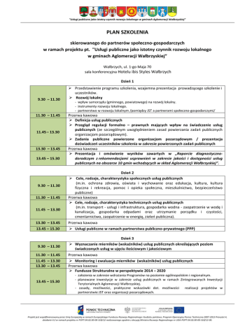 "Usługi publiczne jako istotny czynnik rozwoju lokalnego w gminach Aglomeracji Wałbrzyskiej” PLAN SZKOLENIA skierowanego do partnerów społeczno-gospodarczych w ramach projektu pt. "Usługi publiczne jako istotny czynnik rozwoju lokalnego w gminach Aglomeracji Wałbrzyskiej” Wałbrzych, ul. 1-go Maja 70 sala konferencyjna Hotelu ibis Styles Wałbrzych Dzień 1 9.30 – 11.30 11.30 – 11.45 11.45 – 13.30 13.30 – 13.45 13.45 – 15.30 9.30 – 11.30 11.30 – 11.45 11.45 – 13.30 Przedstawienie programu szkolenia, wzajemna prezentacja prowadzącego szkolenie i uczestników. Rozwój lokalny - wpływ samorządu (gminnego, powiatowego) na rozwój lokalny. - instrumenty rozwoju lokalnego. - partnerstwo w rozwoju lokalnym /pomiędzy JST a partnerami społeczno-gospodarczymi/ Przerwa kawowa Definicja usług publicznych Przegląd regulacji formalno – prawnych mających wpływ na świadczenie usług publicznych (ze szczególnym uwzględnieniem zasad powierzania zadań publicznych organizacjom pozarządowym). Zadania publiczne powierzone organizacjom pozarządowym / prezentacja doświadczeń uczestników szkolenia w zakresie powierzonych zadań publicznych Przerwa kawowa Prezentacja i omówienie wyników zawartych w „Raporcie diagnostycznodoradczym z rekomendacjami usprawnień w zakresie jakości i dostępności usług publicznych na obszarze 10 gmin wchodzących w skład Aglomeracji Wałbrzyskiej”. Dzień 2 Cele, rodzaje, charakterystyka społecznych usług publicznych (m.in. ochrona zdrowia, oświata i wychowanie oraz edukacja, kultura, kultura fizyczna i rekreacja, pomoc i opieka społeczna, mieszkalnictwo, bezpieczeństwo publiczne) Przerwa kawowa Cele, rodzaje, charakterystyka technicznych usług publicznych (m.in. transport - usługi i infrastruktura, gospodarka wodna - zaopatrzenie w wodę i kanalizacja, gospodarka odpadami oraz utrzymanie porządku i czystości, cmentarnictwo, zaopatrzenie w energię, zieleń publiczna). 13.30 – 13.45 Przerwa kawowa 13.45 – 15.30 Usługi publiczne w ramach partnerstwa publiczno-prywatnego (PPP) 9.30 – 11.30 Dzień 3 Wyznaczanie mierników (wskaźników) usług publicznych określających poziom świadczonych usług w ujęciu ilościowym i jakościowym 11.30 – 11.45 Przerwa kawowa 11.45 – 13.30 13.30 – 13.45 Monitoring i ewaluacja mierników (wskaźników) usług publicznych Przerwa kawowa Fundusze Strukturalne w perspektywie 2014 – 2020 13.45 – 15.30 - założenia w zakresie wdrażania Programów na poziomie ogólnopolskim i regionalnym. - planowane inwestycje w zakresie usług publicznych w ramach Zintegrowanych Inwestycji Terytorialnych Aglomeracji Wałbrzyskiej. - zasady, możliwości, praktyczne wskazówki dot. możliwości realizacji projektów w partnerstwie JST oraz organizacji pozarządowych. Projekt jest współfinansowany przez Unię Europejską w ramach Europejskiego Funduszu Rozwoju Regionalnego i budżetu państwa, Program Operacyjny Pomoc Techniczna 2007-2013 Priorytet 4, działanie 4.2 w ramach projektu nr POPT.04.02.00-00-318/12 realizowanego zgodnie z decyzją Ministra Rozwoju Regionalnego nr UDA-POPT.04.02.00-00-318/12-00.