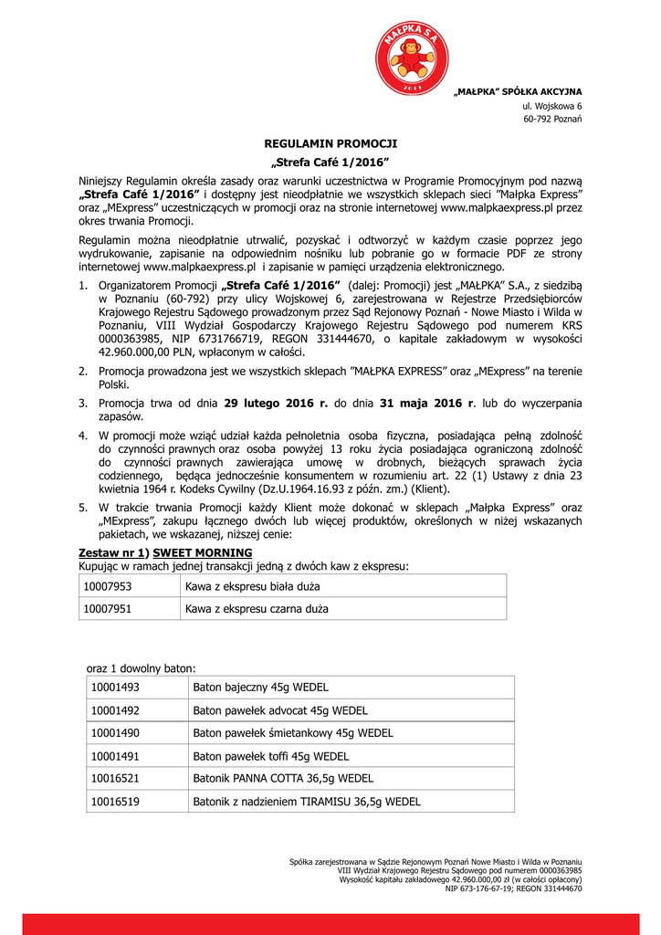 ! „MAŁPKA” SPÓŁKA AKCYJNA ul. Wojskowa 6 60-792 Poznań REGULAMIN PROMOCJI „Strefa Café 1/2016” Niniejszy Regulamin określa zasady oraz warunki uczestnictwa w Programie Promocyjnym pod nazwą „Strefa Café 1/2016” i dostępny jest nieodpłatnie we wszystkich sklepach sieci ”Małpka Express” oraz „MExpress” uczestniczących w promocji oraz na stronie internetowej www.malpkaexpress.pl przez okres trwania Promocji. Regulamin można nieodpłatnie utrwalić, pozyskać i odtworzyć w każdym czasie poprzez jego wydrukowanie, zapisanie na odpowiednim nośniku lub pobranie go w formacie PDF ze strony internetowej www.malpkaexpress.pl i zapisanie w pamięci urządzenia elektronicznego. 1. Organizatorem Promocji „Strefa Café 1/2016” (dalej: Promocji) jest „MAŁPKA” S.A., z siedzibą w Poznaniu (60-792) przy ulicy Wojskowej 6, zarejestrowana w Rejestrze Przedsiębiorców Krajowego Rejestru Sądowego prowadzonym przez Sąd Rejonowy Poznań - Nowe Miasto i Wilda w Poznaniu, VIII Wydział Gospodarczy Krajowego Rejestru Sądowego pod numerem KRS 0000363985, NIP 6731766719, REGON 331444670, o kapitale zakładowym w wysokości 42.960.000,00 PLN, wpłaconym w całości. 2. Promocja prowadzona jest we wszystkich sklepach ”MAŁPKA EXPRESS” oraz „MExpress” na terenie Polski. 3. Promocja trwa od dnia 29 lutego 2016 r. do dnia 31 maja 2016 r. lub do wyczerpania zapasów. 4. W promocji może wziąć udział każda pełnoletnia osoba fizyczna, posiadająca pełną zdolność do czynności prawnych oraz osoba powyżej 13 roku życia posiadająca ograniczoną zdolność do czynności prawnych zawierająca umowę w drobnych, bieżących sprawach życia codziennego, będąca jednocześnie konsumentem w rozumieniu art. 22 (1) Ustawy z dnia 23 kwietnia 1964 r. Kodeks Cywilny (Dz.U.1964.16.93 z późn. zm.) (Klient). 5. W trakcie trwania Promocji każdy Klient może dokonać w sklepach „Małpka Express” oraz „MExpress”, zakupu łącznego dwóch lub więcej produktów, określonych w niżej wskazanych pakietach, we wskazanej, niższej cenie: Zestaw nr 1) SWEET MORNING Kupując w ramach jednej transakcji jedną z dwóch kaw z ekspresu: 10007953 Kawa z ekspresu biała duża 10007951 Kawa z ekspresu czarna duża oraz 1 dowolny baton: 10001493 Baton bajeczny 45g WEDEL 10001492 Baton pawełek advocat 45g WEDEL 10001490 Baton pawełek śmietankowy 45g WEDEL 10001491 Baton pawełek toffi 45g WEDEL 10016521 Batonik PANNA COTTA 36,5g WEDEL 10016519 Batonik z nadzieniem TIRAMISU 36,5g WEDEL Spółka zarejestrowana w Sądzie Rejonowym Poznań Nowe Miasto i Wilda w Poznaniu VIII Wydział Krajowego Rejestru Sądowego pod numerem 0000363985 Wysokość kapitału zakładowego 42.960.000,00 zł (w całości opłacony) NIP 673-176-67-19; REGON 331444670 Strona 1 * z4 * ! „MAŁPKA” SPÓŁKA AKCYJNA ul. Wojskowa 6 60-792 Poznań Klient zobowiązany jest do zapłaty kwoty 2,99 zł brutto zamiast kwoty 3,98 zł brutto. Zestaw nr 2) HOT LION Kupując w ramach jednej transakcji 1 Hot-dog z parówką 10007946 Hot-dog parówka oraz 1 dowolny baton: 10000747 Baton Lion standard 43g NESTLE 10000756 Baton Lion white 43g NESTLE 10011120 Baton Lion peanut 40g NESTLE Klient zobowiązany jest do zapłaty kwoty 3,99 zł brutto zamiast kwoty 4,68 zł brutto. Zestaw nr 3) DREAM TEAM Kupując w ramach jednej transakcji 1 Hot-dog spośród trzech do wyboru 10007946 Hot dog parówka 10007943 Hot dog chili 10007944 Hot dog kabanos oraz 1 napój COCA COLA 0,2L 10012621 Napój Coca Cola 0,2L COCA COLA Klient zobowiązany jest do zapłaty kwoty 3,99 zł brutto zamiast kwoty 5,08 zł brutto. Zestaw nr 4) DREAM TEAM DE LUXE Kupując w ramach jednej transakcji 1 Hot-dog spośród trzech do wyboru 10007946 Hot dog parówka 10007943 Hot dog chili Spółka zarejestrowana w Sądzie Rejonowym Poznań Nowe Miasto i Wilda w Poznaniu VIII Wydział Krajowego Rejestru Sądowego pod numerem 0000363985 Wysokość kapitału zakładowego 42.960.000,00 zł (w całości opłacony) NIP 673-176-67-19; REGON 331444670 Strona 2 * z4 * ! „MAŁPKA” SPÓŁKA AKCYJNA ul. Wojskowa 6 60-792 Poznań 10007944 Hot dog kabanos 10001822 Napój Coca Cola 0,5L 10001830 Napój Fanta pomarańczowa 05L COCA COLA 10001868 Napój Sprite 0,5L COCA COLA 10001814 Napój Cherry Coke 0,5L COCA COLA 10001818 Napój Coca Cola Light 0,5L COCA COLA 10001829 Napój Coca Cola Zero 0,5L COCA COLA oraz 1 dowolny napój 0,5L Klient zobowiązany jest do zapłaty kwoty 4,99 zł brutto zamiast kwoty 7,18 zł brutto. Zestaw nr 5) BIG FOOD Kupując w ramach jednej transakcji 2 dowolne Hot-dogi 10007946 Hot dog parówka 10007943 Hot dog chili 10007944 Hot dog kabanos oraz 1 dowolny napój 0,5l 10001822 Napój Coca Cola 0,5L 10001830 Napój Fanta pomarańczowa 05L COCA COLA 10001868 Napój Sprite 0,5L COCA COLA 10001814 Napój Cherry Coke 0,5L COCA COLA 10001818 Napój Coca Cola Light 0,5L COCA COLA 10001829 Napój Coca Cola Zero 0,5L COCA COLA Spółka zarejestrowana w Sądzie Rejonowym Poznań Nowe Miasto i Wilda w Poznaniu VIII Wydział Krajowego Rejestru Sądowego pod numerem 0000363985 Wysokość kapitału zakładowego 42.960.000,00 zł (w całości opłacony) NIP 673-176-67-19; REGON 331444670 Strona 3 * z4 * ! „MAŁPKA” SPÓŁKA AKCYJNA ul. Wojskowa 6 60-792 Poznań Klient zobowiązany jest do zapłaty kwoty 7,99 zł brutto zamiast kwoty 10,67 zł brutto. 6. Klient może nabywać niezależnie wielokrotnie wszystkie z zestawów, pod warunkiem każdorazowego spełnienia warunków określonych niniejszym Regulaminem. 7. Udział w promocji jest dobrowolny. 8. Reklamacje dotyczące Promocji można zgłaszać pisemnie na adres: „MAŁPKA” S.A. ul. Wojskowa 6, 60-792 Poznań lub drogą elektroniczną na adres: [email protected] z dopiskiem w temacie wiadomości „Reklamacja – „Strefa Café SC/1/2016”. Reklamacje można zgłaszać w okresie trwania Promocji oraz w okresie 30 dni od dnia zakończenia Promocji. 9. Reklamacje Organizator rozpatruje niezwł