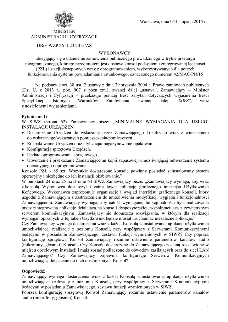 Warszawa, dnia 04 listopada 2015 r. MINISTER ADMINISTRACJI I CYFRYZACJI DBiF-WZP.2611.23.2015/AŚ WYKONAWCY ubiegający się o udzielenie zamówienia publicznego prowadzonego w trybie przetargu nieograniczonego, którego przedmiotem jest dostawa konsol podsystemu zintegrowanej łączności (PZŁ) i stacji dostępowych wraz z oprogramowaniem, wykorzystywanych dla potrzeb funkcjonowania systemu powiadamiania ratunkowego, oznaczonego numerem 42/MAC/PN/15 Na podstawie art. 38 ust. 2 ustawy z dnia 29 stycznia 2004 r. Prawo zamówień publicznych (Dz. U. z 2013 r., poz. 907 z późn zm.), zwanej dalej „ustawą”, Zamawiający – Minister Administracji i Cyfryzacji – przekazuje poniżej treść zapytań dotyczących wyjaśnienia treści Specyfikacji Istotnych Warunków Zamówienia, zwanej dalej „SIWZ”, wraz z udzielonymi wyjaśnieniami. Pytanie nr 1: W SIWZ (strona 62) Zamawiający pisze: ,,MINIMALNE WYMAGANIA DLA USŁUGI INSTALACJI URZĄDZEŃ Dostarczenie Urządzeń do wskazanej przez Zamawiającego Lokalizacji wraz z wniesieniem do wskazanego/wskazanych pomieszczenia/pomieszczeń. Rozpakowanie Urządzeń oraz utylizacja/magazynowanie opakowań. Konfiguracja sprzętowa Urządzeń. Update oprogramowania sprzętowego. Utworzenie i przekazanie Zamawiającemu kopii zapasowej, umożliwiającej odtworzenie systemu operacyjnego i oprogramowania. Konsole PZŁ - 85 szt. Wszystkie dostarczone konsole powinny posiadać zainstalowany system operacyjny i niezbędne do ich instalacji okablowanie.” W punktach 24 oraz 25 na stronie 64 SIWZ Zamawiający pisze: ,,Zamawiający wymaga, aby wraz z konsolą Wykonawca dostarczył i zainstalował aplikację graficznego interfejsu Użytkownika Końcowego. Wykonawca zaproponuje organizację i wygląd interfejsu graficznego konsoli, który uzgodni z Zamawiającym z zastrzeżeniem do umożliwienia modyfikacji wyglądu i funkcjonalności Zamawiającemu. Zamawiający wymaga, aby całość wymaganej funkcjonalności była realizowana przez zintegrowaną aplikację działającą na konsoli dyspozytorskiej, współpracującą z zewnętrznym serwerem komunikacyjnym. Zamawiający nie dopuszcza rozwiązania, w którym dla realizacji wymagań opisanych w tej tabeli Użytkownik będzie musiał uruchamiać niezależne aplikacje.” Czy Zamawiający wymaga dostarczenia wraz z każdą Konsolą zainstalowanej aplikacji użytkownika umożliwiającej realizację z poziomu Konsoli, przy współpracy z Serwerami Komunikacyjnymi będącymi w posiadaniu Zamawiającego, zestawu funkcji wymienionych w SIWZ? Czy poprzez konfigurację sprzętową Konsol Zamawiający rozumie ustawienie parametrów kanałów audio (mikrofony, głośniki) Konsol? Czy Konsole dostarczone do Zamawiającego zostaną rozstawione w miejscu docelowym instalacji i mają zostać podłączone do obwodów zasilających oraz do sieci LAN Zamawiającego? Czy Zamawiający zapewnia konfigurację Serwerów Komunikacyjnych umożliwiającą dołączenie do nich dostarczonych Konsol? Odpowiedź: Zamawiający wymaga dostarczenia wraz z każdą Konsolą zainstalowanej aplikacji użytkownika umożliwiającej realizację z poziomu Konsoli, przy współpracy z Serwerami Komunikacyjnymi będącymi w posiadaniu Zamawiającego, zestawu funkcji wymienionych w SIWZ. Poprzez konfigurację sprzętową Konsol Zamawiający rozumie ustawienie parametrów kanałów audio (mikrofony, głośniki) Konsol. 1 Konsole dostarczone do Zamawiającego zostaną rozstawione w miejscu docelowym instalacji i mają zostać podłączone do obwodów zasilających oraz do sieci LAN Zamawiającego. W konsekwencji Zamawiający dokonuje zmiany treści Załącznika nr 8 do SIWZ. Pytanie nr 2: „W Załączniku nr 2 do Umowy ,,Protokół odbioru Częściowego (Ilościowo - Jakościowy w lokalizacjach, wymagane jest ,,potwierdzenie zgodności jakości przyjmowanej dostawy/usługi z parametrami/funkcjonalnością zaoferowaną w ofercie”. Weryfikacja funkcjonalności możliwa jest jedynie po skonfigurowaniu Serwerów Komunikacyjnych oraz aplikacji na konsolach w zakresie wzajemnej współpracy tych elementów. Jak Zamawiający będzie weryfikował zgodność parametrów i funkcjonalności? Czy odbiór częściowy będzie poprzedzony testami funkcjonalności na każdym z obiektów, czy tylko na jednym - wybranym i wskazanym przez Zamawiającego? Jeśli tak, to czy zaproponowanie zakresu testów leży po stronie Wykonawcy?” Odpowiedź: Zamawiający będzie weryfikował zgodność parametrów i funkcjonalności poprzez przeprowadzenie testów funkcjonalności w każdej z lokalizacji, a w przypadku dostarczenia przez Wykonawcę oprogramowania tożsamego z obecnie wykorzystywanym, testy funkcjonalności będą pomijane. W konsekwencji Zamawiający dokonuje zmiany treści Załącznika nr 8 do SIWZ. Pytanie nr 3: „W Załączniku nr 2 do Umowy ,,Protokół Odbioru Częściowego (Ilościowo – Jakościowy w lokalizacjach, wymagane jest potwierdzenie świadczeń dodatkowych (instalacji). Czy w przypadku braku wskazanego miejsca docelowego instalacji w Lokalizacji oraz w przypadku braku infrastruktury (zasilanie, sieć LAN) umożliwiającej docelową instalację Konsol, Zamawiający uzna świadczenie dodatkowe (instalację) za wykonane zgodnie z Umową, gdy konfiguracja sprzętowa oraz działanie Konsol zostanie zweryfikowane na stanowisku testowym? Czy dla przypadku, gdy weryfikacja działania Konsol będzie możliwa jedynie na tymczasowym stanowisku testowym, Zamawiający zrezygnuje z wymogu utylizacji/magazynowania opakowań? Chodzi o przypadek, gdy po weryfikacji działania Konsoli, zostanie ona umieszczona, ze względów bezpieczeństwa, w oryginalnym opakowaniu.” Odpowiedź: W przypadku braku wskazanego miejsca docelowego instalacji w Lokalizacji oraz w przypadku braku infrastruktury (zasilanie, sieć LAN) umożliwiającej docelową instalację Konsol, Zamawiający uzna świadczenie dodatkowe (instalację) za wykonane zgodnie z Umową, gdy konfiguracja sprz