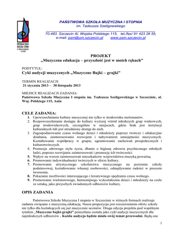 PAŃSTWOWA SZKOŁA MUZYCZNA I STOPNIA im. Tadeusza Szeligowskiego _____________________________________________________ 70-483 Szczecin Al. Wojska Polskiego 115, tel./fax/ 91 423 26 55, e-mail: [email protected] www.psm.szczecin.pl PROJEKT „Muzyczna edukacja – przyszłość jest w moich rękach” PODTYTUŁ: Cykl audycji muzycznych „Muzyczne Bajki – grajki” TERMIN REALIZACJI: 21 stycznia 2013 – 30 listopada 2013 MIEJSCE REALIZACJI ZADANIA: Państwowa Szkoła Muzyczna I stopnia im. Tadeusza Szeligowskiego w Szczecinie, al. Woj. Polskiego 115, Aula CELE ZADANIA: 1. Upowszechnianie kultury muzycznej nie tylko w środowisku melomanów. 2. Rozpowszechnianie dostępu do kultury wyższej wśród młodszych grup wiekowych, grup środowiskowych, szczególnie w miejscach, gdzie brak jest instytucji kulturalnych lub jest utrudniony dostęp do nich. 3. Zagospodarowanie czasu wolnego dzieci i młodzieży poprzez twórcze i edukacyjne działania, zainteresowanie rozwojem i nabywaniem umiejętności muzycznych. Kształtowanie współpracy w grupie, ugruntowanie zachowań prospołecznych i kulturotwórczych. 4. Promocja zdrowego stylu życia, dbanie o higienę zdrowia psychicznego młodych ludzi, poprzez rozwijanie zainteresowań i promocję ich twórczości. 5. Wpływ na wzrost zainteresowań mieszkańców województwa muzyką poważną. 6. Promowanie indywidualności twórczych w sferze kultury. 7. Promowanie artystycznego szkolnictwa muzycznego na poziomie szkoły podstawowej, kształtowanie własnej osobowości, odnajdywanie radości w procesie tworzenia. 8. Pokazanie możliwości interesującego i kreatywnego spędzania czasu wolnego. 9. Promowanie wielotorowego, harmonijnego wykształcenia dzieci i młodzieży na czele ze sztuką, jako przyszłych świadomych odbiorców kultury. OPIS ZADANIA Państwowa Szkoła Muzyczna I stopnia w Szczecinie w różnych formach realizuje zadania związane z muzyczną edukacją. Nasza propozycja jest rozszerzeniem oferty szkoły nie tylko dla kształcących się już muzycznie uczniów. Druga edycja projektu pod wspólnym tytułem „Muzyczne bajki-grajki” pomyślana została jako cykl audycji muzycznych dla najmłodszych odbiorców . Każda audycja będzie miała swój temat przewodni. Będą one 1 prowadzone przez zawodowych muzyków, mających duże doświadczenie w prowadzeniu lekcji muzycznych dla dzieci i młodzieży. Audycje skierowane są do dzieci najstarszych przedszkolnych grup wiekowych oraz do dzieci szkół podstawowych klas I-IV. W szczególności chcemy, by korzystały z nich dzieci z odleglejszych rejonów i dzielnic poza Szczecinem. Zdajemy sobie sprawę, że dostępność i uczestnictwo do dóbr kultury jest prostsze dla dzieci z centrum Szczecina. Dlatego też chcemy rozszerzyć nasz rejon działania, zapraszając do uczestnictwa w takich zajęciach dzieci mające utrudniony dostęp do instytucji kultury, również ze względów społecznych i ekonomicznych. Celem audycji jest rozbudzanie dziecięcej wyobraźni, przekazywanie piękna muzyki i wartości estetycznych poprzez dźwięki bajkowych melodii. W tym roku szkolnym także świętujemy jubileusz polskiego kompozytora i dlatego zapoznajemy uczniów z polską muzyką XX w. i współczesną. Punktem wyjścia jest zbliżająca się w 2013 roku, 200 rocznica urodzin Witolda Lutosławskiego. Fakt ten jest przyczynkiem do promocji polskiej muzyki współczesnej wśród dzieci i młodzieży, nie rozumianej a przez to nie słuchanej i nie znanej. Chcemy przełamać tę barierę i zaproponować część audycji o charakterze patriotycznym opartych na polskiej muzyce współczesnej z wykorzystaniem elementów kompozycji W. Lutosławskiego, także poprzez wplecenie weń tekstów prozy i poezji współczesnych autorów polskich. Temat Polski będzie pojawiał się przy świętach narodowych jako ich podkreślenie i zapoznanie najmłodszych słuchaczy z polską muzyką i elementami historii. Wzorem ubiegłego roku znajdą się wśród nich także podstawowe elementy wiedzy muzycznej, z wyjaśnieniem i opisem, wspólne muzykowanie i radosna twórczość akompaniowania. Całość projektu łączy odkrywanie i rozbudzanie pasji począwszy od najmłodszego człowieka, po dorosłe osoby. Muzycy będą opowiadać historie swoich pasji i będą próbować zaszczepić w dzieciach przekonanie, że przyszłość każdego z nas zależy od nas samych, a z pasją życiową łatwiej osiągnąć sukces. W prosty, przystępny i ciekawy sposób dzieci dowiadywać się będą o formach muzycznych, elementach dzieła muzycznego, instrumentach i zależnościach miedzy sobą. Wszystkie te informacje stanowią podstawowe wiadomości, niezbędne do dalszego poznawania tajemnic muzyki. Praktycznie będą pokazane możliwości poszczególnych instrumentów solo i w zespole. Proponujemy zróżnicowane instrumentarium począwszy od instrumentów dętych blaszanych(trąbki, puzon, waltornia, tuba) po szereg instrumentów smyczkowych i klawiszowych(fortepian, klawesyn, skrzypce, skrzypce barokowe, wiolonczela, altówka). Nie zabraknie także instrumentów perkusyjnych. Dobór repertuaru jest przemyślany szczególnie, by poprzez melodyjną, bajkową, ilustracyjną muzykę pokazać jak najwięcej szczegółów i zainteresować młodego słuchacza. A może uda się w nim zaszczepić pasję muzyczną, która pozostanie już na całe życie? Projekt ma na celu przybliżyć korzyści płynące z muzycznego – wszechstronnego i wielokierunkowego wykształcenia, a także zachęcić do profesjonalnej edukacji artystycznej w dziedzinie muzyki i gry na wybranym instrumencie. HARMONOGRAM ZADANIA: Etap I 1. 12.02.2013 r. godz. 10:00 i 11:30 Muzyczne Bajki – Grajki część I „Ostatkowe taneczne szaleństwa” 2. 04.03.2013 r. godz. 10:00 i 11:30 Muzyczne Bajki – Grajki część II „Obudźmy wiosnę” 3. 25.03.2013 r. godz. 10:00 i 11:30 Muzyczne Bajki – Grajki część III „Czy znasz rodzinę smyczkową?” 2 Etap II
