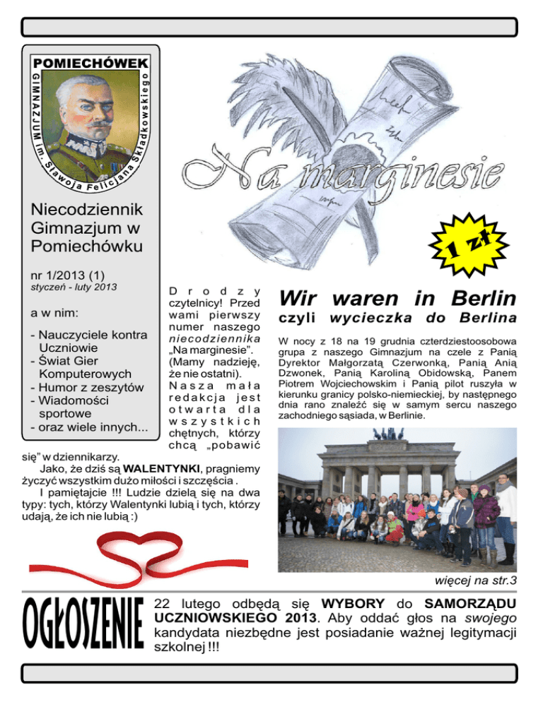 Niecodziennik Gimnazjum w Pomiechówku ł 1z nr 1/2013 (1) styczeń - luty 2013 a w nim: - Nauczyciele kontra Uczniowie - Świat Gier Komputerowych - Humor z zeszytów - Wiadomości sportowe - oraz wiele innych... D r o d z y czytelnicy! Przed wami pierwszy numer naszego niecodziennika „Na marginesie”. (Mamy nadzieję, że nie ostatni). Nasza mała redakcja jest otwarta dla wszystkich chętnych, którzy chcą „pobawić Wir waren in Berlin czyli wycieczka do Berlina W nocy z 18 na 19 grudnia czterdziestoosobowa grupa z naszego Gimnazjum na czele z Panią Dyrektor Małgorzatą Czerwonką, Panią Anią Dzwonek, Panią Karoliną Obidowską, Panem Piotrem Wojciechowskim i Panią pilot ruszyła w kierunku granicy polsko-niemieckiej, by następnego dnia rano znaleźć się w samym sercu naszego zachodniego sąsiada, w Berlinie. się” w dziennikarzy. Jako, że dziś są WALENTYNKI, pragniemy życzyć wszystkim dużo miłości i szczęścia . I pamiętajcie !!! Ludzie dzielą się na dwa typy: tych, którzy Walentynki lubią i tych, którzy udają, że ich nie lubią :) więcej na str.3 OGŁOSZENIE 22 lutego odbędą się WYBORY do SAMORZĄDU UCZNIOWSKIEGO 2013. Aby oddać głos na swojego kandydata niezbędne jest posiadanie ważnej legitymacji szkolnej !!! „Na Marginesie” Plany SAMORZĄDOWE na luty: - IV Szkolny Turniej Szachowy - Poczta walentynkowa klasa IIID - Kampania wyborcza i wybory do Samorządu Większość osób uważa, że muzyka kształtuje charakter. Muzyka może uspakajać i wyciszać, łagodzić napięcie, ale też może wpływać negatywnie, wywoływać w nas agresję. Ankietowani przeważnie muzyki słuchają w domu ale też na dworze i w miejscach publicznych mało kto słucha muzyki podczas jazdy np.: autobusem. Znaczna większość osób ankietowanych słucha muzyki niezależnie od uczuć. nr 1/2013 (1) W dniach 26.11. – 7.12 Samorząd Uczniowski w ramach akcji „Szlachetna Paczka” zorganizował zbiórkę żywności, środków czyszczących i przyborów szkolnych dla potrzebującej r o d z i n y z g m i n y Pomiechówek. Akcję zainicjowała i nadzorowała uczennica klasy IIIB – Emilia Żułtak z pomocą Bartosza Pierzchały (IIIA) i S a m o r z ą d u U c z n i o w s k i e g o . Ku naszemu wielkiemu zaskoczeniu do akcji włączyło się bardzo dużo osób nie tylko z naszego Gimnazjum, ale też Szkoły Podstawowej. W piątek, 7 grudnia, uczniowie posortowali i spakowali zebrane przedmioty, przygotowując 20 (!!!) ś w i ą t e c z n y c h p a c z e k . W niedzielę 9 grudnia, zawieźliśmy „nasze prezenty” do magazynu Świątecznej Paczki, skąd zostały dostarczone potrzebującej rodzinie. Wszystkim, którzy wspomogli naszą akcję „SZLACHETNEJ PACZKI” BARDZO DZIĘKUJEMY „Więcej niż 4 godzinny dziennie” taką odpowiedź udzieliło 2/3 spośród osób, które brały udział w ankiecie, odpowiadając na pytanie: „Ile dziennie poświęcasz czasu na słuchanie muzyki?”. Ankieta wykazała, że 82% osób biorących udział w niej nie mogłaby żyć bez muzyki. UWAGA !!! Listy do redakcji, propozycje artykułów i ciekawe zdjęcia obrazujące życie naszej Szkoły prosimy o przesyłanie na adres: [email protected] bądź składanie do Redaktora Naczelnego. Redakcja redaktor naczelny: Kamil Bonas, redakcja: Patrycja Przybylska, Agata Jakimiak, Natalia Szafrańska, Patrycja Oziemblewska, Karolina Orzechowska, Weronika Banach, Tomasz Klik, Gabriela Rolewska, Katarzyna Zyzek, Nina Bany, Natalia Moczydłowska, Sylwia Wawrzyńczak autor logo: Natalia Szczesna, opiekunowie: Barbara Więcław i Leszek Gałężewski nr 1/2013 (1) „Na Marginesie” Upiekło się nam! 12.12.12r. - taki dzień nie zdarza się często! Właśnie wtedy odbył się konkurs kulinarny w miejscowości o apetycznej nazwie Golądkowo. Tematem zawodów była „Najciekawsza potrawa wigilijna”. Jako główny składnik wybrano rybę. Nasze gimnazjum reprezentowali następujący mistrzowie rondla: Mateusz Cychowski, Katarzyna Zyzek oraz Patryk Morawski - wszyscy z klasy IIc. Do tego konkursu zgłosiła nas pani Joanna Chmielewska, która nie wątpiła w nasze możliwości kulinarne. Transportem zajęła się pani Małgorzata Menich- nasz dobry duszek. Spotkaliśmy się całą czwórką przed szkołą i w dobrych nastrojach wyjechaliśmy o 8.10. Gdy dotarliśmy do Golądkowa, była 9.00. Musieliśmy czekać do 10.00, ponieważ konkurs dopiero wtedy się zaczynał. Czas zleciał nam szybko, ponieważ gospodarze mile przywitali nas ciepłą herbatką i ciastkami. Niedługo po naszym przyjeździe pojawili się rywale. Mimo iż mieliśmy z nimi konkurować, bardzo szybko się zaprzyjaźniliśmy. Chwilę przed godziną 10.00 poproszono nas do Sali konferencyjnej. Zostaliśmy tam serdecznie powitani, przedstawion o nam zasady konkursu , poproszono o w y b ó r kapitanów drużyn oraz wylosowanie numerów stanowiska. Gdy udaliśmy się już na s w o j e miejsca, zaczęliśmy pracę. Noże, miksery, patelnie poszły w ruch. Po dwóch godzinach wyjęliśmy z piecyka nasze dzieło: wędzoną rybę w cieście drożdżowym. Podaliśmy je jury, które oceniło naszą ciężką, ale solidną robotę. Sędziowie byli zdziwieni talentem każdej z grup. Po jakimś czasie zostaliśmy poproszeni do Sali, w której ogłoszono wyniki. Okazało się, że nasza grupa zajęła czwarte miejsce! To, co prawda, nie podium, ale byliśmy zadowoleni z siebie i z tego, co zrobiliśmy. Nagrodą był: pendrive 4GB i kalendarz. Cudownie się bawiliśmy. Mogę nawet stwierdzić, że czuliśmy się prawdziwymi MasterChefami. Katarzyna Zyzek (klasa IIC) Wir waren in Berlin czyli wycieczka do Berlina dokończenie ze str.1 Pierwszym punktem wycieczki było najbardziej oblegane miejsce tej stolicy, Brama Brandenburska. Zgodnie z planem następnie zobaczyliśmy Reichstag, miejsce obrad niemieckiego rządu. Ze względu na bardzo gęste mgły, które zaścielały wówczas niebo nie udało się nam podziwiać widoków z Wie