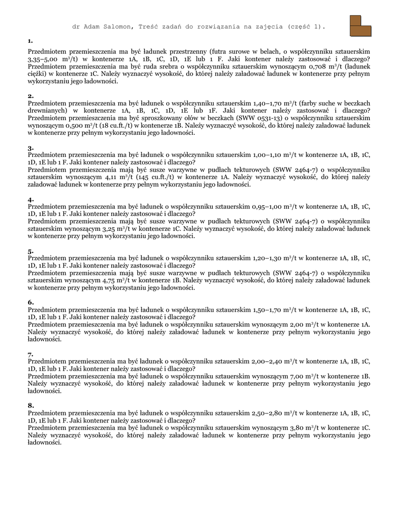 dr Adam Salomon, Treść zadań do rozwiązania na zajęcia (część 1). 1. Przedmiotem przemieszczenia ma być ładunek przestrzenny (futra surowe w belach, o współczynniku sztauerskim 3,35–5,00 m3/t) w kontenerze 1A, 1B, 1C, 1D, 1E lub 1 F. Jaki kontener należy zastosować i dlaczego? Przedmiotem przemieszczenia ma być ruda srebra o współczynniku sztauerskim wynoszącym 0,708 m3/t (ładunek ciężki) w kontenerze 1C. Należy wyznaczyć wysokość, do której należy załadować ładunek w kontenerze przy pełnym wykorzystaniu jego ładowności. 2. Przedmiotem przemieszczenia ma być ładunek o współczynniku sztauerskim 1,40–1,70 m3/t (farby suche w beczkach drewnianych) w kontenerze 1A, 1B, 1C, 1D, 1E lub 1F. Jaki kontener należy zastosować i dlaczego? Przedmiotem przemieszczenia ma być sproszkowany ołów w beczkach (SWW 0531-13) o współczynniku sztauerskim wynoszącym 0,500 m3/t (18 cu.ft./t) w kontenerze 1B. Należy wyznaczyć wysokość, do której należy załadować ładunek w kontenerze przy pełnym wykorzystaniu jego ładowności. 3. Przedmiotem przemieszczenia ma być ładunek o współczynniku sztauerskim 1,00–1,10 m3/t w kontenerze 1A, 1B, 1C, 1D, 1E lub 1 F. Jaki kontener należy zastosować i dlaczego? Przedmiotem przemieszczenia mają być susze warzywne w pudłach tekturowych (SWW 2464-7) o współczynniku sztauerskim wynoszącym 4,11 m3/t (145 cu.ft./t) w kontenerze 1A. Należy wyznaczyć wysokość, do której należy załadować ładunek w kontenerze przy pełnym wykorzystaniu jego ładowności. 4. Przedmiotem przemieszczenia ma być ładunek o współczynniku sztauerskim 0,95–1,00 m 3/t w kontenerze 1A, 1B, 1C, 1D, 1E lub 1 F. Jaki kontener należy zastosować i dlaczego? Przedmiotem przemieszczenia mają być susze warzywne w pudłach tekturowych (SWW 2464-7) o współczynniku sztauerskim wynoszącym 3,25 m3/t w kontenerze 1C. Należy wyznaczyć wysokość, do której należy załadować ładunek w kontenerze przy pełnym wykorzystaniu jego ładowności. 5. Przedmiotem przemieszczenia ma być ładunek o współczynniku sztauerskim 1,20–1,30 m3/t w kontenerze 1A, 1B, 1C, 1D, 1E lub 1 F. Jaki kontener należy zastosować i dlaczego? Przedmiotem przemieszczenia mają być susze warzywne w pudłach tekturowych (SWW 2464-7) o współczynniku sztauerskim wynoszącym 4,75 m3/t w kontenerze 1B. Należy wyznaczyć wysokość, do której należy załadować ładunek w kontenerze przy pełnym wykorzystaniu jego ładowności. 6. Przedmiotem przemieszczenia ma być ładunek o współczynniku sztauerskim 1,50–1,70 m3/t w kontenerze 1A, 1B, 1C, 1D, 1E lub 1 F. Jaki kontener należy zastosować i dlaczego? Przedmiotem przemieszczenia ma być ładunek o współczynniku sztauerskim wynoszącym 2,00 m 3/t w kontenerze 1A. Należy wyznaczyć wysokość, do której należy załadować ładunek w kontenerze przy pełnym wykorzystaniu jego ładowności. 7. Przedmiotem przemieszczenia ma być ładunek o współczynniku sztauerskim 2,00–2,40 m3/t w kontenerze 1A, 1B, 1C, 1D, 1E lub 1 F. Jaki kontener należy zastosować i dlaczego? Przedmiotem przemieszczenia ma być ładunek o współczynniku sztauerskim wynoszącym 7,00 m 3/t w kontenerze 1B. Należy wyznaczyć wysokość, do której należy załadować ładunek w kontenerze przy pełnym wykorzystaniu jego ładowności. 8. Przedmiotem przemieszczenia ma być ładunek o współczynniku sztauerskim 2,50–2,80 m3/t w kontenerze 1A, 1B, 1C, 1D, 1E lub 1 F. Jaki kontener należy zastosować i dlaczego? Przedmiotem przemieszczenia ma być ładunek o współczynniku sztauerskim wynoszącym 3,80 m 3/t w kontenerze 1C. Należy wyznaczyć wysokość, do której należy załadować ładunek w kontenerze przy pełnym wykorzystaniu jego ładowności. dr Adam Salomon, Treść zadań do rozwiązania na zajęcia (część 1). 9. Przedmiotem przemieszczenia ma być ładunek o współczynniku sztauerskim 2,20–2,45 m3/t w kontenerze 1A, 1B, 1C, 1D, 1E lub 1 F. Jaki kontener należy zastosować i dlaczego? Przedmiotem przemieszczenia ma być ładunek o współczynniku sztauerskim wynoszącym 5,75 m3/t w kontenerze 1B. Należy wyznaczyć wysokość, do której należy załadować ładunek w kontenerze przy pełnym wykorzystaniu jego ładowności. 10. Przedmiotem przemieszczenia ma być ładunek o współczynniku sztauerskim 1,60–1,90 m 3/t w kontenerze 1A, 1B, 1C, 1D, 1E lub 1 F. Jaki kontener należy zastosować i dlaczego? Przedmiotem przemieszczenia ma być ładunek o współczynniku sztauerskim wynoszącym 11,00 m3/t w kontenerze 1A. Należy wyznaczyć wysokość, do której należy załadować ładunek w kontenerze przy pełnym wykorzystaniu jego ładowności. 11. Przedmiotem przemieszczenia ma być ładunek o współczynniku sztauerskim 2,80–2,90 m 3/t w kontenerze 1A, 1B, 1C, 1D, 1E lub 1 F. Jaki kontener należy zastosować i dlaczego? Przedmiotem przemieszczenia ma być ładunek o współczynniku sztauerskim wynoszącym 3,18 m3/t w kontenerze 1C. Należy wyznaczyć wysokość, do której należy załadować ładunek w kontenerze przy pełnym wykorzystaniu jego ładowności. 12. Przedmiotem przemieszczenia ma być ładunek o współczynniku sztauerskim 2,00–3,00 m 3/t w kontenerze 1A, 1B, 1C, 1D, 1E lub 1 F. Jaki kontener należy zastosować i dlaczego? Przedmiotem przemieszczenia ma być ładunek o współczynniku sztauerskim wynoszącym 12,00 m 3/t w kontenerze 1D. Należy wyznaczyć wysokość, do której należy załadować ładunek w kontenerze przy pełnym wykorzystaniu jego ładowności. 13. Przedmiotem przemieszczenia ma być ładunek o współczynniku sztauerskim 5,00–5,40 m3/t w kontenerze 1A, 1B, 1C, 1D, 1E lub 1 F. Jaki kontener należy zastosować i dlaczego? Przedmiotem przemieszczenia ma być ładunek o współczynniku sztauerskim wynoszącym 5,00 m3/t w kontenerze 1E. Należy wyznaczyć wysokość, do której należy załadować ładunek w kontenerze przy pełnym wykorzystaniu jego ładowności. 1