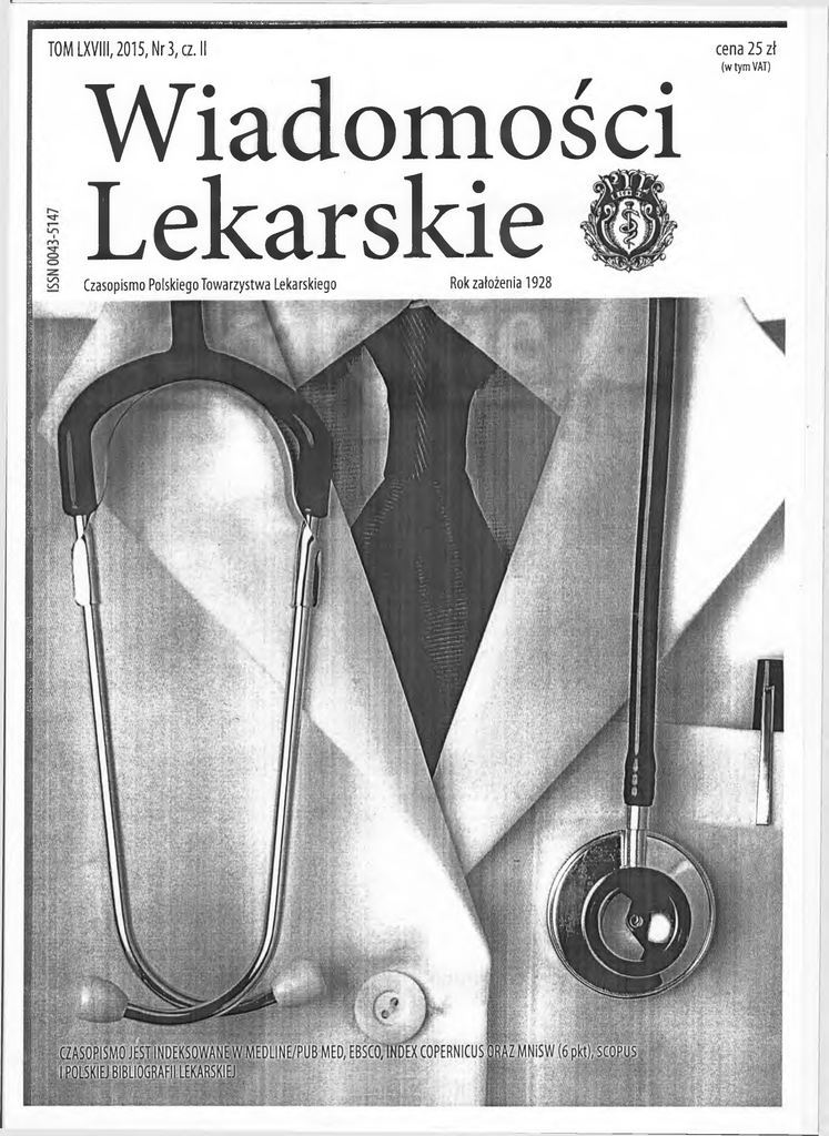 cena 2 5 1\ TOM L M , 2015,Nr 3 ,a . Il & Wiadomosci Lekarskie Czasopismo Polskiego Towarzystwa Lekarskiego Rok zatozenia 1928 (wtymVAT) Wiadomosci Lekarskie Czasopismo Polskiego Towarzystwa Lekarskiego TOM LXVIII, 2015, Nr3 cz. II Pamiçci dra Wtadystawa Bieganskiego Rok zatozenia 1928 Aluna Publishing Wiadomosci Lekarskie Redaktor naczeiny Prof. dr hab. med. Wladyslaw Pierzchala (SUM Katowice) ZastQpca redaktora naczelnego Prof. zw. dr hab. med. Aleksander Sierori (SUM Katowice) Redaktor wydania Prof. dr hab. Maria Majdan (Uniwersytet Medyczny, Lublin) Redaktor statystyczny Mgr Ewa Guterman Rada naukowa R e d a kto rzy te m a ty c z n i: C hiru rgia Prof. dr hab. med. Krzysztof Bielecki (CMKP Warszawa) Prof. dr hab. med. Stanislav Czudek (Onkologickie Centrum J.G. Mendla Czechy) Prof. dr hab. med. Marek Rudnicki (University of Illinois USA) C horoby w ew nq trzn e P ed ia trio Prof. dr hab. med. Ewa Malecka-Tendera (SUM Katowice) Dr hab. med. Tomasz Szczepariski (SUM Katowice) P o fo zn ictw o i g in e k o lo g ia Prof. dr hab. med. Jan Kotarski (UM Lublin) Prof. dr hab. med. Andrzej Witek (SUM Katowice) Stomatologia Prof. dr hab. Maria Kleinrok (UM Lublin) PolskieTowarzystwo Lekarskie Prof. dr hab. med. Jerzy Woy-Wojciechowski (Prezes PTL) Prof. emerytowany dr hab. med. Tadeusz Petelenz (O. Katowicki PTL) Kontakt z redakcjq i wydawnictwem Anna Luczyriska [email protected] www.wiadomoscilekarskie.pl Prof. dr hab. med. Ryszarda Chazan, pneumonologia i alergologia Wydawca (UM Warszawa) Wydawnictwo Aluna Prof. dr hab. med. Jacek Dubiel, kardiologia ul. Przesmyckiego 29 (CM Ul Krakow) 05-510 Konstancin-Jeziorna Prof. dr hab. med. Zbigniew G^sior, kardiologia www. alun a. waw.pl (SUM Katowice) Prof. dr hab. med. Marek Hartleb, gastroenterologia Koordynator projektu (SUM Katowice) Agnieszka Rosa Prof. dr hab. med. Jerzy Korewicki, kardiologia tel. 694 778 068 (Instytut Kardiologii Warszawa) [email protected] Dr hab. med. Krzysztof Labuzek, farmakologia kliniczna, diabetologia (SUM Katowice) Prof. dr hab. med. Tadeusz Plusa, pneumonologia i alergologia Prenumerata [email protected] (WIM Warszawa) www.wiadomoscilekarskie.pl/prenumerata Dr hab. med. Antoni Wystrychowski, nefrologia Opracowanie graficzne (SUM Katowice) Piotr Dobrzyriski (www.poligrafia.nets.pl) C horoby zako zn e Prof. dr hab. med. Andrzej Gladysz Naklad do 6 tys. egz (UM Wroclaw) E p id e m io lo g ia Prof. dr hab. med. Jan Zejda (SUM Katowice) N e u ro lo g io i n e u ro c h iru rg ia © Copyright by Aluna Publishing Wydanie czasopisma Wiadomosci Lekarskie w formie papierowej jest wersj^ pierwotn^ (referencyjn^). Redakcja wdraza procedure zabezpieczaj^ca oryginalnosc prac naukowych oraz przestrzega zasad recenzowania zgodnie z wytycznymi Ministerstwa Nauki i Szkolnictwa Wyzszego. Prof. dr hab. med. Henryk Majchrzak, neurochirurgia (SUM Katowice) Prof. dr hab. med. Krystyna Pierzchala, neurologia (SUM Katowice) i Czasopismo indeksowane w: PubMed/Medline, EBSCO, MNISW (6 pkt), Index Copernicus, PBL, Scopus S SPISTRESCI/CONTENTS PRACE ORYGINALNE/ORYGINAL PAPERS Морозова О.Г., Ярошевский A.A., Липинская Я.В. Особенности течения вегетативной дисфункции при миофасциальных болевых синдромах шейно-плечевоай локализации Features of autonomic dysfunction in myofascial pain syndromes cervkobrachial localization 335 Beata tabuz-Roszak, Sylwia Pyrtek, Katarzyna Adamczyk, Julia Janiszewska, Aleksandra Kazimierczak, Mateusz Pawtowski, Monika Adamczyk-Sowa, Agnieszka Machowska-Majchrzak, Iwona Marika-Gaca, Katarzyna Kubicka-B^czyk, Pawei Dobrakowski, Maciej Horyniecki, Krystyna Pierzchata Psychometryczna i neurofizjologiczna ocena funkcji poznawczych u chorych na padaczk? Psychometric and neurophysiologkal assessment of cognitive functions m patients with epilepsy 341 Natalia Pitacik, Teresa Kaminska, Ewa Augustynowicz-Kopec, Grzegorz Krasowski Etiologia zakazeri bakteryjnych oraz wyst^powanie chorob towarzyszqcych w przebiegu gruzlicy u chorych leczonych w Mazowieckim Centrum Leczenia Chorob Ptuc i Gruzlicy w latach 2012-2014 Etiology of bacterial infections and Incidence of comorbidities in patients with tuberculosis, treated in Mazovian Treatment Centre of Tuberculosis and Lung Diseases during years 2012*2014 347 B.H. Ждан, E.M. Китура, М.Ю. Бабанина, Г.С. Хайменова, Г.В. Волченко, М.В. Ткаченко Альтернативное направление терапии у больных ХОЗЛ при сочетании с остеоартритом Alternative therapy area in patients w ith COPD when combined w ith osteoarthritis 354 PRACE POGL^DOWE/REVIEW ARTICLES Malgorzata Klichowska-Palonka, Katarzyna Zaf?ska-Chromiriska, Teresa Bachanek Mozliwosc zastosowania sliny jako materiatu do badari diagnostycznych w chorobach uktadu sercowo-naczyniowego Possibility of using saliva as a diagnostic test material m cardiovascular diseases 358 Lilianna Sokotowska, Wiesfawa Bylka Bacopa monnieri - dziatanie i zastosowanie w lecznictwie Bacopa monnieri - activity and applications in medicine 362 Magdalena Piegza, Piotr Scisto, Karina Badura - Brzoza, Robert Pudlo, tukasz Kunert, Piotr W. Gorczyca Hipochondria wczoraj i dzis Hypochondria yesterday and today 367 Robert Krysiak, Agnieszka K§dzia, Boguslaw Okopien Choroby przysadki u osob w wieku podesztym Pituitary disorders in elderly patients 372 Tadeusz M Zielonka, Malgorzata Hadzik-Btaszczyk Niedozywienie w przewlektych chorobach uktadu oddechowego Undernutrltion In chronic respiratory diseases 385 Magdalena Pierzyna, Magdalena Twardoch, Bogdan Mazur Starzenie si? ukladu immunologicznego The aging o f the immune system 392 Robert Krysiak, Agnieszka Kfdzia, Bogustaw Okopien Zespot Nelsona Nelson's Synitmm 1 i 397 Spis tresci OPISY PRZYPADKÖW/CASE REPORTS Maciej Pliszkiewicz, B. PawelSiekierski, Monika Pliszkiewicz Izoiowana en