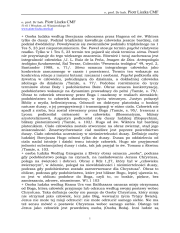 o. prof. Dr hab. Piotr Liszka CMF o. prof. Dr hab. Piotr Liszka CMF 51-611 Wrocław, ul. Wieniawskiego 38 www.piotr-liszka.strefa.pl + Osoba ludzka według Boecjusza odnoszona przez Hugona od św. Wiktora tylko do duszy. Podział trójdzielny kawałkuje człowieka jeszcze bardziej, niż podział dwódzielny. Powoływanie się zwolenników podziału trójdzielnego na 1 Tes 5, 23 jest nieporozumieniem. Św. Paweł stosuje termin psyché relatywnie rzadko. Tylko w 1 Tes 5, 23 termin ten pojawił się obok terminu sôma. Paweł nie przywiązuje do tego większego znaczenia. Również i tutaj zachowana jest integralność człowieka /J. L. Ruiz de la Peña, Imagen de Dios. Antropología teológica fundamental, Sal Terrae, Colección “Presencia teológica” 49, wyd. 2, Santander 1988, s. 71/. Sôma oznacza integralnego człowieka jako konkretnie zanurzonego w czasie i przestrzeni. Termin ten wskazuje na konkretną relacje z innymi bytami: rzeczami i osobami. Psyché podkreśla siłę żywotną w człowieku, pobudzającą do działania, a dokładniej człowieka zdolnego do działania /Tamże, s. 77/. Podobne rozróżnienie do tyczy terminów obraz Boży i podobieństwo Boże. Obraz oznacza konkretyzację, podobieństwo wskazuje na dynamizm prowadzący do pełni /Tamże, s. 79/. Obraz to człowiek stworzony przez Boga i osadzony w realiach ziemskich; podobieństwo to człowiek zbawiony, w życiu wiecznym. Justyn połączył Biblię z myślą hellenistyczną. Odrzucił on doktrynę platońską o boskiej naturze duszy, o jej preegzystencji i transmigracji w różne ciała. Człowiek nie spadł z nieba, lecz został stworzony przez Boga /Tamże, s. 95/. Ireneusz z Lyonu podkreślał cielesność w człowieku (filosomatyzm, bliższy arystotelizmowi), Augustyn podkreślał rolę duszy ludzkiej (filopsychizm, bliższy platonizmowi) /Tamże, s. 102/. Hugo od św. Wiktora był bardziej platonikiem. Ciało człowieka zostało stworzone na obraz zwierząt, stąd jego zniszczalność. Zmartwychwstanie ciał możliwe jest poprzez pośrednictwo duszy. Ciało człowieka uczestniczy w nieśmiertelności duszy. Definicję osoby ludzkiej Boecjusza Hugo odnosi tylko do duszy. Dusza po oddzieleniu od ciała nadal istnieje i dzięki temu istnieje człowiek. Hugo nie przyjmował jedności substancjalnej duszy i ciała, tak jak przyjął to św. Tomasz z Akwinu /Tamże, s. 103. + osoba ludzka Według Grzegorza z Elwiry obraz oznacza „osobę”, podczas gdy podobieństwo polega na czynach, na naśladowaniu Jezusa Chrystusa, polega na świętości i dobroci. Obraz z Rdz 1,27, który był w „człowieku zwierzęcym”, w Adamie, polegał na niewidzialności i nieśmiertelności duszy, podczas gdy podobieństwo zostało zarezerwowane dla Chrystusa”. Obraz to oblicze, podczas gdy podobieństwo, które jest bliższe Bogu, lepiej ujawnia to, co jest w obliczu podobne do Boga, czyli to, co boskie, piękne, bez zamieszania, zdrowe, niezmienne. W1.1 103 + Osoba ludzka według Hansa Urs von Balthasara oznacza misję otrzymaną od Boga, którą człowiek przyjmuje lub odrzuca według swojej postawy wobec Chrystusa. Taka definicja osoby nie pasuje do Osoby Chrystusa, który misję nie otrzymał jako człowiek, lecz jako Bóg, wewnątrz życia Trójcy Świętej. Jezus nie może tej misji odrzucić: nie może odrzucić samego siebie. Nie ma też sensu mówić o postawie Chrystusa wobec samego siebie. Dlatego też Jezus jako człowiek jest prawdziwą osobą (Osobą Bożą). Inni ludzie są 1 o. prof. Dr hab. Piotr Liszka CMF osobami jako stworzenia, ich osoby są stworzone. Osoba Jezusa nie jest stworzona. Stworzenia istnieją i są tym, czym są tylko z tego powodu, że Bóg Stworzyciel je powołał do istnienia i je podtrzymuje w ich egzystencji analogicznie. Człowiek jest uczyniony osobą (jako natura, substancja rozumna) przez akt stwórczy Boga i może stawać się osobą, aż do pełni swej miary poprzez umacnianie relacji z Chrystusem. Stworzenie oznacza działanie jedynie ze strony Boga. Dochodzenie do personalnej pełni, aczkolwiek wynikające z Bożej łaski, czynione jest również przez człowieka współpracującego z łaską, dążącego do zjednoczenia się z Chrystusem. Jezus od początku jest w Osobie Bożej. Historia jego życia nie jest dopełnianiem personalnym, a tylko dopełnianiem w swej naturze ludzkiej. Dlatego jego misja jest ekonomiczną (zbawczą) formą Jego pochodzenia wewnątrztrynitarnego od Ojca w Duchu Świętym analogicznie. Wszyscy inni ludzie dochodzą do swej pełni personalnej poprzez włączenie się w uniwersalną misję Jezusa /M. González, Balthasar, H. U. von, w: X. Pikaza, O. de M., N. Silanes, O.SS.T.(red.), El Dios Cristiano. Diccionario teológico, Secretariado Trinitario, Salamanca1992, 131-138, s. 135. + Osoba ludzka według Kajetana. „Kajetan pchnął naprzód reformę intelektualną i miał ogromny wpływ na potomnych, szczególnie na tomistów. Znaczna część scholastyki salamantyńskiej, nade wszystko dziewiętnastowieczny neotomizm, czerpała z Kajetanowej lektury Tomasza z Akwinu” /J. I. Saranyana, Okres scholastyczny, w: J. L. Illanes, J. I. Saranyana, Historia teologii, (Historia de la Teología, wyd. 2, Madrid 1996), tł. P. Rak, red. nauk. T. Dzidek, wyd. M, Kraków 1997, 27-236, s. 164/. Trzy najważniejsze tezy teologiczne Kajetana: a) Formalny lub metafizyczny składnik osoby. „Wszystko, co znajduje się w porządku substancji – powiada – jest substancją; wszystko, co znajduje się w porządku przypadków, jest przypadkiem. Kres substancji, czyli jej personalizacja, będzie zatem jakimś substancjalnym sposobem istnienie; pozostanie w linii substancji, choć nie będzie już substancją w ścisłym znaczeniu /Kajetan nie znał transcendentnego porządku istnienia (esse), dlatego nie mógł rozwijać doktryny Tomasza z Akwinu; sądził raczej, że istnienie (esse) ma charakter kategorialny (substancji jest substancją, a esse przypadków jest przypa