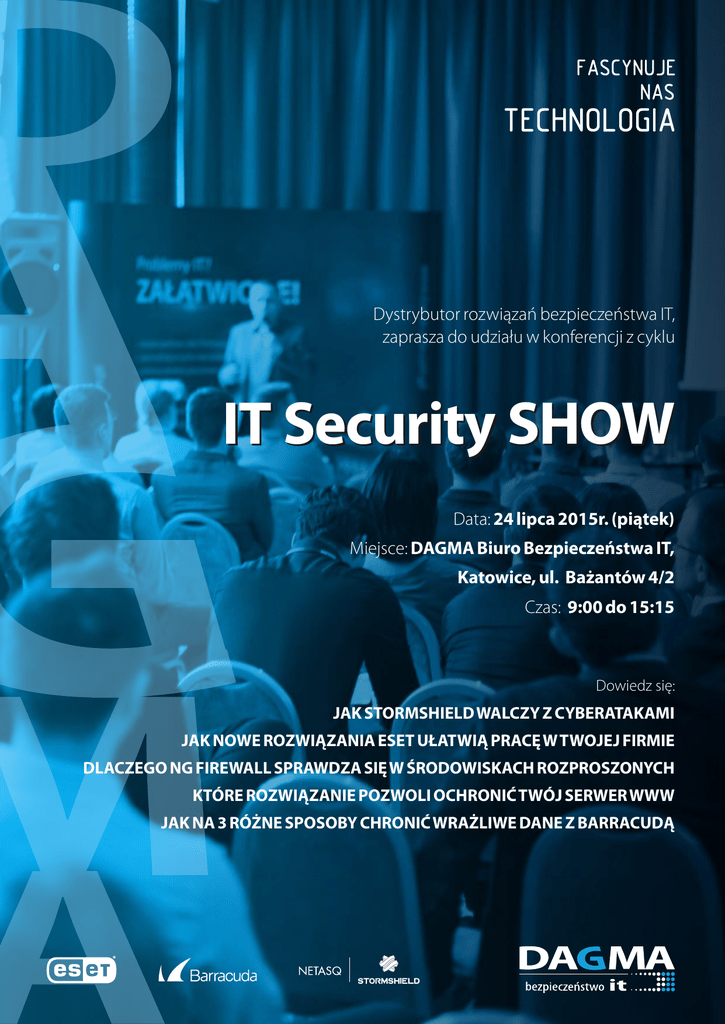 Dystrybutor rozwi¹zañ bezpieczeñstwa IT, zaprasza do udzia³u w konferencji z cyklu IT Security SHOW Data: 24 lipca 2015r. (pi¹tek) Miejsce: DAGMA Biuro Bezpieczeñstwa IT, Katowice, ul. Ba¿antów 4/2 Czas: 9:00 do 15:15 Dowiedz siê: JAK STORMSHIELD WALCZY Z CYBERATAKAMI JAK NOWE ROZWI¥ZANIA ESET U£ATWI¥ PRACÊ W TWOJEJ FIRMIE DLACZEGO NG FIREWALL SPRAWDZA SIÊ W ŒRODOWISKACH ROZPROSZONYCH KTÓRE ROZWI¥ZANIE POZWOLI OCHRONIÆ TWÓJ SERWER WWW JAK NA 3 RÓ¯NE SPOSOBY CHRONIÆ WRA¯LIWE DANE Z BARRACUD¥ HARMONOGRAM 9:00 – 9:30 9:30 – 10:30 Rejestracja uczestników DAGMA Poznaj korzyœci ze wspó³pracy z ogólnopolskim dystrybutorem rozwi¹zañ bezpieczeñstwa IT. Zobacz, jak mo¿emy pomóc Ci, oferuj¹c unikatowe rozwi¹zania, przeznaczone do zabezpieczania infrastruktury IT. Stormshield Poznaj STORMSHIELD - najnowsz¹ seriê urz¹dzeñ od europejskiego lidera wœród dostawców rozwi¹zañ UTM. SprawdŸ jak skutecznie urz¹dzenia STORMSHIELD mog¹ ochroniæ Twoj¹ sieæ przed atakami i zagro¿eniami z zewn¹trz oraz jak STORMSHIELD pozwala monitorowaæ poziom bezpieczeñstwa sieci firmowej. 10:30 – 10:45 10:45 – 12:30 Przerwa ESET - nowe rozwi¹zania dla biznesu Poznaj nowe rozwi¹zania ESET dla biznesu, dziêki którym MO¯ESZ WIÊCEJ. Dowiedz siê wiêcej o nowej webowej konsoli zarz¹dzaj¹cej, niezale¿nych agentach instalowanych na stacjach roboczych czy mo¿liwoœci instalacji ESET Remote Administrator Serwer na systemach Linux i wielu, wielu nowych funkcjonalnoœciach. DESlock i StorageCraft – ESET Technology Alliance Dowiedz siê dlaczego rozwi¹zania szyfruj¹ce firmy DESlock skutecznie chroni¹ firmowe dane i dlaczego Twoja firma jest zobligowana prawem do stosowania szyfrowania. Poznaj równie¿ rozwi¹zania firmy StorageCraft, s³u¿¹ce do backupu i b³yskawicznego przywracania danych w razie awarii. Przekonaj siê sam, ¿e serwer dowolnej wielkoœci mo¿na przywróciæ do dzia³ania nawet w 15 minut. Poznaj bli¿ej produkty dostêpne w ramach ESET Technology Alliance. 12:30 – 13:00 13:00 – 14:00 Lunch Barracuda Poznaj rozbudowane mo¿liwoœci kontroli aplikacji, pionierskie podejœcie do zarz¹dzania oraz tworzenia tuneli VPN. SprawdŸ ile dziur ma Twój serwer WWW i zobacz dlaczego z rozwi¹zañ Barracudy korzystaj¹ sieci handlowe, banki, szpitale oraz jednostki rz¹dowe. 14:00 - 14:15 14:15 – 15:15 Przerwa Barracuda Zobacz jak prosto i skutecznie pozbyæ siê spamu i innych ataków na pocztê. Jak udowodniæ kradzie¿ poufnych danych? Jak unikn¹æ utraty danych? Jak wdro¿yæ backup i odtworzyæ dane z dowolnego miejsca na œwiecie. Zobacz dlaczego z rozwi¹zañ Barracudy korzystaj¹ firmy ubezpieczeniowe, finansowe, urzêdy oraz ministerstwa. Udzia³ w konferencji jest bezp³atny. Wszystkich zainteresowanych zapraszamy do rejestracji online na stronie: www.dagma.com.pl/2015-katowice PROWADZ¥CY El¿bieta Kasprzyk – kierownik dzia³u handlowego StorageCraft Polska. Odpowiada za wspó³pracê z resellerami, rozwój sprzeda¿y i budowanie marki StorageCraft wœród polskich klientów. Pawe³ Jurek – wicedyrektor ds. rozwoju, odpowiedzialny za wprowadzanie nowych produktów na polski rynek we wspó³pracy z zespo³em product managerów. [email protected] [email protected] Grzegorz Klocek – product manager rozwi¹zañ ESET w Dagmie, odpowiedzialny za budowanie marki ESET w Polsce, rozwój sieci partnerów i kontakt z kluczowymi klientami ESET. Bartosz Ró¿alski – product manager rozwi¹zañ Barracuda Networks w Dagmie, odpowiedzialny za kontakty z kluczowymi klientami, rozwój sprzeda¿y i budowanie marki Barracuda Networks w Polsce. [email protected] [email protected] Artur Holeczek – product manager rozwi¹zañ STORMSHIELD, odpowiada za kontakty z kluczowymi klientami, rozwój sprzeda¿y i budowanie rozpoznawalnoœci marki STORMSHIELD w Polsce. [email protected] PROWADZ¥CY Stefan Skorupa – certyfikowany in¿ynier rozwi¹zañ ESET. Specjalizuje siê w rozwi¹zaniach przeznaczonych do ochrony antywirusowej, szyfrowania i backupu. Adam Rejmandowski – certyfikowany in¿ynier NETASQ STORMSHIELD, wdro¿eniowiec rozwi¹zañ sieciowych i trener UNIX i Linux. [email protected] [email protected] Micha³ Zalewski – certyfikowany in¿ynier rozwi¹zañ Barracuda Networks oraz ESET, trener Unix/Linux. Specjalizuje siê we wdra¿aniu rozwi¹zañ sieciowych i do backupu. Jacek Domaga³a – certyfikowany in¿ynier ESET. Zajmuje siê pomoc¹ techniczn¹ dla produktów ESET, DESlock oraz urz¹dzeñ sieciowych klasy UTM: NETASQ STORMSHIELD. [email protected] [email protected] Krzysztof Siwy – starszy specjalista ds. technicznych, certyfikowany in¿ynier i wdro¿eniowiec rozwi¹zañ Barracuda oraz STORMSHIELD. Robert Ko³odziejak – certyfikowany in¿ynier ESET, zajmuje siê tak¿e rozwi¹zaniami NETASQ STORMSHIELD. [email protected] [email protected] DAGMA Sp. z o.o. jest jednym z najwiêkszych na polskim rynku dystrybutorów rozwi¹zañ z dziedziny bezpieczeñstwa IT. Od 2001 roku specjalizuje siê w bezpieczeñstwie œwiadcz¹c us³ugi z zakresu szyfrowania, backupu, ochrony brzegu sieci i ochrony antywirusowej dla 3,5 mln Polaków. Dlaczego my? 140 pracowników, w tym 75 w czêœci zajmuj¹cej siê bezpoœrednio dystrybucj¹ IT, 15 in¿ynierów wsparcia technicznego, 2 000 partnerów handlowych w ca³ej Polsce, 20 specjalistów ds. sprzeda¿y obs³uguj¹cych sieæ partnersk¹, zespó³ product managerów i specjalistów ds. marketingu, buduj¹cy pozycjê dystrybuowanych marek na polskim rynku, nagrody „Diament Forbesa” za lata 2006, 2007, 2010 i 2011, siedem nagród „Gazela Biznesu” – ostatnia za 2014 rok.
