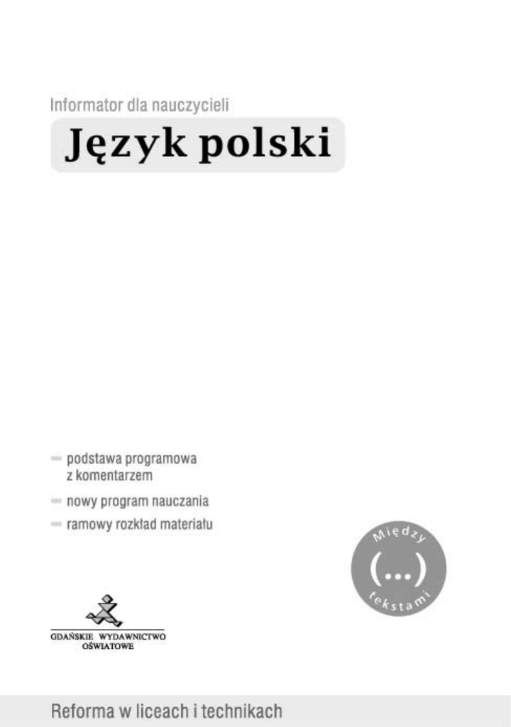 PPL strona: 2 Redakcja: Hanna Negowska Projekt okładki: Michał Kosma Szczerek Skład (TEX): Andrzej Mysior Broszura zawiera program Między tekstami, który otrzymał pozytywne recenzje rzeczoznawców: mgr Grażyny Czetwertyńskiej, dr. Franciszka Nieckuli i dr. Krzysztofa Wojcieszki. Wszystkie dokumenty niezbędne do umieszczenia programu w wykazie programów dopuszczonych do użytku szkolnego zostały złożone w MENiS 14.02.2002 r. Konsultacja programu: prof. Jolanta Maćkiewicz, dr hab. Zbigniew Majchrowski, dr hab. Stanisław Rosiek, mgr mgr Emilia Kuczyńska, Grażyna Łomowska, Agnieszka Łuczak, Ewa Niwińska, Iwona Skwierawska, Tatiana Witkowska ISBN 83–88881–10–8 © Gdańskie Wydawnictwo Oświatowe, Gdańsk 2002 Druk i oprawa: Stella Maris w Gdańsku Wszystkie książki Wydawnictwa są dostępne w sprzedaży wysyłkowej. Zamówienia prosimy nadsyłać pod adresem: Gdańskie Wydawnictwo Oświatowe 80–876 Gdańsk 52, skrytka pocztowa 59 tel./fax 0-801-64-39-17, (58) 302-59-16 http://www.gwo.pl e-mail: [email protected] PPL strona: 3 SPIS TREŚCI Wstęp ......................................................................................................................................................................................... 5 Podstawa programowa Część ogólna ............................................................................................................................................................... 7 ................................................................................................................................................................. 9 ............................................................................................................................................................................. 16 Język polski Komentarz Program nauczania języka polskiego (klasy I–III) Uwagi wstępne ........................................................................................................................................................... Cele edukacyjne ....................................................................................................................................................... Materiał nauczania Lektury 24 25 ................................................................................................................................................. 29 .................................................................................................................................................................... 36 Procedury osiągania celów .............................................................................................................................. Ocenianie osiągnięć uczniów ......................................................................................................................... Przewidywanie osiągnięć uczniów ............................................................................................................. 41 54 70 PPL strona: 5 Szanowni Państwo! W roku szkolnym 2002/2003 naukę w liceach i technikach rozpoczną pierwsi absolwenci gimnazjów. Będą się uczyć według nowych programów. Niniejsza broszura ma pomóc nauczycielom w przygotowaniu się do nadchodzących zmian. Najważniejszym dokumentem opisującym zadania szkoły i obowiązujący materiał nauczania jest Podstawa programowa. Pierwsza część informatora zawiera wszystkie fragmenty Podstawy istotne dla nauczycieli języka polskiego oraz komentarz zawierający m.in. porównanie tego dokumentu z dotychczasowym programem nauczania. Podstawa programowa obowiązuje wszystkich nauczycieli, jest to jednak tekst bardzo ogólnikowy (nie zawiera np. podziału treści między klasy). Dokumentem bardziej szczegółowym jest program nauczania. Choć Podstawa jest jedna, to dostosowanych do niej programów będzie wiele. Wybór jednego z nich należy do nauczyciela. Polecam Państwu program Między tekstami, który uzyskał pozytywne recenzje rzeczoznawców: mgr Grażyny Czetwertyńskiej, dr. Franciszka Nieckuli i dr. Krzysztofa Wojcieszki. Wszystkie dokumenty niezbędne do umieszczenia programu w wykazie programów dopuszczonych do użytku szkolnego zostały złożone w MENiS 14.02.2002 r. Trwające od kilku lat dyskusje nad reformą szkolnictwa i kształtem nowej matury skłoniły nas również do pracy nad nowym kompletem podręczników do nauczania języka polskiego w liceum. Do ich przygotowania udało nam się namówić doświadczonych nauczycieli akademickich: prof. J. Maćkiewicz, dr. hab. Z. Majchrowskiego i dr. hab. St. Rośka. Zadbaliśmy także o liczny zespół konsultantów wyłonionych spośród nauczycieli uczących w liceach. Efektem tej współpracy będą podręczniki również pod tytułem Między tekstami, które wraz z programem i książką dla nauczyciela stworzą nie tylko nową i ciekawą propozycję nauczania języka polskiego w liceum, ale także ułatwiają Państwu przygotowanie młodzieży do nowej matury. Redaktor Naczelny PPL strona: 7 PODSTAWA PROGRAMOWA (FRAGMENTY) CZĘŚĆ OGÓLNA W liceum profilowanym, w kształceniu ogólnym (tzw. kanonie kształcenia ogólnego obowiązującym wszystkich uczniów), mając na względzie ciągłość i spójność między poszczególnymi etapami kształcenia, a także właściwy kształt programów nauczania i programów wychowawczych szkoły, należy stosować odpowiednio zasady ogólne przyjęte dla szkoły podstawowej i gimnazjum. Nauczyciele powinni dążyć do wszechstronnego rozwoju ucznia jako nadrzędnego celu pracy edukacyjnej. Edukacja szkolna polega na harmonijnej realizacji przez nauczycieli zadań w zakresie nauczania, kształcenia umiejętności i wychowania. Zadania te tworzą wzajemnie uzupełniające się i równoważne wymiary pracy każdego nauczyciela. Szkoła w zakresie nauczania, co stanowi jej zadanie specyficzne, zapewnia uczniom w szczególności: 1) naukę poprawnego