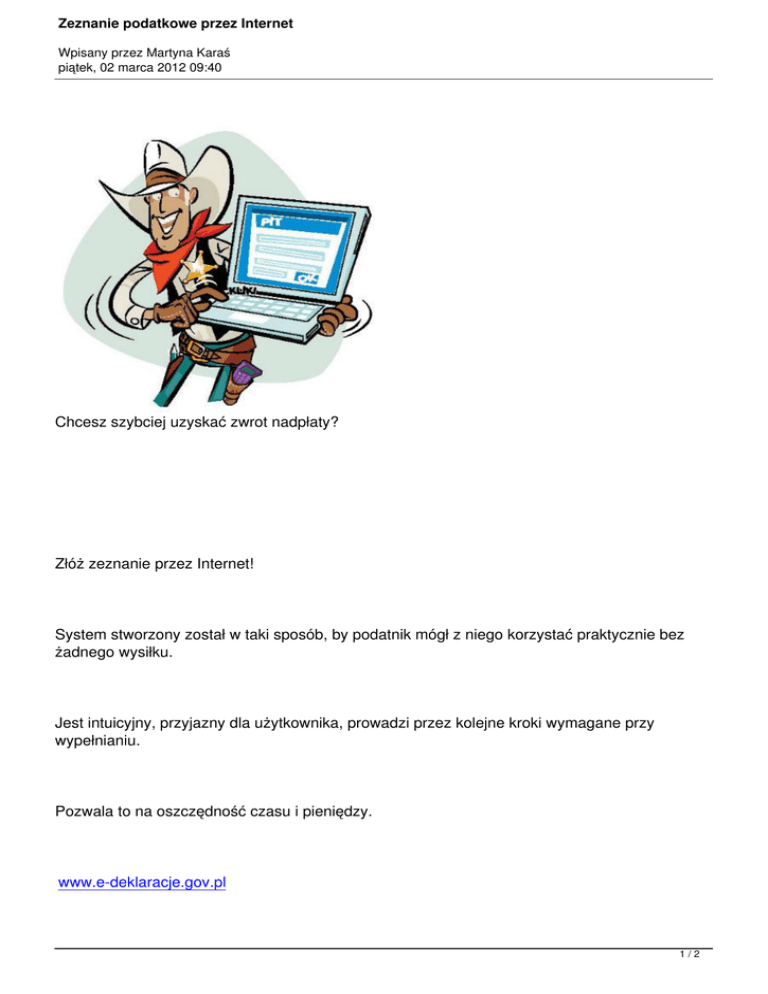Zeznanie podatkowe przez Internet Wpisany przez Martyna Karaś piątek, 02 marca 2012 09:40 Chcesz szybciej uzyskać zwrot nadpłaty? Złóż zeznanie przez Internet! System stworzony został w taki sposób, by podatnik mógł z niego korzystać praktycznie bez żadnego wysiłku. Jest intuicyjny, przyjazny dla użytkownika, prowadzi przez kolejne kroki wymagane przy wypełnianiu. Pozwala to na oszczędność czasu i pieniędzy. www.e-deklaracje.gov.pl 1/2 Zeznanie podatkowe przez Internet Wpisany przez Martyna Karaś piątek, 02 marca 2012 09:40 2/2