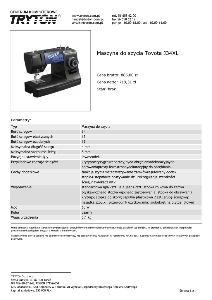 www.tryton.com.pl [email protected] [email protected] tel. 56 658 62 00 fax 56 658 62 19 pon-pt: 10.00-18.00, sob: 10.00-14.00 Maszyna do szycia Toyota J34XL Cena brutto: 885,00 zł Cena netto: 719,51 zł Stan: brak Parametry: Typ Ilość ściegów Ilość ściegów elastycznych Ilość ściegów ozdobnych Maksymalna długość ściegu Maksymalna szerokość ściegu Pozycje ustawienia igły Przykładowe rodzaje ściegów Cechy dodatkowe Wyposażenie Moc Kolor Waga urządzenia Maszyna do szycia 34 15 19 4 mm 5 mm lewośrodek krytyprostyzygzakreperacyjnydo obrębianiadekoracyjnydo cerowaniaprosty lewostronnydekoracyjny do obrębiania funkcja szycia wsteczwszywanie zamkówregulowany docisk stopki4-stopniowe obszywanie dziurekregulacja szerokości ściegunawlekacz nitki standardowa igła 2szt; igła jeans 2szt; stopka rolkowa do zamka błyskawicznego;stopka ogólnego zastosowania; stopka do obszywania krytego; stopka do skóry; szpulka plastikowa 2 szt; śrubę ściegową; nasadka szpulki; przewodnik użytkowania; śrubokręt na płytce igłowej 65 W czarny 5,1 kg Mimo dołożenia wszelkich starań nie gwarantujemy, że publikowane dane techniczne nie zawierają uchybień lub błędów. W przypadku jakichkolwiek wątpliwości prosimy przed podjęciem decyzji o kontakt z handlowcem. Przedstawiona oferta cenowa ma charakter informacyjny, nie stanowi oferty handlowej w rozumieniu Art.66 par.1 Kodeksu Cywilnego oraz innych właściwych przepisów prawnych. TRYTON Sp. z o.o. Szosa Lubicka 13, 87-100 Toruń NIP 956-20-37-243, REGON 871526851 KRS 0000006913, Sąd Rejonowy w Toruniu, VII Wydział Gospodarczy Krajowego Rejestru Sądowego kapitał zakładowy: 250 000 PLN Strona 1 z 1