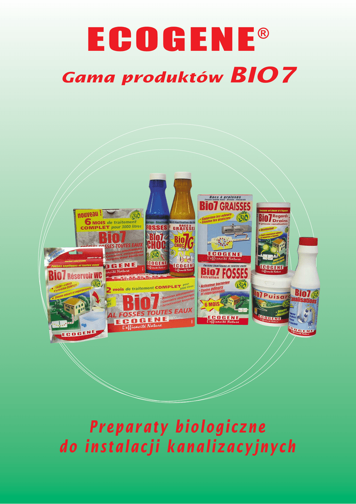 ECOGENE Gama produktów ® BIO7 Preparaty biologiczne do instalacji kanalizacyjnych Bio7 G Choc (art. nr 000497) Butelka 375g : 5 dawek ● Preparat posiada specjalne w∏aÊciwoÊci powodujàce natychmiastowe + 5 kapsu∏ek odblokowanie separatorów t∏uszczu i wspomaga ich dzia∏anie. ie Dzia∏an PRODUKT INNOWACYJNY : Bio7 G zawiera nowà mieszank´ wyselekcjonowanych enzymów i dzia∏a na zasadzie wspó∏dzia∏ania enzymatycznego : dzia∏anie tej mieszanki jest bardziej skuteczne ni˝ suma pojedynczych dzia∏aƒ ka˝dego enzymu. E W O K O Z S REZULTAT : DZIA¸ANIE KOMPLEKSOWE. Bio7 G CHOC nie tylko rozpuszcza t∏uszcze lecz równie˝ ca∏kowicie je degraduje, udra˝niajàc tym samym instalacje kanalizacyjnà. Bio7 G CHOC to produkt opatentowany przez LABORATORIA ECOGENE Bio7 Graisses Bio7 t∏uszcze (art. nr 060160) ● Eksploatacja separatorów t∏uszczu ● Udra˝nianie biologiczne: po∏àczenie dro˝d˝y i wyselekcjonowanych bakterii zawartych w kapsu∏kach powoduje biologicznà degradacj´ zatorów t∏uszczu i zapobiega ich powstawaniu ● Likwiduje nieprzyjemne zapachy ie Dzia∏an JNE Y C A T A EKSPLO Opakowanie 6 dawek w torebkach + 6 kapsu∏ek Opakowanie dla wi´kszych instalacji wiaderko 1.4 kg (art. nr 000539) ECOGENE® Gama produktów BIO7 - 2 ie Dzia∏an E W O K O Z S Bio7 Choc (art. nr 000117) Aktywator Butelka 375g aktywatora bakteryjnego : 5 dawek ● Skoncentrowana receptura do URUCHOMIENIA i SZYBKIEGO ODBLOKOWANIA WSZYSTKICH TYPÓW OSADNIKÓW ● Likwidacja nieprzyjemnych zapachów + 5 kapsu∏ek (mikroorganizmy aktywujàce) W ofercie jest równie˝ wi´ksze opakowanie : wiaderko 2 kg (art. nr 000232) ie Dzia∏an JNE Y C A T A EKSPLO Bio7 Entretien Fosses Bio7 osadniki (art. nr 000216) Aktywator bakteryjny Opakowanie zawiera: 6 dawek w saszetkach, 1 saszetka na 2m3/miesiàc ● Eksploatacja d∏ugookresowa (6 miesi´cy) ● Likwiduje nieprzyjemne zapachy ● Eliminuje zatory, zapobiega osadzaniu si´ t∏uszczu w instalacji ● Zwi´ksza skutecznoÊç funkcjonowania osadnika ECOGENE® Gama produktów BIO7 - 3 Bio7 Spécial Fosses toutes eaux Bio7 osadniki dodatkowo wzbogacony o bakterie rozk∏adajàce t∏uszcze Receptura opracowana do kompleksowego utrzymania i eksploatacji osadników, zawiera 3 sk∏adniki biologiczne niezb´dne dla prawid∏owego funkcjonowania osadników. 1 ● Zawiera skoncentrowany sk∏adnik enzymatyczny rozk∏adajàcy t∏uszcze, zapobiegajàcy zatorom, wzmocniony przez enzymatyczne aktywatory ; 2 ● Liczne (tysiàce miliardów) specjalne, ˝ywe bakterie, niezb´dne w procesie oczyszczania Êcieków (oczyszczanie + up∏ynnianie + hydroliza) ; 3 ● Bakteryjne aktywatory przyÊpieszajàce i optymalizujàce mikrobiologiczne dzia∏anie bakterii JednoczeÊnie preparat dzia∏a na t∏uszcze. Zapobiega gromadzeniu si´ t∏uszczu i zatorom, likwiduje nieprzyjemne zapachy i zmniejsza iloÊç operacji usuwania osadów. e j u n i Elim e˝ rÓwni e z t∏uszc 12 miesi´cy (art. nr 000125) 24 saszetki = 12 miesi´cy eksploatacji osadnika 3000l 6 miesi´cy (art. nr 068767) 12 saszetek = 6 miesi´cy eksploatacji osadnika 3000l Bio7 Puisard Bio7 studzienki (art. nr 066373) Dzi´ki sk∏adnikom zapobiegajàcym powstawaniu kamienia Bio7 Puisard jest idealny do eksploatacji studzienek w instalacjach kanalizacyjnych. ● Udra˝nia i usuwa kamieƒ w studzienkach zapewniajàc prawid∏owà cyrkulacj´ Êcieków ● Zwi´kszona skutecznoÊç dzia∏ania przy jednoczesnym stosowaniu Bio7 Graisses w zbiornikach t∏uszczu ECOGENE® Gama produktów BIO7 - 4 Wiadro 800g Bio7 Canalisations Bio7 kanalizacje (art. nr 068072) Preparat biologiczny przeznaczony do udra˝niania, likwidacji nieprzyjemnych zapachów, zapobiegajàcy gromadzeniu si´ kamienia w syfonach zlewozmywaków, umywalek, natrysków.........oraz w przewodach kanalizacyjnych. ● Naturalny proszek na bazie specjalnych enzymów rozk∏adajàcy t∏uszcze + wyselekcjonowane mikroorganizmy wytwarzajàce enzymy ● Bardzo SZYBKIE DZIA¸ANIE i przez D¸UGI OKRES ● Natychmiastowy, Êwie˝y zapach w mikrokapsu∏ mikrokapsu∏kach Butelka 500g z korkiem zabezpieczajàcym przed dzieçmi Ta oryginalna, unikalna receptura jest opatentowana przez Laboratoria Ecogene p s u ∏k i a k o r k Mi owe zapach Bio7 Détartrant Biologique Bio7 odkamieniacz biologiczny (art. nr 070854) CzyÊci i odkamienia muszle WC i rury kanalizacyjne ∏àczàce je z osadnikiem. ● Specjalne dzia∏anie zapobiegajàce tworzeniu si´ kamienia w 2 plastikowe pojemniki, ka˝dy zawiera perfumowany 20g wk∏ad muszli i kanalizacji ● Aktywatory biologiczne neutralizujàce nieprzyjemne zapachy i zapobiegajàce zapychaniu si´ kanalizacji ● Zapewnia prawid∏owe dzia∏anie osadnika ● Wydziela przyjemny zapach przy ka˝dorazowym uruchomieniu sp∏uczki. ● ¸atwe i praktyczne zamocowanie na kraw´dzi muszli WC ECOGENE® Gama produktów BIO7 - 5 Détartrant Gel WC ˚el odkamieniacz do WC (art. nr 000596) Butelka 750ml z korkiem zabezpieczajàcym przed dzieçmi CzyÊci i usuwa kamieƒ z powierzchni muszli WC. ● Zapewnia prawid∏owy przebieg procesów biologicznych zachodzàcych w osadnikach (uzupe∏nienie preparatów Bio7 Choc i Bio7 G) Ca∏kowicie Biodegradowalny ● Nieszkodliwy dla kanalizacji ● Natychmiastowe dzia∏anie odÊwie˝ajàce ● W postaci ˝elu aby d∏u˝ej dzia∏a∏ na powierzchni muszli WC Bio7 Réservoir WC Bio7 do zbiornika sp∏uczki WC (art. nr 070847) Kostka-aktywator biologiczny do stosowania we WSZYSTKICH TYPACH OSADNIKOW, dzia∏a 4 miesiàce. ● Uwalnianie aktywnych substancji nast´puje podczas ka˝dego uruchomienia sp∏uczki. anie ● Zapobiega tworzeniu si´ kamienia w zbiorniku opakow ● Likwiduje nieprzyjemne zapachy ● Aktywatory bakteryjne zapobiegajà zapychaniu si´ instalacji i eliminujà inne niedomagania osadników ● ¸atwe i szybkie umieszczenie kostki w zbiorniku ● Brak bezpoÊredniego kontaktu z preparatem e acja Szczeln onserw k a z s p ków = najle sk∏adn