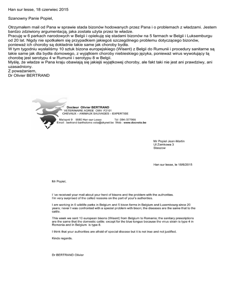 Han sur lesse, 18 czerwiec 2015 Szanowny Panie Popiel, Otrzymałem mail od Pana w sprawie stada bizonów hodowanych przez Pana i o problemach z władzami. Jestem bardzo zdziwiony argumentacją, jaka została użyta przez te władze. Pracuję w 6 parkach narodowych w Belgii i opiekuję się stadami bizonów na 5 farmach w Belgii i Luksemburgu od 20 lat. Nigdy nie spotkałem się przypadkiem jakiegoś szczególnego problemu dotyczącego bizonów, ponieważ ich choroby są dokładnie takie same jak choroby bydła. W tym tygodniu wysłaliśmy 10 sztuk bizona europejskiego (Wisent) z Belgii do Rumunii i procedury sanitarne są takie same jak dla bydła domowego, z wyjątkiem choroby niebieskiego języka, ponieważ wirus wywołujący tą chorobę jest serotypu 4 w Rumunii i serotypu 8 w Belgii. Myślę, że władze w Pana kraju obawiają się jakiejś wyjątkowej choroby, ale fakt taki nie jest ani prawdziwy, ani uzasadniony. Z poważaniem, Dr Olivier BERTRAND