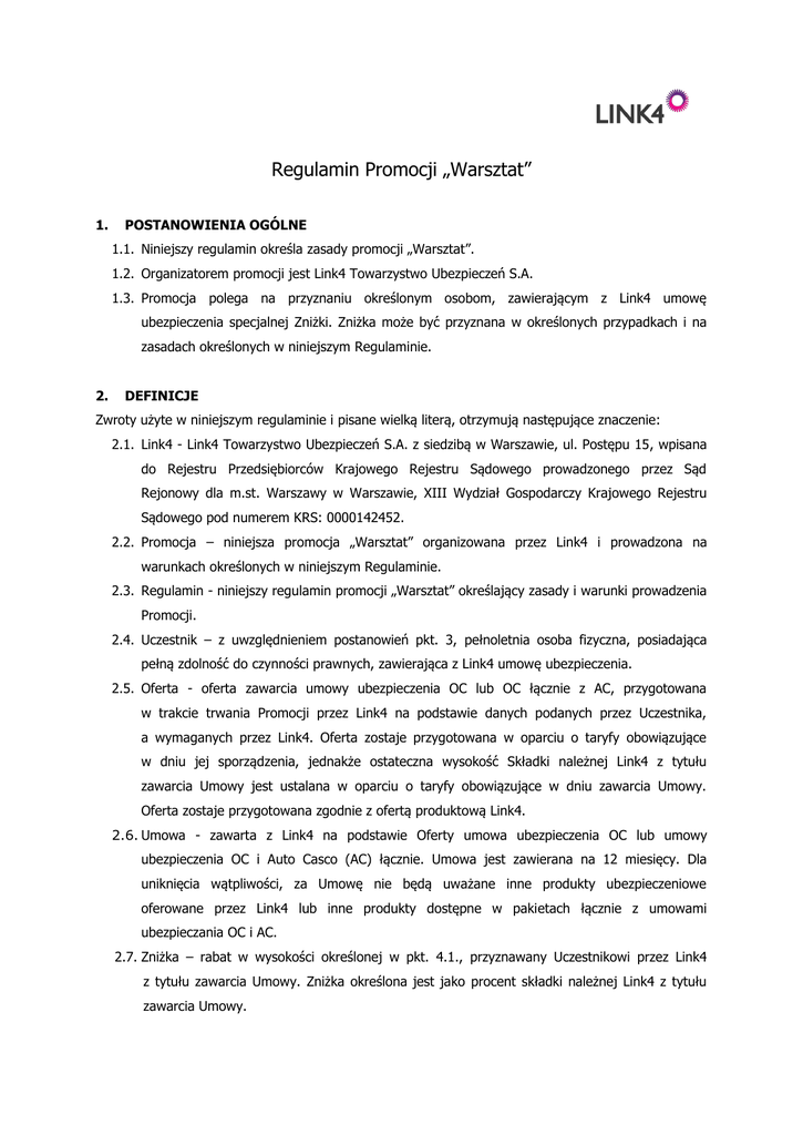 Regulamin Promocji „Warsztat” 1. POSTANOWIENIA OGÓLNE 1.1. Niniejszy regulamin określa zasady promocji „Warsztat”. 1.2. Organizatorem promocji jest Link4 Towarzystwo Ubezpieczeń S.A. 1.3. Promocja polega na przyznaniu określonym osobom, zawierającym z Link4 umowę ubezpieczenia specjalnej Zniżki. Zniżka może być przyznana w określonych przypadkach i na zasadach określonych w niniejszym Regulaminie. 2. DEFINICJE Zwroty użyte w niniejszym regulaminie i pisane wielką literą, otrzymują następujące znaczenie: 2.1. Link4 - Link4 Towarzystwo Ubezpieczeń S.A. z siedzibą w Warszawie, ul. Postępu 15, wpisana do Rejestru Przedsiębiorców Krajowego Rejestru Sądowego prowadzonego przez Sąd Rejonowy dla m.st. Warszawy w Warszawie, XIII Wydział Gospodarczy Krajowego Rejestru Sądowego pod numerem KRS: 0000142452. 2.2. Promocja – niniejsza promocja „Warsztat” organizowana przez Link4 i prowadzona na warunkach określonych w niniejszym Regulaminie. 2.3. Regulamin - niniejszy regulamin promocji „Warsztat” określający zasady i warunki prowadzenia Promocji. 2.4. Uczestnik – z uwzględnieniem postanowień pkt. 3, pełnoletnia osoba fizyczna, posiadająca pełną zdolność do czynności prawnych, zawierająca z Link4 umowę ubezpieczenia. 2.5. Oferta - oferta zawarcia umowy ubezpieczenia OC lub OC łącznie z AC, przygotowana w trakcie trwania Promocji przez Link4 na podstawie danych podanych przez Uczestnika, a wymaganych przez Link4. Oferta zostaje przygotowana w oparciu o taryfy obowiązujące w dniu jej sporządzenia, jednakże ostateczna wysokość Składki należnej Link4 z tytułu zawarcia Umowy jest ustalana w oparciu o taryfy obowiązujące w dniu zawarcia Umowy. Oferta zostaje przygotowana zgodnie z ofertą produktową Link4. 2.6. Umowa - zawarta z Link4 na podstawie Oferty umowa ubezpieczenia OC lub umowy ubezpieczenia OC i Auto Casco (AC) łącznie. Umowa jest zawierana na 12 miesięcy. Dla uniknięcia wątpliwości, za Umowę nie będą uważane inne produkty ubezpieczeniowe oferowane przez Link4 lub inne produkty dostępne w pakietach łącznie z umowami ubezpieczania OC i AC. 2.7. Zniżka – rabat w wysokości określonej w pkt. 4.1., przyznawany Uczestnikowi przez Link4 z tytułu zawarcia Umowy. Zniżka określona jest jako procent składki należnej Link4 z tytułu zawarcia Umowy. 3. WARUNKI UCZESTNICTWA W PROMOCJI I OTRZYMANIA ZNIŻKI W Promocji bierze udział i nabywa prawo do Zniżki każdy Uczestnik, który spełni łącznie następujące warunki: 3.1. w okresie trwania Promocji Uczestnik zadzwonił do Link4 na numer 22 444 44 44 lub zamówi rozmowę z Konsultantem wypełniając formularz kontaktowy na stronie www.link4.pl i w rozmowie z Konsultantem podczas wyliczania Oferty powoła się na hasło „Warsztat”; 3.2. na dzień sporządzenia Oferty nie posiada obowiązującej Umowy zawartej z Link4, w której jest ubezpieczającym, chyba że Umowa ta dotyczy innego samochodu lub innego przedmiotu ubezpieczenia niż określony w Ofercie; 3.3. po otrzymaniu Oferty ale przed zakończeniem Promocji zaakceptuje Ofertę i złoży oświadczenie woli o zawarciu Umowy z Link4 podczas rozmowy z Konsultantem Link4; 3.4. w terminie wskazanym w Umowie opłaci całą należną Link4 składkę lub jej pierwszą ratę. Dla stwierdzenia uprawnienia Uczestnika do Zniżki nie jest istotny termin rozpoczęcia ochrony ubezpieczeniowej Link4, a jedynie data zawarcia Umowy i tym samym zapłacenia Składki lub jej pierwszej raty. 4. ZNIŻKA 4.1. Uczestnik, poprzez udział w Promocji, jest uprawniony do nabycia, na zasadach określonych w niniejszym Regulaminie, prawa do jednorazowej Zniżki w wysokości: 4.1.1. 5% składki – w przypadku, gdy Uczestnik zawiera z Link4 umowę ubezpieczenia odpowiedzialności cywilnej posiadaczy pojazdów mechanicznych (OC) lub łącznie umowę ubezpieczenia OC i AC; 4.2. Procent Zniżki wskazany powyżej liczony jest od wartości rocznej składki należnej do zapłaty z tytułu zawarcia danej Umowy. Przy obliczaniu wysokości Zniżki brana jest pod uwagę składka do zapłaty, po wcześniejszym uwzględnieniu wszystkich parametrów wpływających na jej wysokość, takich jak np. zniżki za bezszkodową jazdę, forma płatności, ilość rat itp. Na wysokość składki, od której liczona jest Zniżka nie ma wpływu wysokość składki za inne umowy ubezpieczenia zawierane przez Uczestnika łącznie z Umową, z której zawarciem związana jest Zniżka. 4.3. Uczestnik nabywa prawo do Zniżki z chwilą zawarcia Umowy, o ile spełnia wszystkie warunki wzięcia udziału w Promocji. 4.4. Procent Zniżki, określony w pkt. 4.1 powyżej, odejmowany jest od składki rocznej należnej z tytułu Umowy, a jeżeli składka płatna ma być w ratach, Zniżka rozkładana jest proporcjonalnie na każdą ratę obniżając wysokość odpowiednio każdej raty. 4.5. Link4 nie wypłaca kwoty Zniżki w gotówce ani w żadnej innej formie niż wskazana w pkt. 4.4 powyżej. 5. POSTĘPOWANIE REKLAMACYJNE 5.1. Wszelkie reklamacje dotyczące Promocji, należy zgłaszać w formie pisemnej - listem zwykłym lub poleconym, pocztą kurierską lub osobiście na adres: Link4 Towarzystwo Ubezpieczeń S.A., ul. Postępu 15, 02-676 Warszawa z dopiskiem „Reklamacja – Promocja Warsztat”. 5.2. Reklamacje powinny być zgłoszone w ciągu 30 dni od dnia wystąpienia zdarzenia będącego podstawą reklamacji lub od dnia, w którym Uczestnik dowiedział się o zajściu takiego zdarzenia. Reklamacja powinna zawierać imię, nazwisko, dokładny adres reklamującego, jak również opis i powód reklamacji. 5.3. Reklamacje będą rozpatrywane przez Link4 w terminie do 14 dni od daty ich otrzymania. O decyzji Link4 reklamujący zostanie powiadomiony pisemnie, listem zwykłym lub telefonicznie, przy czym informacja telefoniczna dopuszczalna jest jedynie w przypadku uwzględnienia reklamacji. 6. POSTANOWIENIA KOŃCOWE 6.1. Promocja trwa od 1 kwietnia 2016 r. do 31 maja 2016