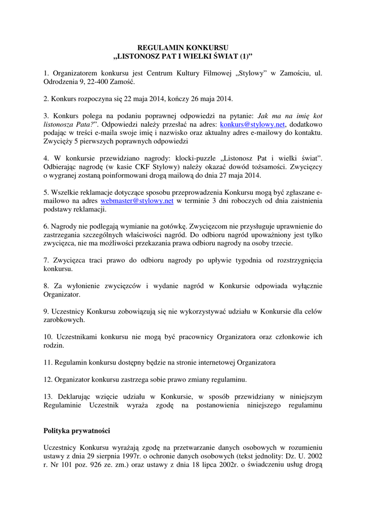 REGULAMIN KONKURSU „LISTONOSZ PAT I WIELKI ŚWIAT (1)” 1. Organizatorem konkursu jest Centrum Kultury Filmowej „Stylowy” w Zamościu, ul. Odrodzenia 9, 22-400 Zamość. 2. Konkurs rozpoczyna się 22 maja 2014, kończy 26 maja 2014. 3. Konkurs polega na podaniu poprawnej odpowiedzi na pytanie: Jak ma na imię kot listonosza Pata?”. Odpowiedzi należy przesłać na adres: [email protected], dodatkowo podając w treści e-maila swoje imię i nazwisko oraz aktualny adres e-mailowy do kontaktu. Zwycięży 5 pierwszych poprawnych odpowiedzi 4. W konkursie przewidziano nagrody: klocki-puzzle „Listonosz Pat i wielki świat”. Odbierając nagrodę (w kasie CKF Stylowy) należy okazać dowód tożsamości. Zwycięzcy o wygranej zostaną poinformowani drogą mailową do dnia 27 maja 2014. 5. Wszelkie reklamacje dotyczące sposobu przeprowadzenia Konkursu mogą być zgłaszane emailowo na adres [email protected] w terminie 3 dni roboczych od dnia zaistnienia podstawy reklamacji. 6. Nagrody nie podlegają wymianie na gotówkę. Zwycięzcom nie przysługuje uprawnienie do zastrzegania szczególnych właściwości nagród. Do odbioru nagród upoważniony jest tylko zwycięzca, nie ma możliwości przekazania prawa odbioru nagrody na osoby trzecie. 7. Zwycięzca traci prawo do odbioru nagrody po upływie tygodnia od rozstrzygnięcia konkursu. 8. Za wyłonienie zwycięzców i wydanie nagród w Konkursie odpowiada wyłącznie Organizator. 9. Uczestnicy Konkursu zobowiązują się nie wykorzystywać udziału w Konkursie dla celów zarobkowych. 10. Uczestnikami konkursu nie mogą być pracownicy Organizatora oraz członkowie ich rodzin. 11. Regulamin konkursu dostępny będzie na stronie internetowej Organizatora 12. Organizator konkursu zastrzega sobie prawo zmiany regulaminu. 13. Deklarując wzięcie udziału w Konkursie, w sposób przewidziany w niniejszym Regulaminie Uczestnik wyraża zgodę na postanowienia niniejszego regulaminu Polityka prywatności Uczestnicy Konkursu wyrażają zgodę na przetwarzanie danych osobowych w rozumieniu ustawy z dnia 29 sierpnia 1997r. o ochronie danych osobowych (tekst jednolity: Dz. U. 2002 r. Nr 101 poz. 926 ze. zm.) oraz ustawy z dnia 18 lipca 2002r. o świadczeniu usług drogą elektroniczną (Dz. U. Nr 144 poz.1204) w celach prowadzenia Konkursu, wyłaniania zwycięzców i przyznawania nagród, wydawania, odbioru i rozliczania nagród oraz w celach marketingowych, promocyjnych lub reklamowych Organizatora. Uczestnik ma prawo do wglądu do swoich danych oraz ich poprawiania. Podanie danych osobowych (imienia i nazwiska), jako niezbędnych do otrzymania nagrody, jest dobrowolne, lecz ich niepodanie uniemożliwia udział w konkursie.