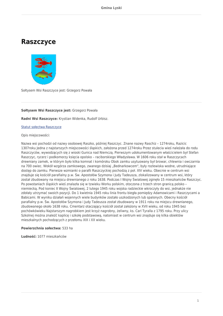 Gmina Lyski Raszczyce Sołtysem Wsi Raszczyce jest: Grzegorz Powała Sołtysem Wsi Raszczyce jest: Grzegorz Powała Radni Wsi Raszczyce: Krystian Widenka, Rudolf Urbisz. Statut sołectwa Raszczyce Opis miejscowości: Nazwa wsi pochodzi od nazwy osobowej Raszko, później Raszczyc. Znane nazwy Raschiz – 1274roku, Razicic 1307roku Jedna z najstarszych miejscowości śląskich, założona przed 1274roku Przez stulecia wieś należała do rodu Raszczyców, wywodzących się z wioski Gunica nad Niemczą. Pierwszym udokumentowanym właścicielem był Stefan Raszczyc, rycerz i podkomorzy księcia opolsko – raciborskiego Władysława. W 1606 roku stał w Raszczycach drewniany zamek, w którym było kilka komnat i komóroku Obok zamku usytuowany był browar, chlewnia i owczarnia na 700 owiec. Wokół wzgórza zamkowego, zwanego dzisiaj „Bednarkowcem", były rozlewiska wodne, utrudniające dostęp do zamku. Pierwsze wzmianki o parafii Raszczyckiej pochodzą z poł. XIV wieku. Obecnie w centrum wsi znajduje się kościół parafialny p.w. Św. Apostołów Szymona i Judy Tadeusza, zlokalizowany w centrum wsi, który został zbudowany na miejscu drewnianego z roku 1638. Podczas I Wojny Światowej zginęło 15 mieszkańców Raszczyc. Po powstaniach śląskich wieś znalazła się w tzwieku Worku polskim, otoczona z trzech stron granicą polsko – niemiecką. Pod koniec II Wojny Światowej, 2 lutego 1945 roku wojska radzieckie wkroczyły do wsi, jednakże nie zdołały utrzymać swoich pozycji. Do 1 kwietnia 1945 roku linia frontu biegła pomiędzy Adamowicami i Raszczycami a Babicami. W wyniku działań wojennych wiele budynków zostało uszkodzonych lub spalonych. Obecny kościół parafialny p.w. Św. Apostołów Szymona i Judy Tadeusza został zbudowany w 1911 roku na miejscu drewnianego, zbudowanego około 1638 roku. Cmentarz otaczający kościół został założony w XVII wieku, od roku 1945 bez pochówkówieku Najstarszym nagrobkiem jest krzyż nagrobny, żeliwny, ks. Carl Tyralla z 1795 roku. Przy ulicy Szkolnej można znaleźć kaplicę i szkołę podstawową, natomiast w centrum wsi znajduje się kilka obiektów mieszkalnych pochodzących z przełomu XIX i XX wieku. Powierzchnia sołectwa: 533 ha Ludność: 1077 mieszkańców 1