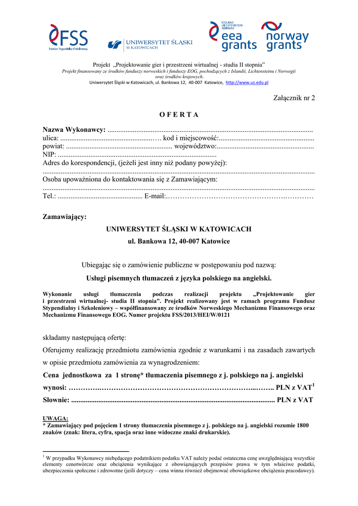 Projekt „Projektowanie gier i przestrzeni wirtualnej - studia II stopnia” Projekt finansowany ze środków funduszy norweskich i funduszy EOG, pochodzących z Islandii, Lichtensteinu i Norwegii oraz środków krajowych. Uniwersytet Śląski w Katowicach, ul. Bankowa 12, 40-007 Katowice, http://www.us.edu.pl Załącznik nr 2 OFERTA Nazwa Wykonawcy: .................................................................................................................. ulica: ...................................................…. kod i miejscowość:..................................................... powiat: ........................................................... województwo:...................................................... NIP: ........................................................................................ Adres do korespondencji, (jeżeli jest inny niż podany powyżej): ....................................................................................................................................................... Osoba upoważniona do kontaktowania się z Zamawiającym: ....................................................................................................................................................... Tel.: ............................................... E-mail:.………………………………………….………… Zamawiający: UNIWERSYTET ŚLĄSKI W KATOWICACH ul. Bankowa 12, 40-007 Katowice Ubiegając się o zamówienie publiczne w postępowaniu pod nazwą: Usługi pisemnych tłumaczeń z języka polskiego na angielski. Wykonanie usługi tłumaczenia podczas realizacji projektu „Projektowanie gier i przestrzeni wirtualnej- studia II stopnia”. Projekt realizowany jest w ramach programu Fundusz Stypendialny i Szkoleniowy – współfinansowany ze środków Norweskiego Mechanizmu Finansowego oraz Mechanizmu Finansowego EOG. Numer projektu FSS/2013/HEI/W/0121 składamy następującą ofertę: Oferujemy realizację przedmiotu zamówienia zgodnie z warunkami i na zasadach zawartych w opisie przedmiotu zamówienia za wynagrodzeniem: Cena jednostkowa za 1 stronę* tłumaczenia pisemnego z j. polskiego na j. angielski wynosi: ………….………………………………………………………...…….. PLN z VAT1 Słownie: ................................................................................................................. PLN z VAT UWAGA: * Zamawiający pod pojęciem 1 strony tłumaczenia pisemnego z j. polskiego na j. angielski rozumie 1800 znaków (znak: litera, cyfra, spacja oraz inne widoczne znaki drukarskie). 1 W przypadku Wykonawcy niebędącego podatnikiem podatku VAT należy podać ostateczna cenę uwzględniającą wszystkie elementy cenotwórcze oraz obciążenia wynikające z obowiązujących przepisów prawa w tym właściwe podatki, ubezpieczenia społeczne i zdrowotne (jeśli dotyczy – cena winna również obejmować obowiązkowe obciążenia pracodawcy). Projekt „Projektowanie gier i przestrzeni wirtualnej - studia II stopnia” Projekt finansowany ze środków funduszy norweskich i funduszy EOG, pochodzących z Islandii, Lichtensteinu i Norwegii oraz środków krajowych. Uniwersytet Śląski w Katowicach, ul. Bankowa 12, 40-007 Katowice, http://www.us.edu.pl Płatność przelewem, w terminie 14 dni od daty otrzymania prawidłowo wystawionej faktury/rachunku. Rozliczenie nastąpi po zrealizowanej usłudze, na podstawie ilości stron (znaków) w rzeczywiście wykonanym tłumaczeniu z dokładnością do połowy strony. Podstawą wystawienia faktury/rachunku będzie podpisany obustronnie protokół z wykonania usługi. Po zrealizowanej usłudze zostanie wystawiona jedna faktura/rachunek. Zastosowano stawkę podatku VAT w wysokości ……..……% albo Oświadczam, że nie jestem podatnikiem podatku VAT 2 Wyżej podana cena jest ceną łączną, zgodnie z art. 3 ust 1 pkt 1 ustawy z dnia 5 lipca 2001r. o cenach (Dz. U. z 11 września 2001 r. Nr 97, poz. 1050), tzn. jest to wartość wyrażona w jednostkach pieniężnych, którą kupujący jest obowiązany zapłacić przedsiębiorcy za towar lub usługę; w cenie uwzględnia się podatek od towarów i usług oraz podatek akcyzowy. 1. Rodzaj dokumentu, na podstawie którego zostanie zrealizowana płatność: rachunek/faktura* (niepotrzebne skreślić). 2. Oświadczamy, iż zaoferowana cena zawiera wszelkie koszty jakie poniesie Wykonawca w celu należytego wykonania przedmiotu umowy, a także koszty ogólne, w tym: opłaty i elementy ryzyka związane z realizacją zamówienia oraz należny podatek VAT. 3. Zobowiązujemy się do realizacji przedmiotu zamówienia w terminie określonym w propozycji umowy – załącznik nr 3. 4. Akceptujemy warunki płatności podane w propozycji umowy. 5. Oświadczamy, iż zapoznaliśmy się z opisem przedmiotu zamówienia, w pełni akceptujemy jego treść, nie wnosimy do niego zastrzeżeń oraz zdobyliśmy konieczne informacje do przygotowania oferty i zobowiązujemy się spełnić wszystkie wymagania Zamawiającego wymienione w opisie przedmiotu zamówienia – załącznik nr 1. 6. Akceptujemy treść wzoru umowy – załącznik nr 3. …................................................……………………… data i czytelny podpis lub podpis na pieczęci imiennej osoby upoważnionej do składania oświadczeń w imieniu Wykonawcy 2 Zaznaczyć właściwe