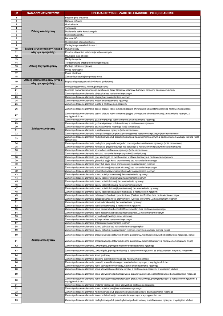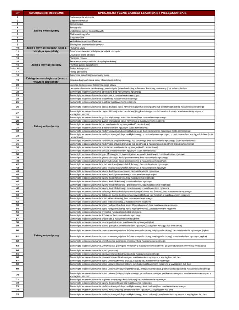 LP SPECJALISTYCZNE ZABIEGI LEKARSKIE I PIELĘGNIARSKIE ŚWIADCZENIE MEDYCZNE 1 Badanie pola widzenia 2 Badanie refrakcji 3 Gonioskopia 4 5 Tonografia Zabieg okulistyczny Dobieranie szkieł kontaktowych 6 Elektroretinografia 7 Badanie GDx 8 Wstrzknięcie podspojówkowe 9 10 11 Zabiegi na przewodach łzowych Zabieg laryngologiczny( wraz z wizytą u specjalisty) Płukanie uszu Przedmuchiwanie i katetyzacja trąbek usznych 12 Usunięcie ciała obcego 13 Nacięcie ropnia 14 15 Terapeutyczne przebicie błony bębenkowej Zabieg laryngologiczny Punkcja zatoki szczękowej 16 Próba kaloryczna 17 Próba obrotowa 18 19 Założenie przedniej tamponady nosa Zabieg dermatologiczny (wraz z wizytą u specjalisty) Biopsja diagnostyczna skóry i tkanki podskórnej 20 Iniekcja dostawowa z lekiem/punkcja stawu 21 Leczenie złamania zamkniętego,zwichnięcia (staw biodrowy,kolanowy, barkowy, ramienny ) ze znieczuleniem 22 Zamknięte leczenie złamania obojczyka bez nastawienia ręcznego 23 Zamknięte leczenie złamania obojczyka z nastawieniem ręcznym 24 Zamknięte leczenie złamania łopatki bez nastawienia ręcznego 25 Zamknięte leczenie złamania łopatki z nastawieniem ręcznym 26 Zamknięte leczenie złamania części bliższej kości ramiennej (szyjka chirurgiczna lub anatomiczna) bez nastawienia ręcznego 28 Zamknięte leczenie złamania części bliższej kości ramiennej (szyjka chirurgiczna lub anatomiczna) z nastawienie ręcznym, z wyciągiem lub bez Zamknięte leczenie złamania guzka większego kości ramiennej bez nastawienia ręcznego 29 Zamknięte leczenie złamania guzka większego kości ramiennej z nastawieniem ręcznym 27 30 31 Zabieg ortpedyczny 32 Zamknięte leczenie złamania bez nastawienia ręcznego (kość ramieniowa) Zamknięte leczenie złamania z nastawieniem ręcznym (kość ramieniowa) 34 Zamknięte leczenie złamania nadkłykciowego lub przezkłykciowego bez nastawienia ręcznego (kość ramieniowa) Zamknięte leczenie złamania nadkłykciowego lub przezkłykciowego z nastawieniem ręcznym, z zastosowaniem wyciągu lub bez (kość ramieniowa) Zamknięte leczenie złamania nadkłykcia przyśrodkowego lub bocznego bez nastawienia ręcznego (kość ramieniowa) 35 Zamknięte leczenie złamania nadkłykcia przyśrodkowego lub bocznego z nastawieniem ręcznym (kość ramieniowa) 36 Zamknięte leczenie złamania kłykcia bez nastawienia ręcznego (kość ramieniowa) 37 Zamknięte leczenie złamania kłykcia z nastawieniem ręcznym (kość ramieniowa) 38 Zamknięte leczenie złamania typu Monteggia ze zwichnięciem w stawie łokciowym z nastawieniem ręcznym 39 Zamknięte leczenie złamania głowy lub szyjki kości promieniowej bez nastawienia ręcznego 40 Zamknięte leczenie złamania głowy lub szyjki kości promieniowej z nastawieniem ręcznym 41 Zamknięte leczenie złamania kości łokciowej (wyrostek łokciowy) bez nastawienia ręcznego 42 Zamknięte leczenie złamania kości łokciowej (wyrostek łokciowy) z nastawieniem ręcznym 43 Zamknięte leczenie złamania trzonu kości promieniowej, bez nastawienia ręcznego 44 Zamknięte leczenie złamania trzonu kości promieniowej z nastawieniem ręcznym 45 Zamknięte leczenie złamania trzonu kości łokciowej, bez nastawienia ręcznego 46 Zamknięte leczenie złamania trzonu kości łokciowej z nastawieniem ręcznym 47 Zamknięte leczenie złamania trzonu kości łokciowej i promieniowej, bez nastawienia ręcznego 48 Zamknięte leczenie złamania trzonu kości łokciowej i promieniowej, z nastawieniem ręcznym 49 Zamknięte leczenie złamania dalszego końca kości promieniowej (Collesa lub Smitha), bez nastawienia ręcznego 50 Zamknięte leczenie złamania dalszego końca kości promieniowej (Collesa lub Smitha), z nastawieniem ręcznym 51 Zamknięte leczenie złamania kości łódeczkowatej, bez nastawienia ręcznego 52 Zamknięte leczenie złamania kości łódeczkowatej, z nastawieniem ręcznym 53 Zamknięte leczenie złamania kości nadgarstka (bez kości łódeczkowatej), bez nastawienia ręcznego 54 Zamknięte leczenie złamania kości nadgarstka (bez kości łódeczkowatej), z nastawieniem ręcznym 55 Zamknięte leczenie złamania wyrostka rylcowatego kości łokciowej, 56 Zamknięte leczenie złamania śródręcza bez nastawienia ręcznego 57 Zamknięte leczenie złamania śródręcza z nastawieniem ręcznym 58 Zamknięte leczenie złamania trzonu paliczka bez nastawienia ręcznego (ręka) 59 Zamknięte leczenie złamania trzonu paliczka z nastawieniem ręcznym, z użyciem wyciągu lub bez (ręka) 60 Zamknięte leczenie złamania przezstawowego (staw śródręczno-paliczkowy,międzypaliczkowy) bez nastawienia ręcznego, (ręka) 33 61 Zabieg ortpedyczny Zamknięte leczenie złamania przezstawowego (staw śródręczno-paliczkowy,międzypaliczkowy) z nastawieniem ręcznym, (ręka) 62 Zamknięte leczenie złamania, zwichnięcia, pęknięcia miednicy bez nastawienia ręcznego 63 Zamknięte leczenie złamania, zwichnięcia, pęknięcia miednicy z nastawieniem ręcznym, ze znieczuleniem innym niż miejscowe 64 Zamknięte leczenie złamania kości guzicznej 65 Zamknięte leczenie złamania panewki stawu biodrowego bez nastawienia ręcznego 66 Zamknięte leczenie złamania panewki stawu biodrowego z nastawieniem ręcznym, z wyciągiem lub bez 67 Zamknięte leczenie złamania kości udowej (koniec bliższy, szyjka) bez nastawienia ręcznego 68 Zamknięte leczenie złamania kości udowej (koniec bliższy, szyjka) z nastawieniem ręcznym, z wyciągiem lub bez 69 Zamknięte leczenie złamania kości udowej (międzykrętarzowego, przezkrętarzowego, podkrętarzowego) bez nastawienia ręcznego 71 Zamknięte leczenie złamania kości udowej (międzykrętarzowego, przezkrętarzowego, podkrętarzowego) z nastawieniem ręcznym, z wyciągiem lub bez Zamknięte leczenie złamania krętarza większego kości udowej bez nastawienia ręcznego 72 Zamknięte leczenie złamania trzonu kości udowej bez nastawienia ręcznego 73 Zamknięte leczenie z