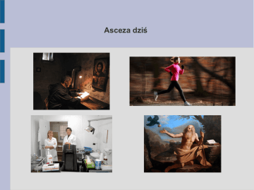 Asceza dziś Asceza Słownik Języka Polskiego 1. charakterystyczna dla średniowiecza postawa, polegająca na wyrzeczeniu się radości życia, w celu uzyskania zbawienia w niebie, 2. surowy tryb życia bez przyjemności i wygód, wstrzemięźliwość, 3. przen.: prostota wyrazu, surowość formy Askesis Trenować, ćwiczyć, kształtować Na początku dotyczy sportowców – dążenie do doskonałości. Pojawia się w odniesieniu do intelektu i równowagi współistnienia ciała i intelektu Obejmuje życie duchowe Te trzy elementy w harmonii – życie oparte na ascezie „Jej celem nie jest bowiem rozwijanie jednego tylko z wymiarów ludzkiej egzystencji kosztem innych konstytutywnych elementów, a raczej wprowadzenie harmonii między tym, co cielesne, intelektualne i duchowe w człowieku.(...) Zaniedbanie bądź przesadne skupianie się na jednym tylko spośród wymienionych wymiarów ludzkiej osoby zubaża ją, a niekiedy prowadzi nawet do swoistych form wynaturzenia.” Patryk Różycki „O ascezie, Wielkim Poście i człowieku współczesnym” Thomas Merton o ascezie „Jeżeli dusza nakaże ciału milczenie, zadając mu gwałt, ciało zemści się na niej, zarażając ją skrycie duchem buntu. Rozgoryczenie i zły humor – to owoce ascezy, która karciła jedynie ciało” „Nie możemy osiągnąć świętości jedynie drogą ucieczki od materialnego świata. (….) Święty doskonali się nie tylko poszcząc kiedy powinien pościć, ale także jedząc kiedy powinien jeść.” Istota ascezy Istota ascezy polega na wprowadzeniu ładu we własne życie. Takie używanie rzeczy stworzonych, które jest zgodne z wolą Boga. „ Właściwym celem ascezy jest ujawnienie różnic pomiędzy złym używaniem rzeczy stworzonych, które jest grzechem, a ich dobry użyciem, które jest cnotą” T.Merton Asceza chrześcijańska Powinna być: Inteligentna – związana z poznaniem Boga i jego stosunku do człowieka Pokorna – uprawiana nie dla wywyższenia siebie. Nadprzyrodzona – skierowana ku Bogu. „Jej owocem powinno być w pierwszym rzędzie głębokie życie modlitwy, a potem dzieła czynnej miłości bliźniego” T. Merton Wyciszenie Asceza nigdy nie jest przeciw naturze, lecz jest właśnie naturalną drogą życia. Zatem nie wyrzeczenie, ale wyciszenie leży u podstaw wielkopostnej ascezy. Osiągnięcie wewnętrznego skupienia i ciszy wiąże się z trudem. Towarzyszące temu dobrowolne wyrzeczenia są jednak jedynie środkiem prowadzącym do osiągnięcia wyższego celu, nie zaś celem samym w sobie Post - Uspokojenie serca Chrystus pościł 40 dni na pustyni. Nauka przezwyciężania pokus, które dotyczą ważnych obszarów życia: Pokusa zaspokojenia głodu Pokusa uznania/znaczenia Pokusa posiadania władzy Post doprowadza do doświadczenia własnych granic, pozwala zobaczyć inaczej dobra materialne, konfrontuje człowieka z jego życzeniami potrzebami, przywiązaniami. Post – uważność Żeby to co jest wielką radością naszego życia w czym się spełniamy realizujemy, nie było ucieczką od świata, od prawdy o nas samych, nie stało się nie źródłem zniewolenia, nałogiem. „Wychowywanie” swoich pragnień – często przez dobrowolną rezygnację. Selekcja i właściwa hierarchizacja bodźców, potrzeb, wartości. Prowadzi do wolności duchowej, pomaga radzić sobie z lękiem przed przyszłością Post – Jałmużna Dobry post prowadzi do jałmużny, jest z nią nierozerwalnie związany. W postawie poszczenia niebezpieczeństwo egoizmu,pychy,samouwielbienia. Post – droga do wewnętrznego otwierania się przed samym sobą Jałmużna – zewnętrzne otwieranie na drugiego człowieka. Jałmużna – dzielenie się zaoszczędzonymi dobrami ( materialnymi, czasem, rozmową...) Uczynki miłosierdzia duchowe i cielesne. Otwarcie na miłosierną miłość Boga, wdzięczność Jałmużna - modlitwa Modlitwa – przyznanie się do słabości i braku samowystarczalności. Miejsce dla „Tego którego miłość jest źródłem ładu, harmonii, szczęścia” Asceza zyskuje pełnię w modlitwie, w Bogu. Relacja z Bogiem – sens, trwałość naszej wewnętrznej pracy. Milczenie We wszystkich religiach milczenie i cisza - warunek spotkania z Bogiem Przez milczenie i dbałość o ciszę człowiek religijny ogranicza stymulację bodźców z otoczenia, jego uwaga zostaje ukierunkowana w stronę świata wewnętrznego, własnych myśli i emocji, które wtedy jest w stanie zaobserwować i kontrolować. Milczenie bywa spostrzegane jako droga walki z wadami i z grzechem. Milczenie- post duchowy Milczenie Praca ręczna Medytacja Modlitwa wewnętrzna Wypróbowane środki ascezy Anselm Grun „ Post modlitwą duszy i ciałą” Asceza podsumowanie Asceza dla każdego Dla chrześcijan asceza- droga umierania dla grzechu i życia dla Boga. Podejmowana z motywów miłości i zawierzenia Bogu prowadzi do odzyskania utraconej jedności z Bogiem. Jest sposobem dorastania do dojrzałych postaw religijnych. „aby wszystkie wartości przeżywane przez człowieka znalazły się na właściwym dla nich miejscu, w tym celu potrzeba szczególnego wysiłku. Wysiłek ten nosi nazwę ascezy” (Kardynał Karol Wojtyła ). Wszyscy jesteśmy ascetami