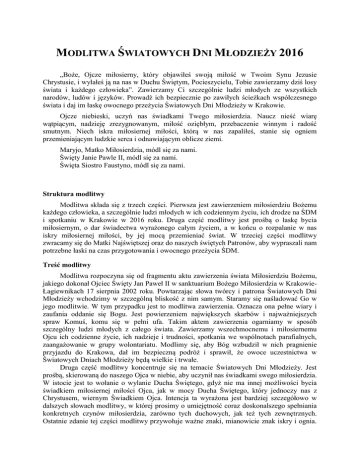 MODLITWA ŚWIATOWYCH DNI MŁODZIEŻY 2016 „Boże, Ojcze miłosierny, który objawiłeś swoją miłość w Twoim Synu Jezusie Chrystusie, i wylałeś ją na nas w Duchu Świętym, Pocieszycielu, Tobie zawierzamy dziś losy świata i każdego człowieka”. Zawierzamy Ci szczególnie ludzi młodych ze wszystkich narodów, ludów i języków. Prowadź ich bezpiecznie po zawiłych ścieżkach współczesnego świata i daj im łaskę owocnego przeżycia Światowych Dni Młodzieży w Krakowie. Ojcze niebieski, uczyń nas świadkami Twego miłosierdzia. Naucz nieść wiarę wątpiącym, nadzieję zrezygnowanym, miłość oziębłym, przebaczenie winnym i radość smutnym. Niech iskra miłosiernej miłości, którą w nas zapaliłeś, stanie się ogniem przemieniającym ludzkie serca i odnawiającym oblicze ziemi. Maryjo, Matko Miłosierdzia, módl się za nami. Święty Janie Pawle II, módl się za nami. Święta Siostro Faustyno, módl się za nami. Struktura modlitwy Modlitwa składa się z trzech części. Pierwsza jest zawierzeniem miłosierdziu Bożemu każdego człowieka, a szczególnie ludzi młodych w ich codziennym życiu, ich drodze na ŚDM i spotkaniu w Krakowie w 2016 roku. Druga część modlitwy jest prośbą o łaskę bycia miłosiernym, o dar świadectwa wyrażonego całym życiem, a w końcu o rozpalanie w nas iskry miłosiernej miłości, by jej mocą przemieniać świat. W trzeciej części modlitwy zwracamy się do Matki Najświętszej oraz do naszych świętych Patronów, aby wypraszali nam potrzebne łaski na czas przygotowania i owocnego przeżycia ŚDM. Treść modlitwy Modlitwa rozpoczyna się od fragmentu aktu zawierzenia świata Miłosierdziu Bożemu, jakiego dokonał Ojciec Święty Jan Paweł II w sanktuarium Bożego Miłosierdzia w KrakowieŁagiewnikach 17 sierpnia 2002 roku. Powtarzając słowa twórcy i patrona Światowych Dni Młodzieży wchodzimy w szczególną bliskość z nim samym. Staramy się naśladować Go w jego modlitwie. W tym przypadku jest to modlitwa zawierzenia. Oznacza ona pełne wiary i zaufania oddanie się Bogu. Jest powierzeniem największych skarbów i najważniejszych spraw Komuś, komu się w pełni ufa. Takim aktem zawierzenia ogarniamy w sposób szczególny ludzi młodych z całego świata. Zawierzamy wszechmocnemu i miłosiernemu Ojcu ich codzienne życie, ich nadzieje i trudności, spotkania we wspólnotach parafialnych, zaangażowanie w grupy wolontariatu. Modlimy się, aby Bóg wzbudził w nich pragnienie przyjazdu do Krakowa, dał im bezpieczną podróż i sprawił, że owoce uczestnictwa w Światowych Dniach Młodzieży będą wielkie i trwałe. Druga część modlitwy koncentruje się na temacie Światowych Dni Młodzieży. Jest prośbą, skierowaną do naszego Ojca w niebie, aby uczynił nas świadkami swego miłosierdzia. W istocie jest to wołanie o wylanie Ducha Świętego, gdyż nie ma innej możliwości bycia świadkiem miłosiernej miłości Ojca, jak w mocy Ducha Świętego, który jednoczy nas z Chrystusem, wiernym Świadkiem Ojca. Intencja ta wyrażona jest bardziej szczegółowo w dalszych słowach modlitwy, w której prosimy o umiejętność coraz doskonalszego spełniania konkretnych czynów miłosierdzia, zarówno tych duchowych, jak też tych zewnętrznych. Ostatnie zdanie tej części modlitwy przywołuje ważne znaki, mianowicie znak iskry i ognia. Są to znaki biblijne, ale pojawiają się również w objawieniach św. Faustyny, a św. Jan Paweł II przemawiając w Łagiewnikach, wyraźnie się do nich odwoływał. Znaki te, obecne również w logo Światowych Dni Młodzieży, wyrażają z jednej strony wdzięczność wobec Boga za to, że już rozpalił w nas iskrę miłosiernej miłości, a z drugiej strony są błaganiem o to, aby ta iskra coraz bardziej się rozpalała i stawała się prawdziwym płomieniem, który odnawia ludzkie serca i przemienia oblicze ziemi. Modlimy się więc o zapał apostolski, o niesienie orędzia o miłosiernej miłości Boga do innych ludzi. Czynimy to na różne sposoby, ale szczególne znaczenie mają trzy z nich, wskazane przez Pana Jezusa: „Podaję ci trzy sposoby czynienia miłosierdzia bliźnim: pierwszy – czyn, drugi – słowo, trzeci – modlitwa; w tych trzech stopniach zawiera się pełnia miłosierdzia i jest niezbitym dowodem miłości ku mnie. W ten sposób dusza wysławia i oddaje cześć miłosierdziu mojemu” (Dzienniczek, 742). Trzecia część modlitwy ŚDM ma charakter litanijny. Jest wezwaniem skierowanym do Matki Najświętszej, św. Jana Pawła II i św. Siostry Faustyny. Ogarniamy tymi wezwaniami organizatorów i uczestników spotkań odbywających się obecnie w parafiach i w diecezjach oraz piękne i owocne przeżycie wszystkich wydarzeń w czasie trwania ŚDM. Litanię do świętych można przedłużyć, zależnie od okoliczności.