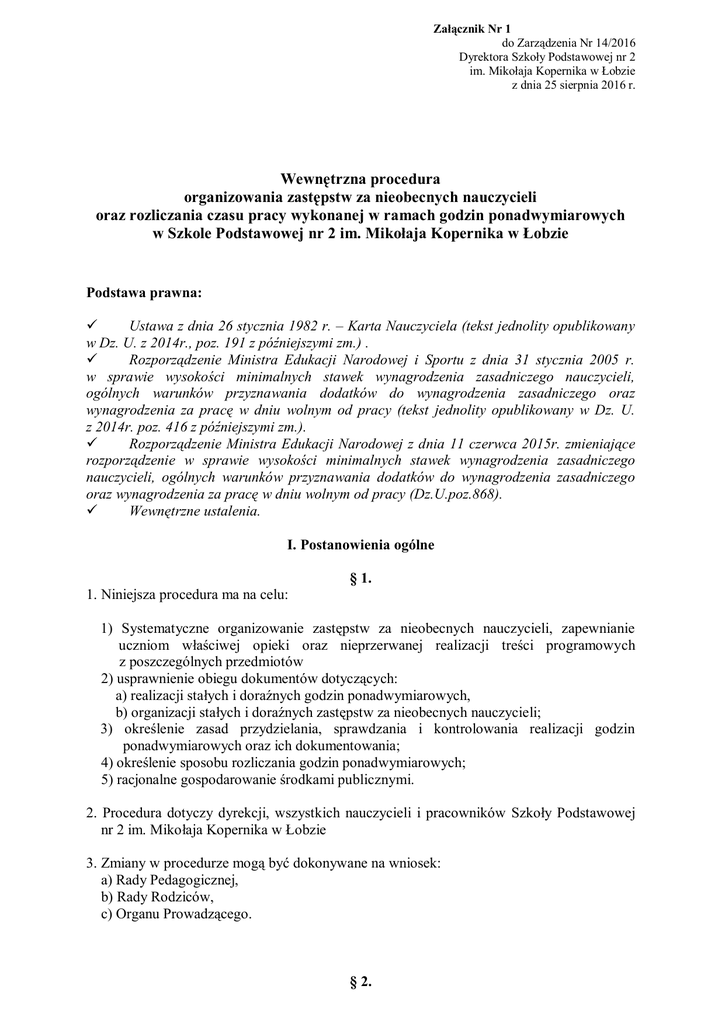 Załącznik Nr 1 do Zarządzenia Nr 14/2016 Dyrektora Szkoły Podstawowej nr 2 im. Mikołaja Kopernika w Łobzie z dnia 25 sierpnia 2016 r. Wewnętrzna procedura organizowania zastępstw za nieobecnych nauczycieli oraz rozliczania czasu pracy wykonanej w ramach godzin ponadwymiarowych w Szkole Podstawowej nr 2 im. Mikołaja Kopernika w Łobzie Podstawa prawna: Ustawa z dnia 26 stycznia 1982 r. – Karta Nauczyciela (tekst jednolity opublikowany w Dz. U. z 2014r., poz. 191 z późniejszymi zm.) . Rozporządzenie Ministra Edukacji Narodowej i Sportu z dnia 31 stycznia 2005 r. w sprawie wysokości minimalnych stawek wynagrodzenia zasadniczego nauczycieli, ogólnych warunków przyznawania dodatków do wynagrodzenia zasadniczego oraz wynagrodzenia za pracę w dniu wolnym od pracy (tekst jednolity opublikowany w Dz. U. z 2014r. poz. 416 z późniejszymi zm.). Rozporządzenie Ministra Edukacji Narodowej z dnia 11 czerwca 2015r. zmieniające rozporządzenie w sprawie wysokości minimalnych stawek wynagrodzenia zasadniczego nauczycieli, ogólnych warunków przyznawania dodatków do wynagrodzenia zasadniczego oraz wynagrodzenia za pracę w dniu wolnym od pracy (Dz.U.poz.868). Wewnętrzne ustalenia. I. Postanowienia ogólne § 1. 1. Niniejsza procedura ma na celu: 1) Systematyczne organizowanie zastępstw za nieobecnych nauczycieli, zapewnianie uczniom właściwej opieki oraz nieprzerwanej realizacji treści programowych z poszczególnych przedmiotów 2) usprawnienie obiegu dokumentów dotyczących: a) realizacji stałych i doraźnych godzin ponadwymiarowych, b) organizacji stałych i doraźnych zastępstw za nieobecnych nauczycieli; 3) określenie zasad przydzielania, sprawdzania i kontrolowania realizacji godzin ponadwymiarowych oraz ich dokumentowania; 4) określenie sposobu rozliczania godzin ponadwymiarowych; 5) racjonalne gospodarowanie środkami publicznymi. 2. Procedura dotyczy dyrekcji, wszystkich nauczycieli i pracowników Szkoły Podstawowej nr 2 im. Mikołaja Kopernika w Łobzie 3. Zmiany w procedurze mogą być dokonywane na wniosek: a) Rady Pedagogicznej, b) Rady Rodziców, c) Organu Prowadzącego. § 2. 1. Definicje przedmiotu procedury: 1) Przez godzinę ponadwymiarową rozumie się przydzieloną nauczycielowi godzinę zajęć dydaktycznych, wychowawczych lub opiekuńczych powyżej tygodniowego obowiązkowego wymiaru godzin zajęć dydaktycznych, wychowawczych lub opiekuńczych (tzw. godziny stałe) a) Nauczyciel może być obowiązany do podjęcia pracy w godzinach ponadwymiarowych, których liczba nie może przekroczyć ¼ tygodniowego obowiązkowego wymiaru godzin zajęć dla danego nauczyciela. b) Przydzielenie większej liczby godzin ponadwymiarowych może nastąpić wyłącznie za jego zgodą. c) Ogólny wymiar godzin ponadwymiarowych przypadający na jednego nauczyciela nie może przekroczyć ½ tygodniowego obowiązkowego wymiaru godzin zajęć dla danego nauczyciela. d) Godziny ponadwymiarowe nauczycielowi realizującemu awans zawodowy, wychowującemu dziecko do lat 4 oraz ciężarnej przydziela się wyłącznie za jego zgodą 2) Przez godzinę doraźnego zastępstwa rozumie się przydzieloną nauczycielowi godzinę zajęć dydaktycznych, wychowawczych lub opiekuńczych powyżej tygodniowego obowiązkowego wymiaru godzin zajęć dydaktycznych, wychowawczych lub opiekuńczych, której realizacja następuje w zastępstwie nieobecnego nauczyciela. 2. W ramach 40-godzinnego tygodnia pracy nauczyciele zobowiązani są do: 1) prowadzenia zajęć zgodnie z przydziałem czynności 2) realizacji zadań statutowych szkoły, w tym w szczególności: - udział w posiedzeniach Rad Pedagogicznych, - organizacja i prowadzenie spotkań z rodzicami uczniów, - organizacja imprez, uroczystości, zawodów sportowych i konkursów, - organizacja wycieczek, biwaków, - pełnienie dyżurów podczas przerw międzylekcyjnych, - uczestnictwo w pracach komisji egzaminacyjnych i zespołów nadzorujących przebieg egzaminów, - pracę w zespołach samokształceniowych, 3) zajęć i czynności związanych z przygotowaniem się do zajęć, samokształceniem i doskonaleniem zawodowym. 4). Inne czynności i zajęcia wynikające z zadań statutowych szkoły: - zajęcia wyrównawcze, - koła zainteresowań, - zajęcia artystyczne, - realizację autorskich projektów edukacyjnych, - zajęcia przygotowujące uczniów do udziału w konkursach, - zajęcia fakultatywne dla uczniów, - zajęcia wychowawcze o charakterze profilaktycznym, - inne zajęcia z uczniami przydzielone przez dyrektora szkoły. 3. Nauczyciela zatrudnionego w pełnym wymiarze zajęć obowiązuje pięciodniowy tydzień pracy bez względu na rozkład zajęć dydaktycznych przypadających do realizacji w poszczególnych dniach tygodnia. Zajęcia dydaktyczne przydzielone do realizacji w ciągu czterech dni tygodnia nie oznaczają czterodniowego tygodnia pracy, takiego nauczyciela obowiązuje pięciodniowy tydzień pracy (dyspozycyjność przez pięć dni w tygodniu). II. Opis działań i obowiązki osób realizujących zadania będące przedmiotem procedury § 3. 1. Nauczyciel jest zobowiązany do niezwłocznego powiadomienia sekretariatu szkoły o swojej nieobecności spowodowanej chorobą lub zdarzeniem losowym (jeśli to możliwe dzień wcześniej lub przed godziną 8.00 w dniu, w którym powinien stawić się do pracy). 2. Nauczyciel jest zobowiązany do poinformowania dyrektora na piśmie, co najmniej tydzień wcześniej, o zaplanowanej nieobecności np. wyjazd służbowy, udział w szkoleniu, wycieczką klasową (karta wycieczki) i in. 3. W uzasadnionych dobrem uczniów przypadkach, dyrektor ma prawo odmówić wydania zgody na nieobecność nauczyciela z powyższych przyczyn, jeśli uzna, że nie ma możliwości zapewnienia zastępstwa lub nieobecność nauczyciela znacząco zakłóci pracę szkoły. 4. Przydziału godzin ponadwymiarowych nauczycielom dokonuje dyrektor szkoły na podstawie zatwierdzonego na dany rok szkolny arkusza organiza