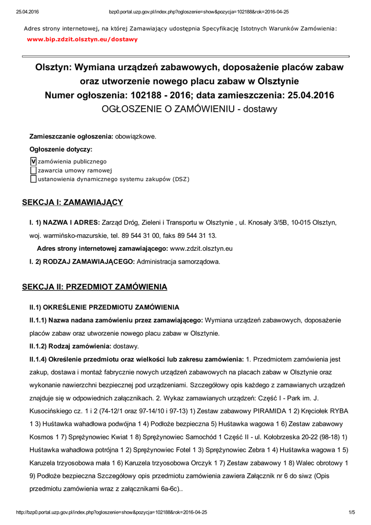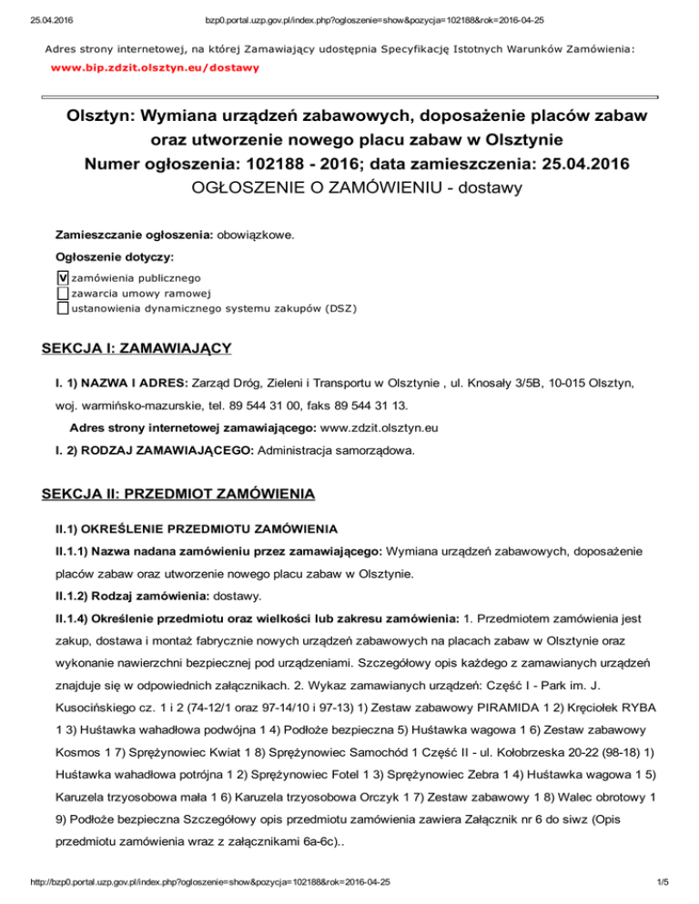 25.04.2016 bzp0.portal.uzp.gov.pl/index.php?ogloszenie=show&pozycja=102188&rok=20160425 Adres strony internetowej, na której Zamawiający udostępnia Specyfikację Istotnych Warunków Zamówienia: www.bip.zdzit.olsztyn.eu/dostawy Olsztyn: Wymiana urządzeń zabawowych, doposażenie placów zabaw oraz utworzenie nowego placu zabaw w Olsztynie Numer ogłoszenia: 102188 2016; data zamieszczenia: 25.04.2016 OGŁOSZENIE O ZAMÓWIENIU dostawy Zamieszczanie ogłoszenia: obowiązkowe. Ogłoszenie dotyczy: V zamówienia publicznego zawarcia umowy ramowej ustanowienia dynamicznego systemu zakupów (DSZ) SEKCJA I: ZAMAWIAJĄCY I. 1) NAZWA I ADRES: Zarząd Dróg, Zieleni i Transportu w Olsztynie , ul. Knosały 3/5B, 10015 Olsztyn, woj. warmińskomazurskie, tel. 89 544 31 00, faks 89 544 31 13. Adres strony internetowej zamawiającego: www.zdzit.olsztyn.eu I. 2) RODZAJ ZAMAWIAJĄCEGO: Administracja samorządowa. SEKCJA II: PRZEDMIOT ZAMÓWIENIA II.1) OKREŚLENIE PRZEDMIOTU ZAMÓWIENIA II.1.1) Nazwa nadana zamówieniu przez zamawiającego: Wymiana urządzeń zabawowych, doposażenie placów zabaw oraz utworzenie nowego placu zabaw w Olsztynie. II.1.2) Rodzaj zamówienia: dostawy. II.1.4) Określenie przedmiotu oraz wielkości lub zakresu zamówienia: 1. Przedmiotem zamówienia jest zakup, dostawa i montaż fabrycznie nowych urządzeń zabawowych na placach zabaw w Olsztynie oraz wykonanie nawierzchni bezpiecznej pod urządzeniami. Szczegółowy opis każdego z zamawianych urządzeń znajduje się w odpowiednich załącznikach. 2. Wykaz zamawianych urządzeń: Część I Park im. J. Kusocińskiego cz. 1 i 2 (7412/1 oraz 9714/10 i 9713) 1) Zestaw zabawowy PIRAMIDA 1 2) Kręciołek RYBA 1 3) Huśtawka wahadłowa podwójna 1 4) Podłoże bezpieczna 5) Huśtawka wagowa 1 6) Zestaw zabawowy Kosmos 1 7) Sprężynowiec Kwiat 1 8) Sprężynowiec Samochód 1 Część II ul. Kołobrzeska 2022 (9818) 1) Huśtawka wahadłowa potrójna 1 2) Sprężynowiec Fotel 1 3) Sprężynowiec Zebra 1 4) Huśtawka wagowa 1 5) Karuzela trzyosobowa mała 1 6) Karuzela trzyosobowa Orczyk 1 7) Zestaw zabawowy 1 8) Walec obrotowy 1 9) Podłoże bezpieczna Szczegółowy opis przedmiotu zamówienia zawiera Załącznik nr 6 do siwz (Opis przedmiotu zamówienia wraz z załącznikami 6a6c).. http://bzp0.portal.uzp.gov.pl/index.php?ogloszenie=show&pozycja=102188&rok=20160425 1/5 25.04.2016 bzp0.portal.uzp.gov.pl/index.php?ogloszenie=show&pozycja=102188&rok=20160425 II.1.5) przewiduje się udzielenie zamówień uzupełniających Określenie przedmiotu oraz wielkości lub zakresu zamówień uzupełniających II.1.6) Wspólny Słownik Zamówień (CPV): 37.53.52.009, 45.11.27.208. II.1.7) Czy dopuszcza się złożenie oferty częściowej: tak, liczba części: 2. II.1.8) Czy dopuszcza się złożenie oferty wariantowej: nie. II.2) CZAS TRWANIA ZAMÓWIENIA LUB TERMIN WYKONANIA: Okres w dniach: 60. SEKCJA III: INFORMACJE O CHARAKTERZE PRAWNYM, EKONOMICZNYM, FINANSOWYM I TECHNICZNYM III.1) WADIUM Informacja na temat wadium: Nie dotyczy III.2) ZALICZKI III.3) WARUNKI UDZIAŁU W POSTĘPOWANIU ORAZ OPIS SPOSOBU DOKONYWANIA OCENY SPEŁNIANIA TYCH WARUNKÓW III. 3.1) Uprawnienia do wykonywania określonej działalności lub czynności, jeżeli przepisy prawa nakładają obowiązek ich posiadania Opis sposobu dokonywania oceny spełniania tego warunku Zamawiający nie dokonuje szczegółowego opisu sposobu dokonywania oceny spełniania ww. warunku udziału w postępowaniu. III.3.2) Wiedza i doświadczenie Opis sposobu dokonywania oceny spełniania tego warunku Zamawiający nie dokonuje szczegółowego opisu sposobu dokonywania oceny spełniania ww. warunku udziału w postępowaniu. III.3.3) Potencjał techniczny Opis sposobu dokonywania oceny spełniania tego warunku Zamawiający nie dokonuje szczegółowego opisu sposobu dokonywania oceny spełniania ww. warunku udziału w postępowaniu. III.3.4) Osoby zdolne do wykonania zamówienia Opis sposobu dokonywania oceny spełniania tego warunku Zamawiający nie dokonuje szczegółowego opisu sposobu dokonywania oceny spełniania ww. warunku udziału w postępowaniu. III.3.5) Sytuacja ekonomiczna i finansowa Opis sposobu dokonywania oceny spełniania tego warunku Zamawiający nie dokonuje szczegółowego opisu sposobu dokonywania oceny spełniania ww. warunku udziału w postępowaniu. http://bzp0.portal.uzp.gov.pl/index.php?ogloszenie=show&pozycja=102188&rok=20160425 2/5 25.04.2016 bzp0.portal.uzp.gov.pl/index.php?ogloszenie=show&pozycja=102188&rok=20160425 III.4) INFORMACJA O OŚWIADCZENIACH LUB DOKUMENTACH, JAKIE MAJĄ DOSTARCZYĆ WYKONAWCY W CELU POTWIERDZENIA SPEŁNIANIA WARUNKÓW UDZIAŁU W POSTĘPOWANIU ORAZ NIEPODLEGANIA WYKLUCZENIU NA PODSTAWIE ART. 24 UST. 1 USTAWY III.4.1) W zakresie wykazania spełniania przez wykonawcę warunków, o których mowa w art. 22 ust. 1 ustawy, oprócz oświadczenia o spełnianiu warunków udziału w postępowaniu należy przedłożyć: III.4.2) W zakresie potwierdzenia niepodlegania wykluczeniu na podstawie art. 24 ust. 1 ustawy, należy przedłożyć: oświadczenie o braku podstaw do wykluczenia; aktualny odpis z właściwego rejestru lub z centralnej ewidencji i informacji o działalności gospodarczej, jeżeli odrębne przepisy wymagają wpisu do rejestru lub ewidencji, w celu wykazania braku podstaw do wykluczenia w oparciu o art. 24 ust. 1 pkt 2 ustawy, wystawiony nie wcześniej niż 6 miesięcy przed upływem terminu składania wniosków o dopuszczenie do udziału w postępowaniu o udzielenie zamówienia albo składania ofert; III.4.3) Dokumenty podmiotów zagranicznych Jeżeli wykonawca ma siedzibę lub miejsce zamieszkania poza terytorium Rzeczypospolitej Polskiej, przedkłada: III.4.3.1) dokument wystawiony w kraju, w którym ma siedzibę lub miejsce zamieszkania potwierdzający, że: nie otwarto jego likwidacji ani nie ogłoszono upadłości wystawiony nie wcześniej niż 6 miesięcy przed upływem terminu składania wniosków o dopuszczenie do udziału w p
