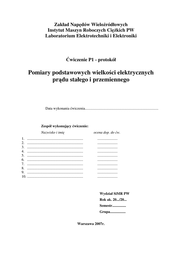 Zakład Napędów Wieloźródłowych Instytut Maszyn Roboczych CięŜkich PW Laboratorium Elektrotechniki i Elektroniki Ćwiczenie P1 - protokół Pomiary podstawowych wielkości elektrycznych prądu stałego i przemiennego Data wykonania ćwiczenia................................................................................ Zespół wykonujący ćwiczenie: Nazwisko i imię ocena dop. do ćw. 1. ............................................................. 2. ............................................................. 3. ............................................................. 4. ............................................................. 5. ............................................................. 6. ............................................................. 7. ............................................................. 8. ............................................................. 9. ............................................................. 10. ............................................................. ...................... ...................... ...................... ...................... ...................... ...................... ...................... ...................... ...................... ...................... Wydział SiMR PW Rok ak. 20.../20... Semestr............... Grupa................. Warszawa 2007r. 1 Pomiary 1.1 Skalowanie ustroju magnetoelektrycznego w układzie woltomierza Ustrój magnetoelektryczny o parametrach: Rwe = Ω, Imax = A, klasa = Obliczyć rezystancję dodatkową, aby miernikiem moŜna mierzyć napięcia: U1 = V; U2 = V Rd1 = Ω; Rd2 = Ω. Zestawić układ pomiarowy wg poniŜszego schematu i wykonać skalowanie miernika magnetoelektrycznego jako woltomierza. Rys. 1. Schemat układu pomiarowego do skalowania miernika magnetoelektrycznego jako woltomierza. Oznaczenia: E – źródło napięcia stałego; R – rezystor; Vw – woltomierz wzorcowy; Rd - rezystor dodatkowy; Vb – miernik skalowany. Skalowanie naleŜy wykonać dla rosnących i malejących wartości napięć. Tablica 1. Skalowanie miernika magnetoelektrycznego jako woltomierza Lp. Napięcie rosnące Napięcie malejące Uw Ub Uw Ub ∆u p=-∆u ∆u V V V V V V V Na podstawie pomiarów wykreślić zaleŜności: Ub = f(Uw) i ∆u = f(Uw) p=-∆u V 1.2 Skalowanie ustroju magnetoelektrycznego w układzie amperomierza Ustrój magnetoelektryczny o parametrach: Rw = Ω, Imax = A, klasa = Obliczyć rezystancję bocznika, aby miernikiem moŜna mierzyć prądy: I1 = A; I2 = A Ω; Rb2 = Ω. Rb1 = Zestawić układ pomiarowy wg poniŜszego schematu i wykonać skalowanie miernika magnetoelektrycznego jako amperomierza. Rys. 2. Schemat układu pomiarowego do skalowania miernika magnetoelektrycznego jako amperomierza. Oznaczenia: E – źródło napięcia stałego; R – rezystor; Aw – amperomierz wzorcowy; Rb – bocznik; Ab – miernik skalowany Skalowanie naleŜy wykonać dla rosnących i malejących wartości prądu. Tablica 2. Skalowanie miernika magnetoelektrycznego jako amperomierza Lp. Prąd rosnący Prąd malejący Iw Ib Iw Ib ∆I p=-∆I ∆I A A A A A A A Na podstawie pomiarów wykreślić zaleŜności: Ib = f(Iw) i ∆I = f(Iw) p=-∆I A 1.3 Skalowanie ustroju elektromagnetycznego Zestawić układ pomiarowy wg poniŜszego schematu: Rys. 3. Schemat układu pomiarowego do skalowania mierników elektromagnetycznych. Oznaczenia: AT – autotransformator; Pp – przekładnik prądowy; Pn – przekładnik napięciowy; Aw - amperomierz wzorcowy (Iw); Ab – amperomierz skalowany (Ib); Vw – woltomierz wzorcowy (Uw); Vb – woltomierz skalowany (Ub); R0 = obciąŜenie. Skalowanie naleŜy wykonać dla szeregu wartości napięcia (prądu). Tablica 3. Skalowanie mierników elektromagnetycznych Przekładnie: kI = Uw Lp. V Ub V A/A; ku = kuUb ∆u V V Iw A Na podstawie pomiarów wykreślić zaleŜności: kuUb = f(Uw), ∆I = f(Iw). V/V. Ib A kIIb A ∆I A kIIb = f(Iw), ∆u = f(Uw) oraz 1.4 Pomiar rezystancji Zestawić układ pomiarowy zgodnie ze schematem przedstawionym na rys. 4. Rys. 4. Schemat układu do pomiaru rezystancji metodą techniczną. Oznaczenia: R – rezystor regulacyjny; A – amperomierz magnetoelektryczny; V – woltomierz magnetoelektryczny; W - wyłącznik; RX – rezystancja mierzona; P – przełącznik Dla kaŜdego badanego rezystora naleŜy wykonać pomiary przy połoŜeniu przełącznika w pozycji I i II. Pomiary wykonać dla dwóch wartości prądu (regulacja rezystorem R), wyniki pomiarów i obliczeń wpisać do tablicy 4. Tablica 4. Element Pozycja badany przełącznika RX1 I II RX2 I II RX3 I II RX4 I II UV [V] IA [A] RV RA RX pV [Ω] pA R’X R’Xśr 1.5 Pomiar impedancji, indukcyjności i pojemności Połączyć układ pomiarowy zgodnie ze schematem przedstawionym na rys. 5. Rys. 5. Schemat układu do pomiaru impedancji, indukcyjności, rezystancji i pojemności. Oznaczenia: Z - element badany; A – amperomierz; V – woltomierz; W – watomierz; AT - autotransformator. Dla kaŜdego badanego elementu naleŜy wykonać po dwa pomiary dla róŜnych napięć zasilających (nastawień autotransformatora). Wyniki pomiarów i obliczeń wpisać do tablicy 5. Tablica 5. Element badany Z1 U [V] I [A] P [W] Z R XL [Ω] XC Z2 Z3 Z4 Z5 Z6 Z7 Z8 Sprawdzenie: przy szeregowym połączeniu elementów: Zpomierzone = .................Ω, Zobliczone jako Z = ΣR 2 + ΣX 2 L [H] C [µF] Lśr [H] Cśr [µF]