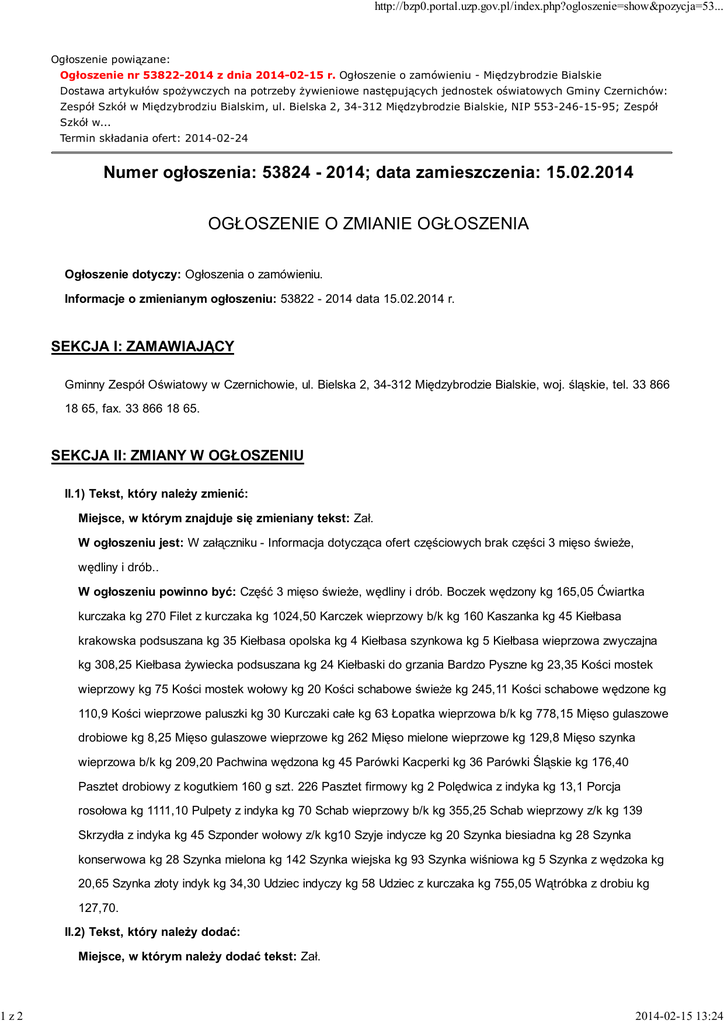 1z2 http://bzp0.portal.uzp.gov.pl/index.php?ogloszenie=show&pozycja=53... Ogłoszenie powiązane: Ogłoszenie nr 53822-2014 z dnia 2014-02-15 r. Ogłoszenie o zamówieniu - Międzybrodzie Bialskie Dostawa artykułów spożywczych na potrzeby żywieniowe następujących jednostek oświatowych Gminy Czernichów: Zespół Szkół w Międzybrodziu Bialskim, ul. Bielska 2, 34-312 Międzybrodzie Bialskie, NIP 553-246-15-95; Zespół Szkół w... Termin składania ofert: 2014-02-24 Numer ogłoszenia: 53824 - 2014; data zamieszczenia: 15.02.2014 OGŁOSZENIE O ZMIANIE OGŁOSZENIA Ogłoszenie dotyczy: Ogłoszenia o zamówieniu. Informacje o zmienianym ogłoszeniu: 53822 - 2014 data 15.02.2014 r. SEKCJA I: ZAMAWIAJĄCY Gminny Zespół Oświatowy w Czernichowie, ul. Bielska 2, 34-312 Międzybrodzie Bialskie, woj. śląskie, tel. 33 866 18 65, fax. 33 866 18 65. SEKCJA II: ZMIANY W OGŁOSZENIU II.1) Tekst, który należy zmienić: Miejsce, w którym znajduje się zmieniany tekst: Zał. W ogłoszeniu jest: W załączniku - Informacja dotycząca ofert częściowych brak części 3 mięso świeże, wędliny i drób.. W ogłoszeniu powinno być: Część 3 mięso świeże, wędliny i drób. Boczek wędzony kg 165,05 Ćwiartka kurczaka kg 270 Filet z kurczaka kg 1024,50 Karczek wieprzowy b/k kg 160 Kaszanka kg 45 Kiełbasa krakowska podsuszana kg 35 Kiełbasa opolska kg 4 Kiełbasa szynkowa kg 5 Kiełbasa wieprzowa zwyczajna kg 308,25 Kiełbasa żywiecka podsuszana kg 24 Kiełbaski do grzania Bardzo Pyszne kg 23,35 Kości mostek wieprzowy kg 75 Kości mostek wołowy kg 20 Kości schabowe świeże kg 245,11 Kości schabowe wędzone kg 110,9 Kości wieprzowe paluszki kg 30 Kurczaki całe kg 63 Łopatka wieprzowa b/k kg 778,15 Mięso gulaszowe drobiowe kg 8,25 Mięso gulaszowe wieprzowe kg 262 Mięso mielone wieprzowe kg 129,8 Mięso szynka wieprzowa b/k kg 209,20 Pachwina wędzona kg 45 Parówki Kacperki kg 36 Parówki Śląskie kg 176,40 Pasztet drobiowy z kogutkiem 160 g szt. 226 Pasztet firmowy kg 2 Polędwica z indyka kg 13,1 Porcja rosołowa kg 1111,10 Pulpety z indyka kg 70 Schab wieprzowy b/k kg 355,25 Schab wieprzowy z/k kg 139 Skrzydła z indyka kg 45 Szponder wołowy z/k kg10 Szyje indycze kg 20 Szynka biesiadna kg 28 Szynka konserwowa kg 28 Szynka mielona kg 142 Szynka wiejska kg 93 Szynka wiśniowa kg 5 Szynka z wędzoka kg 20,65 Szynka złoty indyk kg 34,30 Udziec indyczy kg 58 Udziec z kurczaka kg 755,05 Wątróbka z drobiu kg 127,70. II.2) Tekst, który należy dodać: Miejsce, w którym należy dodać tekst: Zał. 2014-02-15 13:24 2z2 http://bzp0.portal.uzp.gov.pl/index.php?ogloszenie=show&pozycja=53... Tekst, który należy dodać w ogłoszeniu: Część 3 mięso świeże, wędliny i drób Boczek wędzony kg 165,05 Ćwiartka kurczaka kg 270 Filet z kurczaka kg 1024,50 Karczek wieprzowy b/k kg 160 Kaszanka kg 45 Kiełbasa krakowska podsuszana kg 35 Kiełbasa opolska kg 4 Kiełbasa szynkowa kg 5 Kiełbasa wieprzowa zwyczajna kg 308,25 Kiełbasa żywiecka podsuszana kg 24 Kiełbaski do grzania Bardzo Pyszne kg 23,35 Kości mostek wieprzowy kg 75 Kości mostek wołowy kg 20 Kości schabowe świeże kg 245,11 Kości schabowe wędzone kg 110,9 Kości wieprzowe paluszki kg 30 Kurczaki całe kg 63 Łopatka wieprzowa b/k kg 778,15 Mięso gulaszowe drobiowe kg 8,25 Mięso gulaszowe wieprzowe kg 262 Mięso mielone wieprzowe kg 129,8 Mięso szynka wieprzowa b/k kg 209,20 Pachwina wędzona kg 45 Parówki Kacperki kg 36 Parówki Śląskie kg 176,40 Pasztet drobiowy z kogutkiem 160 g szt. 226 Pasztet firmowy kg 2 Polędwica z indyka kg 13,1 Porcja rosołowa kg 1111,10 Pulpety z indyka kg 70 Schab wieprzowy b/k kg 355,25 Schab wieprzowy z/k kg 139 Skrzydła z indyka kg 45 Szponder wołowy z/k kg10 Szyje indycze kg 20 Szynka biesiadna kg 28 Szynka konserwowa kg 28 Szynka mielona kg 142 Szynka wiejska kg 93 Szynka wiśniowa kg 5 Szynka z wędzoka kg 20,65 Szynka złoty indyk kg 34,30 Udziec indyczy kg 58 Udziec z kurczaka kg 755,05 Wątróbka z drobiu kg 127,70. 2014-02-15 13:24