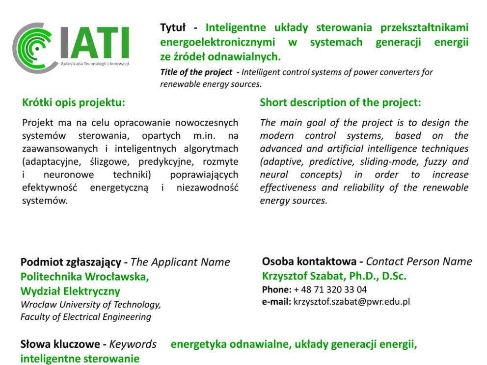 Tytuł - Inteligentne układy sterowania przekształtnikami energoelektronicznymi w systemach generacji energii ze źródeł odnawialnych. Title of the project - Intelligent control systems of power converters for renewable energy sources. Krótki opis projektu: Short description of the project: Projekt ma na celu opracowanie nowoczesnych systemów sterowania, opartych m.in. na zaawansowanych i inteligentnych algorytmach (adaptacyjne, ślizgowe, predykcyjne, rozmyte i neuronowe techniki) poprawiających efektywność energetyczną i niezawodność systemów. The main goal of the project is to design the modern control systems, based on the advanced and artificial intelligence techniques (adaptive, predictive, sliding-mode, fuzzy and neural concepts) in order to increase effectiveness and reliability of the renewable energy sources. Podmiot zgłaszający - The Applicant Name Politechnika Wrocławska, Wydział Elektryczny Osoba kontaktowa - Contact Person Name Krzysztof Szabat, Ph.D., D.Sc. Wroclaw University of Technology, Faculty of Electrical Engineering Słowa kluczowe - Keywords inteligentne sterowanie Phone: + 48 71 320 33 04 e-mail: [email protected] energetyka odnawialne, układy generacji energii, Tytuł - Title of the project Inteligentne układy sterowania przekształtnikami energoelektronicznymi w systemach generacji energii ze źródeł odnawialnych. Intelligent control systems of power converters for renewable energy sources. Efekt końcowy projektu: The Final Result of the Project: Zaawansowane algorytmy sterowania. Advanced control algorithms. Adresaci projektu Type of Beneficient Firmy z branży energetyki odnawialnej, Wytwórcy generatorów elektrycznych, Projektanci systemów sterowania. Companies from the renewable energy sector, Manufacturers of electric generators, Designers of control systems. Tytuł - Title of the project Inteligentne układy sterowania przekształtnikami energoelektronicznymi w systemach generacji energii ze źródeł odnawialnych. Intelligent control systems of power converters for renewable energy sources. Oczekiwane korzyści: Advantages from the Implementation: • • • • Wzrost efektywności energetycznej procesu przekształcania energii, Zwiększenie niezawodności układów generacji energii, Zwiększenie odporności układów generacji na zakłócenia zewnętrzne. • • Increasing energetic efficiency in the process of energy conversion, Increasing the reliability of power generation systems, Increasing the robustness of generation systems to external disturbances. Tytuł - Title of the project Inteligentne układy sterowania przekształtnikami energoelektronicznymi w systemach generacji energii ze źródeł odnawialnych. Intelligent control systems of power converters for renewable energy sources. Wstępny kosztorys : Wynagrodzenia wykonawców: Aparatura/oprogramowania: Usługi zewnętrzne: Koszty Operacyjne: Koszty ogólne PWr [20%]: OGÓŁEM: Udział własny [20%] The Cost Estimation: 1 750 000 PLN 1 800 000 PLN 700 000 PLN 500 000 PLN 950 000 PLN 5 700 000 PLN 1 140 000 PLN TOTAL : Own Cost Contribution 437 500 € 450 000 € 175 000 € 125 000 € 237 500 € 1 425 000 € 285 000 € Project Timetable Terminarz Początek Zakończenie Czas trwania Salaries, wages: Equipment /Software: External services: Operation Costs: Overhead costs PWr [20%]: – 15.01.2016 – 15.01.2019 – 36 miesięcy Start date The end date Duration – 15.01.2016 – 15.01.2019 – 36 months