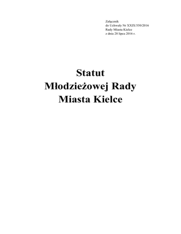 Załącznik do Uchwały Nr XXIX/550/2016 Rady Miasta Kielce z dnia 28 lipca 2016 r. Statut Młodzieżowej Rady Miasta Kielce Rozdział I Postanowienia ogólne § 1. Statut określa tryb wyboru i zasady działania Młodzieżowej Rady Miasta Kielce. § 2. Ilekroć w Statucie jest mowa o: 1) Mieście – należy przez to rozumieć Miasto Kielce 2) Radzie Miasta – należy przez to rozumieć Radę Miasta Kielce; 3) Prezydencie – należy przez to rozumieć Prezydenta Miasta Kielce; 4) Młodzieżowej Radzie – należy przez to rozumieć Młodzieżową Radę Miasta Kielce; 5) Komisji – należy przez to rozumieć Komisję Młodzieżowej Rady; 6) Szkole – należy przez to rozumieć publiczną i niepubliczną na prawach publicznych szkołę gimnazjalną oraz ponadgimnazjalną mającą siedzibę w Kielcach; 7) Wyborach – należy przez to rozumieć wybory na radnych Młodzieżowej Rady; 8) Przewodniczącym – należy przez to rozumieć Przewodniczącego Młodzieżowej Rady; 9) Wiceprzewodniczącym – należy przez to rozumieć Wiceprzewodniczącego Młodzieżowej Rady; 10) Przewodniczącym Komisji – należy przez to rozumieć Przewodniczącego Komisji Młodzieżowej Rady; 11) Radnym – należy przez to rozumieć Radnego Młodzieżowej Rady; 12) Statucie – należy przez to rozumieć Statut Młodzieżowej Rady. 1. 2. 3. 4. 5. 6. § 3. Siedzibą Młodzieżowej Rady jest Miasto Kielce. Młodzieżowa Rada ma charakter konsultacyjny i stanowi apolityczną reprezentację uczniów szkół nie związaną z żadną partią polityczną i z żadnym ugrupowaniem politycznym. Młodzieżowa Rada prowadzi swoją działalność statutową nieodpłatnie i Radnym nie przysługują diety i ekwiwalent pieniężny. Prezydent zapewnia warunki lokalowe oraz obsługę administracyjną Młodzieżowej Rady. Młodzieżowa Rada posługuje się pieczęcią z napisem: „Młodzieżowa Rada Miasta Kielce”, do której używania uprawniony jest Przewodniczący. Młodzieżowa Rada posiada logo, którego mają prawo używać Radni. Rozdział II Cele i zadania Młodzieżowej Rady § 4. Celem działania Młodzieżowej Rady jest: 1) upowszechnianie idei samorządowej wśród młodzieży Miasta; 2) wspieranie aktywności młodzieży Miasta; 3) umożliwienie uczestnictwa młodzieży w procesie podejmowania decyzji bezpośrednio wpływających na sposób i jakość jej życia; 4) kształtowanie i utrwalanie postaw demokratycznych, obywatelskich i patriotycznych; 5) promocja kultury, szczególnie tworzonej przez młodzież i do niej adresowanej; 6) współpraca i integracja twórczych środowisk młodzieżowych; 7) wspieranie działalności wolontariackiej i charytatywnej młodzieży; 8) obrona praw i godności ucznia. § 5. 1. Młodzieżowa Rada realizuje swoje cele poprzez realizację kadencyjnego programu działania Młodzieżowej Rady, w tym w szczególności poprzez: 1) wyrażanie opinii w sprawach dotyczących młodzieży; 2) inicjowanie działań dotyczących życia młodzieży w mieście, a w szczególności w zakresie edukacji, sportu, nauki, kultury i ochrony środowiska; 3) organizowanie imprez i spotkań propagujących cele Młodzieżowej Rady; 4) współpracę z samorządami uczniowskimi szkół, Młodzieżowymi Radami innych miast w Polsce i poza Jej granicami; 5) prowadzenie działalności informacyjno-doradczej dla młodzieży; 6) organizowanie szkoleń dla młodzieży; 7) uczestnictwo swoich przedstawicieli w procesie podejmowania decyzji mających bezpośredni wpływ na warunki rozwoju młodzieży. 2. Do zadań Młodzieżowej Rada należy także: 1) uchwalenie kadencyjnego programu działania Młodzieżowej Rady; 2) powoływanie i odwoływanie Komisji, określenie jej liczebności, a także określenie jej zadań; 3) wybór oraz odwoływanie przewodniczącego, wiceprzewodniczących; 4) przedstawianie opinii w sprawach dotyczących młodzieży wobec Rady Miasta i Prezydenta; 5) przyjmowanie sprawozdań z działalności Przewodniczącego, Wiceprzewodniczących i Przewodniczących Komisji; 6) podejmowanie uchwał w sprawie wygaśnięcia mandatu Radnego; 7) proponowanie zmian w Statucie. Rozdział III Organizacja Młodzieżowej Rady § 6. 1. Kadencja Młodzieżowej Rady trwa jeden rok licząc od dnia wyborów. 2. W skład Młodzieżowej Rady wchodzą Radni wybierani w Szkołach. § 7. 1. Młodzieżowa Rada wybiera ze swego grona Przewodniczącego i dwóch Wiceprzewodniczących bezwzględną większością głosów w obecności, co najmniej połowy składu Młodzieżowej Rady w głosowaniu tajnym, na pierwszej sesji zwołanej po Wyborach. 2. Do czasu wyboru Przewodniczącego i Wiceprzewodniczących sesje Młodzieżowej Rady prowadzi Radny najstarszy wiekiem, który wyrazi zgodę na prowadzenie sesji. § 8. 1. Do obowiązków Przewodniczącego należy organizowanie pracy Młodzieżowej Rady oraz prowadzenie obrad Młodzieżowej Rady. 2. Przewodniczący może wyznaczyć do wykonywania swoich zadań jednego z Wiceprzewodniczących. 3. W przypadku nieobecności Przewodniczącego i niewyznaczenia Wiceprzewodniczącego, zadania Przewodniczącego wykonuje Wiceprzewodniczący najstarszy wiekiem. 1. 2. 3. 4. 1. 2. 3. 4. 5. § 9. Wniosek o odwołanie Przewodniczącego lub Wiceprzewodniczącego może wnieść 1/4 Radnych na ręce jednej z osób wymienionych w § 8 Statutu. Wniosek o którym mowa w ust.1 rozpatruje się na sesji następującej po sesji, na której zgłoszono wniosek. Odwołanie Przewodniczącego i Wiceprzewodniczącego następuje w trybie określonym w § 7 ust. 1 Statutu. Odwołany Przewodniczący lub Wiceprzewodniczący pełni swoje obowiązki do czasu wyboru nowego Przewodniczącego lub Wiceprzewodniczącego. § 10. Młodzieżowa Rada obraduje na sesjach zwoływanych przez Przewodniczącego lub Wiceprzewodniczącego. Na pisemny wniosek, co najmniej 1/4 Radnych, Przewodniczącego Rady Miasta lub Prezydenta, zawierający propozycję porządku obrad, Przewodniczący jest zobowiązany w trybie nadzwyczajny