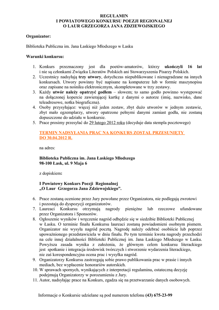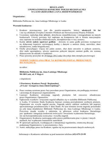REGULAMIN I POWIATOWEGO KONKURSU POEZJI REGIONALNEJ O LAUR GRZEGORZA JANA ZDZIEWOJSKIEGO Organizator: Biblioteka Publiczna im. Jana Łaskiego Młodszego w Łasku Warunki konkursu: 1. Konkurs przeznaczony jest dla poetów-amatorów, którzy ukończyli 16 lat i nie są członkami Związku Literatów Polskich ani Stowarzyszenia Pisarzy Polskich. 2. Uczestnicy nadsyłają trzy utwory, dotychczas niepublikowane i nienagradzane na innych konkursach. Utwory powinny być napisane na komputerze lub w formie maszynopisu oraz zapisane na nośniku elektronicznym, skompletowane w trzy zestawy. 3. Każdy utwór należy opatrzyć godłem – słowem; to samo godło powinno występować na dołączonej kopercie zawierającej kartkę z danymi o autorze (imię, nazwisko, dane teleadresowe, notka biograficzna). 4. Osoby przysyłające: więcej niż jeden zestaw, zbyt dużo utworów w jednym zestawie, zbyt mało egzemplarzy, utwory opatrzone pełnymi danymi zamiast godła, nie zostaną dopuszczone do udziału w konkursie. 5. Prace prosimy przesyłać do 29 lutego 2012 roku (decyduje data stempla pocztowego) TERMIN NADSYŁANIA PRAC NA KONKURS ZOSTAŁ PRZESUNIĘTY DO 30.04.2012 R. na adres: Biblioteka Publiczna im. Jana Łaskiego Młodszego 98-100 Łask, ul. 9 Maja 6 z dopiskiem: I Powiatowy Konkurs Poezji Regionalnej „O Laur Grzegorza Jana Zdziewojskiego”. 6. Prace zostaną ocenione przez Jury powołane przez Organizatora, nie podlegają zwrotowi i pozostają do dyspozycji organizatorów. 7. Laureaci Konkursu otrzymają nagrody pieniężne lub rzeczowe ufundowane przez Organizatora i Sponsorów. 8. Ogłoszenie wyników i wręczenie nagród odbędzie się w siedzibie Biblioteki Publicznej w Łasku. O terminie finału Konkursu laureaci zostaną powiadomieni osobnym pismem. Organizator nie wysyła nagród pocztą. Nagrodę należy odebrać osobiście lub poprzez upoważnionego przedstawiciela w dniu finału. Po tym terminie kwota nagrody przechodzi na cele innej działalności Biblioteki Publicznej im. Jana Łaskiego Młodszego w Łasku. Powyższa zasada wynika z założenia, że głównym celem konkursu literackiego jest spotkanie i integracja środowisk twórczych i stworzenie wydarzenia literackiego, nie zaś korespondencyjna ocena prac i wysyłka nagród. 9. Organizatorzy Konkursu zastrzegają sobie prawo publikowania prac w prasie i innych mediach, bez wypłacenie honorariów autorskich. 10. W sprawach spornych, wynikających z interpretacji regulaminu, ostateczną decyzję podejmują Organizatorzy w porozumieniu z Jury. 11. Autor, nadsyłając prace na Konkurs, zgadza się na przetwarzanie danych osobowych. Informacje o Konkursie udzielane są pod numerem telefonu (43) 675-23-99 Grzegorz Jan Zdziewojski z Łasku zapomniany przez wieki i pokolenia wybitny syn ziemi łaskiej na świat przyszedł w grodzie nad Grabią jako piąty z kolei syn Jakuba i Katarzyny de domo Buczek w dniu 10 marca 1609 roku. Rodzina Zdziewojskich korzenie swe wywodziła z plebsu, a indygenat uzyskała z rąk Hieronima Łaskiego za sprawą wojennych zasług protoplasty rodu Abanusa w początkach XVI wieku. W parze z nobilitacją przyszła i majętność, a przede wszystkim dobra ziemskie, które wiązały się z nadaniami w ziemi sieradzkiej w okolicach Łasku. To miasteczko stało się na okres dwóch wieków (XVI-XVII w.) rodową siedzibą Zdziewojskich, którzy na te tereny przywędrowali z terenów dzisiejszej Słowacji, która wówczas należała do Królestwa Węgier. Pierwszym, który przyszedł na świat w Łasku, był pradziad Grzegorza – Wawrzyniec, urodzony w początkach XVI wieku. Około sto lat później urodził się najwybitniejszy przedstawiciel tej nieznacznej rodziny Grzegorz, który przejawiając szczególny kult Jana Kantego przyjął podczas studiów w Krakowie dla siebie drugie imię – Jan. Karierę naukową rozpoczął już w roku 1615, kiedy w wieku zaledwie sześciu lat podjął naukę w szkole elementarnej w rodzinnym Łasku. Stąd po czterech latach przeniósł się do słynnego na całą Polskę gimnazjum kurzelowskiego, które było podówczas kolonią akademicką Alma Mater i kształciło młodzież na bardzo wysokim poziomie. Po dwóch latach nauki powrócił w rodzinne strony, by kontynuować naukę w Sieradzu. Jednak nie na długo, bowiem już w roku 1623 spotkać go można wśród szkolnej społeczności jezuickiego kolegium w Lublinie, gdzie przebywał do czasu wybuchu epidemii w roku 1625. Stąd, by ratować życie, przeniósł się do innego kolegium prowadzonego przez jezuitów w Kamieńcu Podolskim. Po rocznej nauce „Tandem 1626 pulveris scholastici modestia pertaesus…”, czyli „zupełnie znużony szkolnymi trudami, by dać wytchnienie umysłowi, przebył bardzo rozległe ziemie obcych królestw w orszaku Gabora Bethlena”. Przez dwa lata w towarzystwie węgierskiego posła Stefana Lazara, bliskiego współpracownika Bethlena, młody Grzegorz odbywał podróż po Europie odwiedzając m.in. Wołoszczyznę, Mołdawię, Transylwanię, całe Węgry, Macedonię, Chorwację, Sycylię, Niemcy, Morawy, Śląsk i wiele innych miejsc, których z zachowanych źródeł trudno dziś dociec. Po zakończonej peregrynacji immatrykuluje się w roku 1628 w Akademii Krakowskiej, w której w roku 1631 uzyskuje bakalaureat sztuk wyzwolonych, a następnie od roku 1632 obejmuje kolejno stanowisko kierownika gimnazjum w Kurzelowie, którego był absolwentem oraz szkoły w Pilicy (1633). Po doświadczeniach nauczycielskich następuje zwrot w życiu i karierze łaszczanina. Powraca on do Krakowa, by przyjąć kolejno święcenia kapłańskie, od akolitatu do prezbiteriatu (16331635). Z początkiem lipca 1635 roku rozpoczął posługę kapłańską w rodzinnym Łasku, dokąd powrócił po szesnastu latach nauki i wędrówki. Wróciwszy do ukochanego miasta podjął się obowiązków nie tylko kaznodziei w kościele kolegiackim, ale także sekretarza miejskiego oraz prowadzenia szkoły parafialnej, do któ