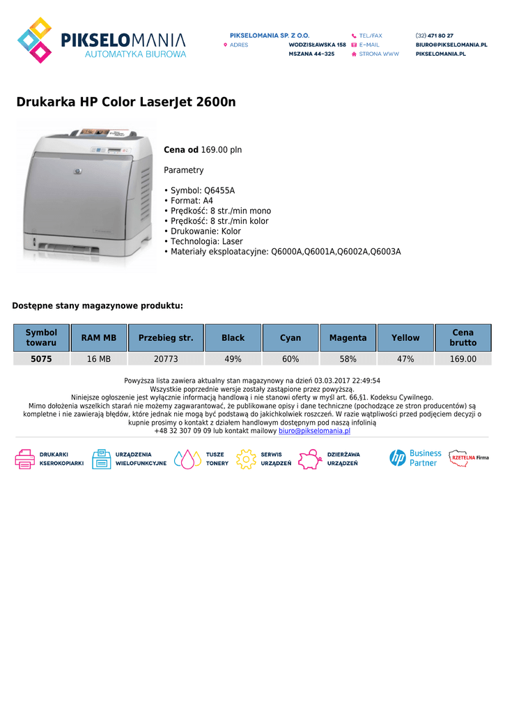 Drukarka HP Color LaserJet 2600n Cena od 169.00 pln Parametry • Symbol: Q6455A • Format: A4 • Prędkość: 8 str./min mono • Prędkość: 8 str./min kolor • Drukowanie: Kolor • Technologia: Laser • Materiały eksploatacyjne: Q6000A,Q6001A,Q6002A,Q6003A Dostępne stany magazynowe produktu: Symbol towaru RAM MB Przebieg str. Black Cyan Magenta Yellow Cena brutto 5075 16 MB 20773 49% 60% 58% 47% 169.00 Powyższa lista zawiera aktualny stan magazynowy na dzień 03.03.2017 22:49:54 Wszystkie poprzednie wersje zostały zastąpione przez powyższą. Niniejsze ogłoszenie jest wyłącznie informacją handlową i nie stanowi oferty w myśl art. 66,§1. Kodeksu Cywilnego. Mimo dołożenia wszelkich starań nie możemy zagwarantować, że publikowane opisy i dane techniczne (pochodzące ze stron producentów) są kompletne i nie zawierają błędów, które jednak nie mogą być podstawą do jakichkolwiek roszczeń. W razie wątpliwości przed podjęciem decyzji o kupnie prosimy o kontakt z działem handlowym dostępnym pod naszą infolinią +48 32 307 09 09 lub kontakt mailowy [email protected]