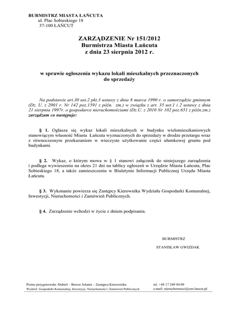 ZARZĄDZENIE Nr 151/2012 Burmistrza Miasta Łańcuta z dnia 23