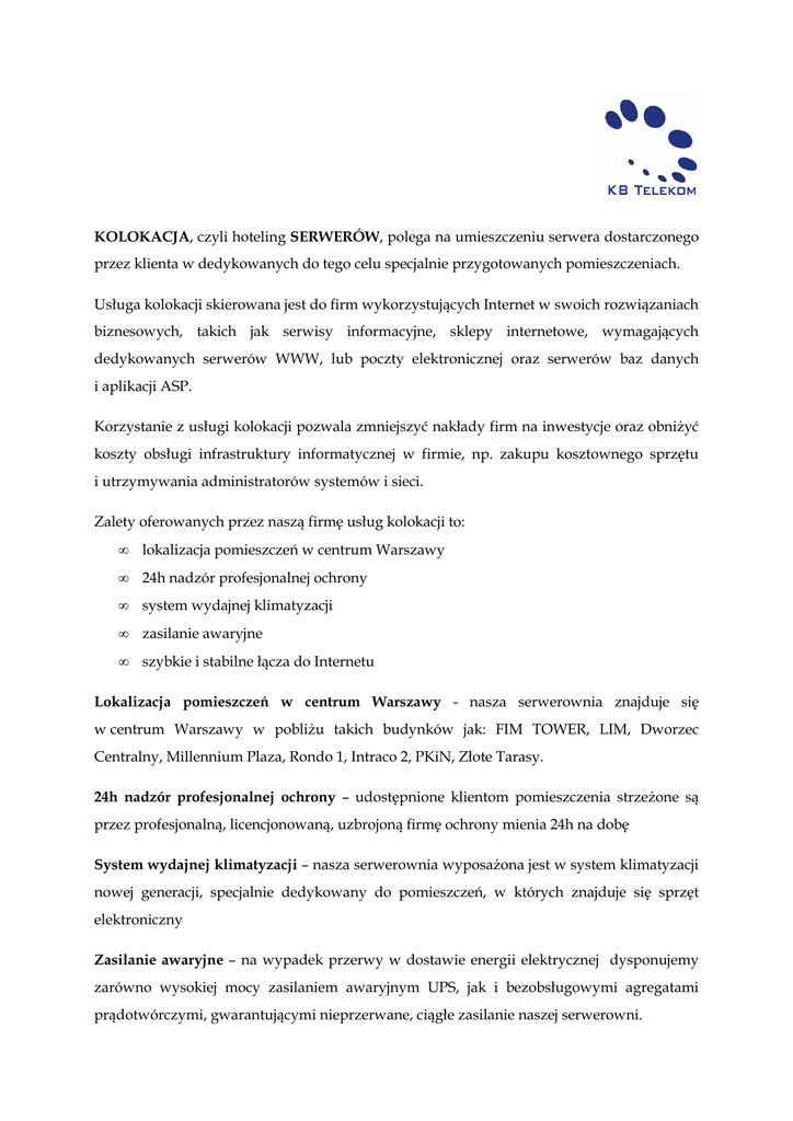 KOLOKACJA, czyli hoteling SERWERÓW, polega na umieszczeniu serwera dostarczonego przez klienta w dedykowanych do tego celu specjalnie przygotowanych pomieszczeniach. Usługa kolokacji skierowana jest do firm wykorzystujących Internet w swoich rozwiązaniach biznesowych, takich jak serwisy informacyjne, sklepy internetowe, wymagających dedykowanych serwerów WWW, lub poczty elektronicznej oraz serwerów baz danych i aplikacji ASP. Korzystanie z usługi kolokacji pozwala zmniejszyć nakłady firm na inwestycje oraz obniŜyć koszty obsługi infrastruktury informatycznej w firmie, np. zakupu kosztownego sprzętu i utrzymywania administratorów systemów i sieci. Zalety oferowanych przez naszą firmę usług kolokacji to: • lokalizacja pomieszczeń w centrum Warszawy • 24h nadzór profesjonalnej ochrony • system wydajnej klimatyzacji • zasilanie awaryjne • szybkie i stabilne łącza do Internetu Lokalizacja pomieszczeń w centrum Warszawy - nasza serwerownia znajduje się w centrum Warszawy w pobliŜu takich budynków jak: FIM TOWER, LIM, Dworzec Centralny, Millennium Plaza, Rondo 1, Intraco 2, PKiN, Złote Tarasy. 24h nadzór profesjonalnej ochrony – udostępnione klientom pomieszczenia strzeŜone są przez profesjonalną, licencjonowaną, uzbrojoną firmę ochrony mienia 24h na dobę System wydajnej klimatyzacji – nasza serwerownia wyposaŜona jest w system klimatyzacji nowej generacji, specjalnie dedykowany do pomieszczeń, w których znajduje się sprzęt elektroniczny Zasilanie awaryjne – na wypadek przerwy w dostawie energii elektrycznej dysponujemy zarówno wysokiej mocy zasilaniem awaryjnym UPS, jak i bezobsługowymi agregatami prądotwórczymi, gwarantującymi nieprzerwane, ciągłe zasilanie naszej serwerowni. Szybkie i stabilne łącza do Internetu – jesteśmy operatorem posiadającym własny numer AS oraz odpowiednią pulę adresów IP, wymieniamy ruch bezpośrednio z największymi operatorami telekomunikacyjnymi, dzięki czemu nie jesteśmy uzaleŜnieni od jednego dostawcy. Nasze przyłącza do sieci Telia, Teleglobe i Cable&Wireless gwarantują szybkie i niezawodne połączenie ze światem, natomiast wykorzystywane przyłącza do Polpak-T, GIX, WIX, GTS zapewniają najszybsze połączenia krajowe. Cennik usług kolokacji oferowanych przez KB Telekom: Wybrane pasmo 256 kbps 512 kbps 1 Mbps 2 Mbps CIR za kaŜde 128 kbps Abonament miesięczny 249 zł 349 zł 449 zł 749 zł 129 zł Usługi dodatkowe Dodatkowa jednostka 1U Dodatkowe 100W ee Przyrostowy backup danych Dodatkowa opłata miesięczna 99 zł 49 zł 29 zł Usługa Jednorazowa opłata instalacyjna Jednorazowy backup danych Opłata jednorazowa 199 zł 199 zł Do powyŜszych cen naleŜ doliczyć obowiązujący podatek VAT Charakterystyka usługi kolokacji: • brak limitów transferu w ramach wykupionego pasma • do 8 publicznych adresów IP • miejsce w szafie telekomunikacyjnej 19''o wielkości do 2U lub miejsce na komputer w obudowie TOWER • gniazdo zasilania z podłączeniem do systemu UPS (300W) • fizyczna kontrola dostępu do powierzonych serwerów 24h • 1 lub 2 porty Ethernet 10/100 Mbps na zarządzalnym switchu • usługa „zdalne ręce” – np. restart serwera, wymiana nośnika, itp. • fizyczny dostęp do serwera na Ŝądanie • monitoring usług działających na serwerze
