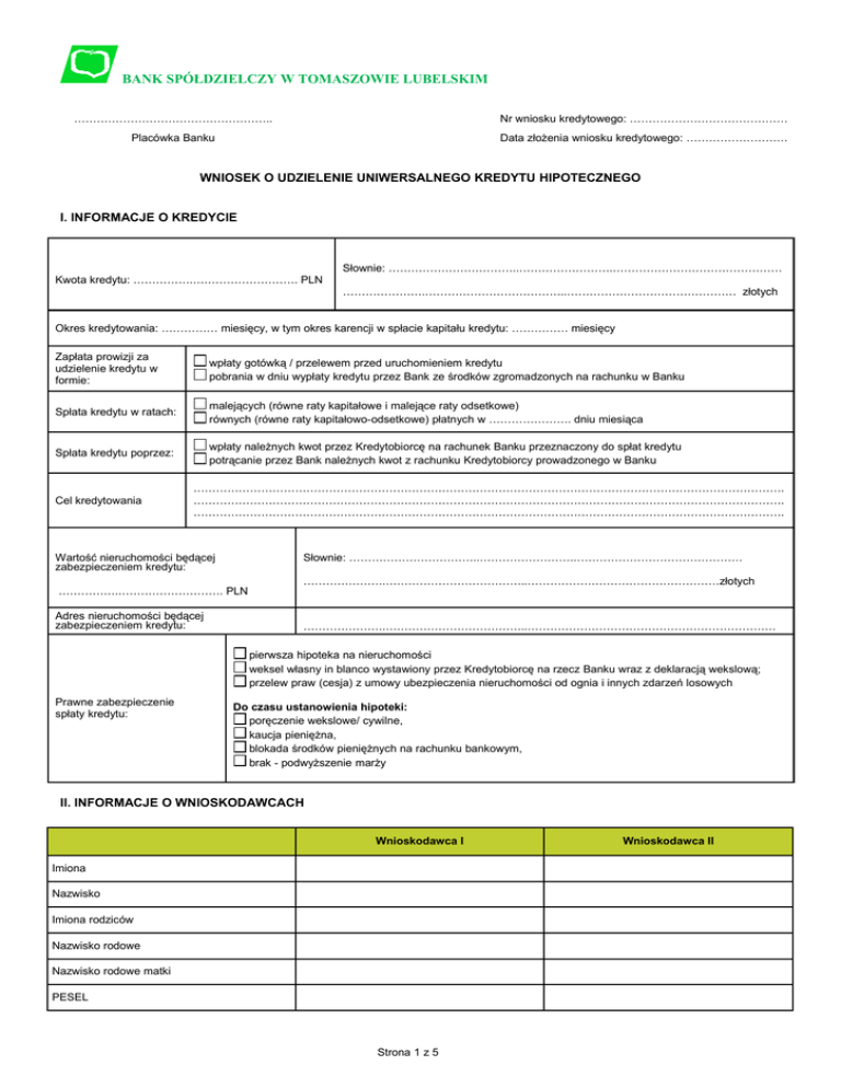 BANK SPÓŁDZIELCZY W TOMASZOWIE LUBELSKIM …………………………………………….. Nr wniosku kredytowego: …………………………………… Placówka Banku Data złożenia wniosku kredytowego: ……………………… WNIOSEK O UDZIELENIE UNIWERSALNEGO KREDYTU HIPOTECZNEGO I. INFORMACJE O KREDYCIE Słownie: ……………………………..…………………….……………………………………… Kwota kredytu: …………….………………………. PLN ………………….………………………………..……………………………………… złotych Okres kredytowania: …………… miesięcy, w tym okres karencji w spłacie kapitału kredytu: …………… miesięcy Zapłata prowizji za udzielenie kredytu w formie: wpłaty gotówką / przelewem przed uruchomieniem kredytu pobrania w dniu wypłaty kredytu przez Bank ze środków zgromadzonych na rachunku w Banku Spłata kredytu w ratach: malejących (równe raty kapitałowe i malejące raty odsetkowe) równych (równe raty kapitałowo-odsetkowe) płatnych w …………………. dniu miesiąca Spłata kredytu poprzez: wpłaty należnych kwot przez Kredytobiorcę na rachunek Banku przeznaczony do spłat kredytu potrącanie przez Bank należnych kwot z rachunku Kredytobiorcy prowadzonego w Banku Cel kredytowania …………………………………………………………………………………………………………………………………………. …………………………………………………………………………………………………………………………………………. …………………………………………………………………………………………………………………………………………. Wartość nieruchomości będącej zabezpieczeniem kredytu: Słownie: ……………………………..…………………….……………………………………… …………….………………………. PLN Adres nieruchomości będącej zabezpieczeniem kredytu: ………………….………………………………..……………………………………………złotych ………………….………………………………..………………………………………………………… pierwsza hipoteka na nieruchomości weksel własny in blanco wystawiony przez Kredytobiorcę na rzecz Banku wraz z deklaracją wekslową; przelew praw (cesja) z umowy ubezpieczenia nieruchomości od ognia i innych zdarzeń losowych Prawne zabezpieczenie spłaty kredytu: Do czasu ustanowienia hipoteki: poręczenie wekslowe/ cywilne, kaucja pieniężna, blokada środków pieniężnych na rachunku bankowym, brak - podwyższenie marży II. INFORMACJE O WNIOSKODAWCACH Wnioskodawca I Imiona Nazwisko Imiona rodziców Nazwisko rodowe Nazwisko rodowe matki PESEL Strona 1 z 5 Wnioskodawca II Wnioskodawca I Stan cywilny zamężna/żonaty panna/kawaler separacja Małżeńska wspólnota majątkowa tak Cechy dokumentu tożsamości Adres zamieszkania Adres do korespondencji Nr telefonu (do wyboru) nie wdowa/wdowiec rozwiedziona/y nie dotyczy Wnioskodawca II zamężna/żonaty panna/kawaler separacja tak nie wdowa/wdowiec rozwiedziona/y nie dotyczy Nazwa: …………………………………………. Nazwa: ………………………….………………. Seria…………………………………………….. Seria…………………………….……………….. Nr dokumentu: ……………….………………… Nr dokumentu: …………….…….……………… Wydany przez: ................................................ Wydany przez: ................................................. Ulica: ………………………….…………………. Ulica: ……………………………………………... Nr domu: ………………….…………………….. Nr domu: …………………………………………. Nr lokalu………………….……………………… Nr lokalu: …………………….…………………… Kod: ……………………………………………... Kod: …………………………….………………… Miejscowość: …………………….……………… Miejscowość………………….………………….. Kraj: ……………………………………………... Kraj: ………………………….…………………… Ulica……...………………………….…………… Ulica……...…………………….….……………… Nr domu: ……...………………………………… Nr domu: ……...…………………….…………… Nr lokalu: ……...……………...………………… Nr lokalu: ……...…………….…………………… Kod……...………….……….…………………… Kod……...………..…………….………………… Miejscowość: ……...…………………………… Miejscowość: …………....……………………… Kraj: ……...……………………………………… Kraj: ……...…………….………………………… stacjonarny…………………………….………… stacjonarny: ……………………………………… komórkowy: ………………………….………….. komórkowy: ……………………….……………… E-mail: Wykształcenie wyższe magisterskie licencjat/inżynier średnie zasadnicze zawodowe podstawowe/gimnazjalne wyższe magisterskie licencjat/inżynier średnie zasadnicze zawodowe podstawowe/gimnazjalne nie posiadam posiadam ................. nie posiadam posiadam ................. Wykonywany zawód Rachunek w Banku Spółdzielczym III. INFORMACJE O DOCHODACH I WYDATKACH Wnioskodawca I Wnioskodawca II Całkowity staż pracy (w latach) Okres zatrudnienia u obecnego pracodawcy/czas prowadzenia obecnej dział. gospodarczej (w latach) Informac