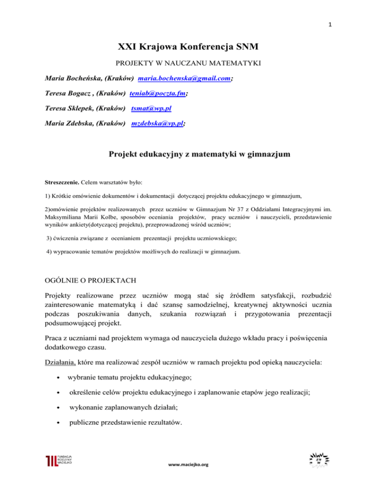 1 XXI Krajowa Konferencja SNM PROJEKTY W NAUCZANU MATEMATYKI Maria Bocheńska, (Kraków) [email protected]; Teresa Bogacz , (Kraków) [email protected]; Teresa Sklepek, (Kraków) [email protected] Maria Zdebska, (Kraków) [email protected]; Projekt edukacyjny z matematyki w gimnazjum Streszczenie. Celem warsztatów było: 1) Krótkie omówienie dokumentów i dokumentacji dotyczącej projektu edukacyjnego w gimnazjum, 2)omówienie projektów realizowanych przez uczniów w Gimnazjum Nr 37 z Oddziałami Integracyjnymi im. Maksymiliana Marii Kolbe, sposobów oceniania projektów, pracy uczniów i nauczycieli, przedstawienie wyników ankiety(dotyczącej projektu), przeprowadzonej wśród uczniów; 3) ćwiczenia związane z ocenianiem prezentacji projektu uczniowskiego; 4) wypracowanie tematów projektów możliwych do realizacji w gimnazjum. OGÓLNIE O PROJEKTACH Projekty realizowane przez uczniów mogą stać się źródłem satysfakcji, rozbudzić zainteresowanie matematyką i dać szansę samodzielnej, kreatywnej aktywności ucznia podczas poszukiwania danych, szukania rozwiązań i przygotowania prezentacji podsumowującej projekt. Praca z uczniami nad projektem wymaga od nauczyciela dużego wkładu pracy i poświęcenia dodatkowego czasu. Działania, które ma realizować zespół uczniów w ramach projektu pod opieką nauczyciela: • wybranie tematu projektu edukacyjnego; • określenie celów projektu edukacyjnego i zaplanowanie etapów jego realizacji; • wykonanie zaplanowanych działań; • publiczne przedstawienie rezultatów. www.maciejko.org 2 Dokumenty • Deklaracja przystąpienia ucznia do realizacji projektu edukacyjnego • Karta Projektu • Sprawozdanie z realizacji projektu edukacyjnego • Karta oceny projektu edukacyjnego Przygotowujący projekty powinni pamiętać, że: • każdy projekt edukacyjny powinien być oryginalny, • na prawach cytatu można włączać urywki lub drobne utwory, obowiązkowo podając nazwisko autora, • należy uwzględnić prawa autorskie i prawa o rozpowszechnianiu wizerunku. PRZYKŁADY TEMATÓW PROJEKTÓW REALIZOWANYCH Z UCZNIAMI W GIMNAZJUM NR 37 W KRAKOWIE: 1. „Black and white” – zaprojektowanie płytki i kompozycji z kilku jednakowych płytek. Zaprojektowanie kwadratowej płytki w dwóch kolorach np. czarnym i białym (kwadrat podzielony na wielokąty, z których część jest czarna lub w innym kolorze, tak aby płytka była dwukolorowa). Z dziewięciu jednakowych tak zaprojektowanych płytek większego kwadratu. trzeba ułożyć różne warianty Cześć badawcza: Obliczanie pola części jednego koloru płytki lub całej kompozycji. Opisywanie łamanych, obliczanie ich długości. Rodzaje łamanych. Figury unikursalne. Opisywanie przekształceń wykorzystanych w projektowaniu kompozycji ( np. symetrie) Opisywanie wielokątów powstałych w wyniku różnych ułożeń płytek. Własności tych wielokątów. Metoda wykonania dowolna: płytki wykonane ręcznie (kolorowane, malowane, wyklejane papierem) na komputerze lub sfotografowane. www.maciejko.org 3 2. Kwadraty. Projektowanie wzorów z wykorzystaniem kwadratów. 1. Utworzenie np. z dwóch kwadratów nowej figury - nałożenie ich, tak, aby nałożyły się środki kwadratów i ich osie symetrii, ale nie całe kwadraty. Cześć badawcza: opisanie wielokąta jaki powstał, obliczenie jego pola i obwodu, opisanie jego własności - osi symetrii, środek symetrii, przekątne, miary kątów wewnętrznych, sumę kątów wewnętrznych itp. 2. Zbadanie możliwości uzyskania kompozycji z takich figur, przy założeniu, że figury mogą się stykać wierzchołkami lub całymi bokami. 3. Prostokąty. Projektowanie wzorów z wykorzystaniem prostokątów. 1. Utworzenie np. z dwóch prostokątów o stosunku boków 2:1 (połowa kwadratu) - nowej figury – nałożenie ich wzdłuż przekątnych tak, aby przekątne się nałożyły, ale nie całe prostokąty. Cześć badawcza: opisanie wielokąta jaki powstał i jego własności, - obwód, pole całej figury części wspólnej, pole ‘wystających” trójkątów? 2. Zbadanie możliwości uzyskania kompozycji z takich figur, przy założeniu, że figury mogą się stykać wierzchołkami lub całymi bokami. 4. Matematyczne wyszywanki Bardzo ciekawe wzory otrzymujemy, gdy kolorowymi nićmi zaznaczymy wszystkie przekątne w wielokącie, szczególnie o dużej liczbie boków. Wykonaj matematyczną wyszywankę komputerowo lub wyszyj na kartonie lub materiale. Jakie krzywe można zauważyć? Poszukaj informacji na ich temat. Informacje na temat matematycznych wyszywanek można znaleźć w internecie lub w podanej literaturze: 1. E. Żórawska-Dobrowolska. Nitką wyszywane. ABC wyszywania. Wydawnictwo NOWIK. Opole 2003. 2. H. Balbierz, P. Pawlikowski, J. Pasławska. Matematyczne wyszywanki. Sztuka kreślenia nitką. Wyd. Triforia Warszawa 2003. 3. S. Kowal. Przez rozrywkę do wiedzy. Rozmaitości matematyczne. Wydawnictwo NaukowoTechniczne. Warszawa 1989. www.maciejko.org 4 4. W. Bieńko. Zygzakiem przez matematykę. PZWS Warszawa 1965. 5. Parkietaże 1. Poszukaj w encyklopedii, słowniku matematycznym lub w internecie co to jest parkietaż i krótko wyjaśnij, podając źródło informacji. Znajdź przykłady parkietaży. Napisz, gdzie mają zastosowanie. 2. Jakimi trójkątami można pokryć dokładnie płaszczyznę? 3. Sprawdź, jakimi wielokątami o jednakowych bokach można pokryć dokładnie płaszczyznę - tak, aby nie było „pustych przestrzeni”. Jaki warunek musi być spełniony? 4. Wybierz jeden z wielokątów wypukłych, przekształć go tak, aby otrzymać ciekawy kształt. 5. Zaprojektuj i wykonaj Swój parkietaż. 6. Bryły na płaszczyźnie 1. Przypomnij sobie jak powstaje siatka sześcianu, prostopadłościanu, graniastosłupa, ostrosłupa... 2. Zbadaj, jakimi siatkami brył można pokryć płaszczyznę, tak aby nie było „pustych przestrzeni”. Efekty Swojej pracy przedstaw w formie plakatu, prezentacji lub albumu; dowoln