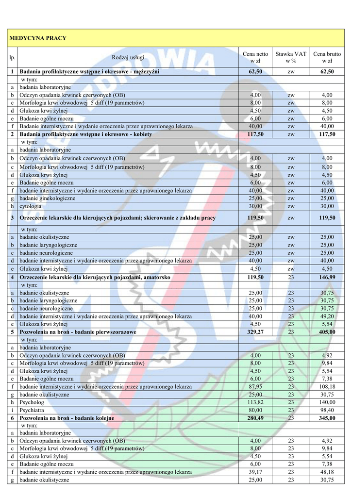 MEDYCYNA PRACY lp. Rodzaj usługi Cena netto w zł Stawka VAT
