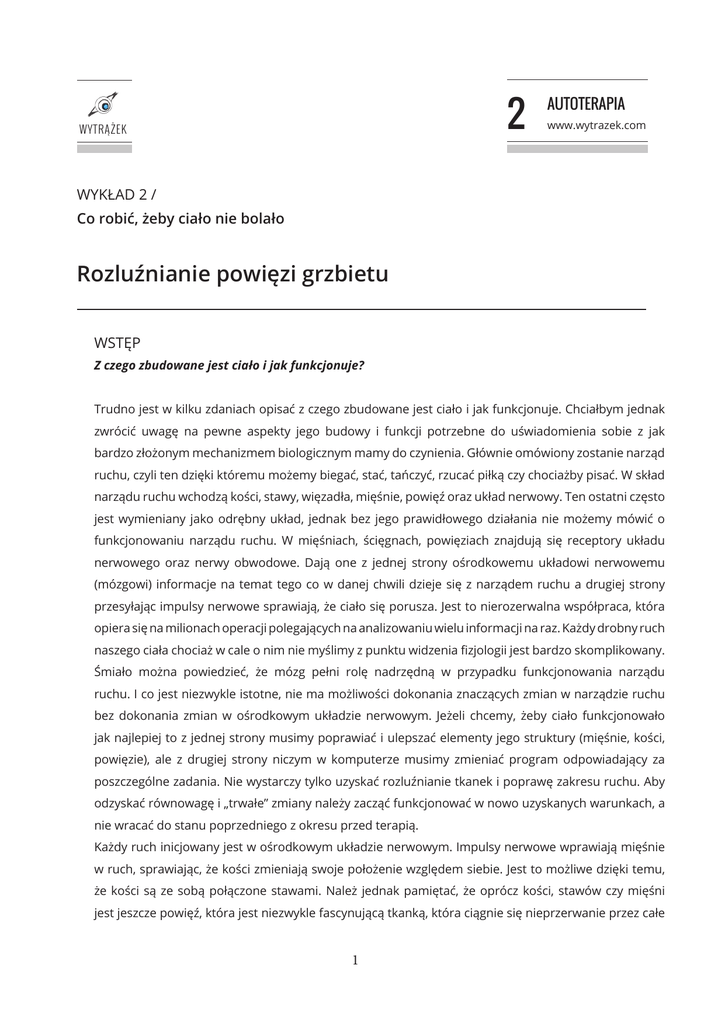 2 WYTRĄŻEK AUTOTERAPIA www.wytrazek.com WYKŁAD 2 / Co robić, żeby ciało nie bolało Rozluźnianie powięzi grzbietu WSTĘP Z czego zbudowane jest ciało i jak funkcjonuje? Trudno jest w kilku zdaniach opisać z czego zbudowane jest ciało i jak funkcjonuje. Chciałbym jednak zwrócić uwagę na pewne aspekty jego budowy i funkcji potrzebne do uświadomienia sobie z jak bardzo złożonym mechanizmem biologicznym mamy do czynienia. Głównie omówiony zostanie narząd ruchu, czyli ten dzięki któremu możemy biegać, stać, tańczyć, rzucać piłką czy chociażby pisać. W skład narządu ruchu wchodzą kości, stawy, więzadła, mięśnie, powięź oraz układ nerwowy. Ten ostatni często jest wymieniany jako odrębny układ, jednak bez jego prawidłowego działania nie możemy mówić o funkcjonowaniu narządu ruchu. W mięśniach, ścięgnach, powięziach znajdują się receptory układu nerwowego oraz nerwy obwodowe. Dają one z jednej strony ośrodkowemu układowi nerwowemu (mózgowi) informacje na temat tego co w danej chwili dzieje się z narządem ruchu a drugiej strony przesyłając impulsy nerwowe sprawiają, że ciało się porusza. Jest to nierozerwalna współpraca, która opiera się na milionach operacji polegających na analizowaniu wielu informacji na raz. Każdy drobny ruch naszego ciała chociaż w cale o nim nie myślimy z punktu widzenia fizjologii jest bardzo skomplikowany. Śmiało można powiedzieć, że mózg pełni rolę nadrzędną w przypadku funkcjonowania narządu ruchu. I co jest niezwykle istotne, nie ma możliwości dokonania znaczących zmian w narządzie ruchu bez dokonania zmian w ośrodkowym układzie nerwowym. Jeżeli chcemy, żeby ciało funkcjonowało jak najlepiej to z jednej strony musimy poprawiać i ulepszać elementy jego struktury (mięśnie, kości, powięzie), ale z drugiej strony niczym w komputerze musimy zmieniać program odpowiadający za poszczególne zadania. Nie wystarczy tylko uzyskać rozluźnianie tkanek i poprawę zakresu ruchu. Aby odzyskać równowagę i „trwałe” zmiany należy zacząć funkcjonować w nowo uzyskanych warunkach, a nie wracać do stanu poprzedniego z okresu przed terapią. Każdy ruch inicjowany jest w ośrodkowym układzie nerwowym. Impulsy nerwowe wprawiają mięśnie w ruch, sprawiając, że kości zmieniają swoje położenie względem siebie. Jest to możliwe dzięki temu, że kości są ze sobą połączone stawami. Należ jednak pamiętać, że oprócz kości, stawów czy mięśni jest jeszcze powięź, która jest niezwykle fascynującą tkanką, która ciągnie się nieprzerwanie przez całe 1 WYKŁAD 2 / Co robić, żeby ciało nie bolało nasze ciało. Otacza i łączy narządy naszego ciała, każdy mięsień, a nawet pojedyncze jego włókienka. Powięź jest jedną z największych struktur tkankowych w ciele człowieka. Tworzy trójwymiarową sieć rozpościerającą się od czubka głowy aż po duży paluch u nogi, bez wyraźnego początku ani końca. Analizując układ powięziowy człowieka trudno nie zgodzić się z określeniem że jest to nieskończona sieć. Coraz częściej przestaje się jednak myśleć odrębnie o mięśniach i odrębnie o powięziach, gdyż są to struktury, które są ze sobą nierozerwalnie złączone. Każdy fragment mięśnia jest przepleciony powięzią, stąd coraz częściej używa się określenia mięśnio-powięź. Myśląc o powięzi, jej relacji z ciałem i jego wszystkimi narządami (także wewnętrznymi) trzeba wyraźnie podkreślić, że całe ciało stanowi jedną nierozerwalną całość. Wydaje się to być oczywistością jednak wielu specjalistów zajmujących się leczeniem postrzega organizm człowieka jako kompilację kilku elementów a nie jako jednolity zbiór, w którym każdy element jest ze sobą ściśle powiązany. Wielu lekarzy czy fizjoterapeutów uważa, że najistotniejszym rozpatrywanym elementem w dolegliwościach narządu ruchu są stawy, inni zaznaczają jak istotne są więzadła, a jeszcze inni mięśnie. Ciało stanowi całość, kiedy poruszasz ręką, to napina się mięsień, skraca powięź, poruszają się kości w stawach. To samo dotyczy kręgosłupa, który nie jest zbudowany tylko z kręgów i krążków międzykręgowych (dysków) między nimi. Są tam jeszcze więzadła, mięśnie i powięzie, które w każdym ruchu ze sobą współpracują zapewniając jak najefektywniejsze funkcjonowanie. Kiedy dochodzi do zmian patologicznych w ciele człowieka to zachodzą one w całym systemie, a nie tylko w jednym jego elemencie. Kiedy po długim unieruchomieniu (np. złamaniu) nie mogę unieść do góry ręki, to nie jest to tylko i wyłącznie wina skróconych mięśni czy obkurczonej torebki stawowej. Problem dotyczy także stawu, którego praca jest zaburzona, powięzi, która się skróciła i układu nerwowego, który kontroluje funkcję barku w nowych dysfunkcyjnych warunkach. ZADANIE 2 Pamiętaj, że działania terapeutyczne nakierowane na jeden z elementów naszego ciała jakim jest powięź przynosi szereg korzyści w całym układzie ruchu. Staraj się nie myśleć o konsekwencjach działania tylko w obszarze, który poddajesz terapii. Często odczujesz rezultaty w innym obszarze. Zadanie drugie skoncentrowane jest na powięzi powierzchownej grzbietu, gdyż jest ona stosunkowo łatwo dostępna do terapii, a także technika nie jest zbyt skomplikowana. Jest to kolejny obszar naszego ciała, który mimo, że zlokalizowany jest w warstwach powierzchownych ciała wpływa istotnie na jego funkcjonowanie. Mobilizacje fałdu skórnego czy zwiększanie elastyczności powięzi powierzchownej na grzbiecie są zazwyczaj wykonywane przez terapeutę względem pacjenta. Mało jednak który terapeuta wykorzystuje tę technikę jako element autoterapii. Owszem trudno jest dokonać samodzielnie autoterapii całej powięzi grzbietu, jednak przy odrobinie dobrych chęci możemy wykonywać technikę rozluźniania na tych najis