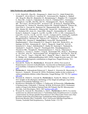 Julia Pawłowska spis publikacji do 2016: 1. 2. 3. 4. 5. 6. Li GJ., Hyde KD., Zhao RL., Hongsanan S., Abdel-Aziz FA., Abdel-Wahab MA., Alvarado P., Alves-Silva G., Ammirati JF., Ariyawansa HA., Baghela A., Bahkali AH., Beug M., Bhat DJ., Bojantchev D., Boonpratuang T., Bulgakov TS., Camporesi E., Boro MC., Ceska O., Chakraborty D., Chen JJ., Chethana KWT., Chomnunti P., Consiglio G., Cui BK., Dai DQ., Dai YC., Daranagama DA., Das K., Dayarathne MC., De Crop E., De Oliveira RJV., de Souza CAF., de Souza JI., Dentinger BTM., Dissanayake AJ., Doilom M., Drechsler-Santos ER., Ghobad-Nejhad M., Gilmore SP., Góes-Neto A., Gorczak M., Haitjema CH., Hapuarachchi KK., Hashimoto A., He MQ., Henske JH., Hirayama K., Iribarren MJ., Jayasiri SC., Jayawardena RS., Jeon SJ., Jerônimo GH., Jesus AL., Jones EBG., Kang JC., Karunarathna SC., Kirk PM., Konta S., Kuhnert E., Langer E., Lee HS., Lee HB., Li WJ., Li XH., Liimatainen K., Lima DX., Lin CG., Liu JK., Liu XZ., Liu ZY., Luangsa-ard JJ., Lücking R., Lumbsch HT., Lumyong S., Leaño EM., Marano AV., Matsumura M., McKenzie EHC., Mongkolsamrit S., Mortimer PE., Nguyen TTT., Niskanen T., Norphanphoun C., O’Malley MA., Parnmen S., Pawłowska J., Perera RH., Phookamsak R., Phukhamsakda C., Pires-Zottarelli CLA., Raspé O., Reck MA., Rocha SCO., de Santiago ALCMA., Senanayake IC., Setti L., Shang QJ., Singh S.K., Sir E.B., Solomon K.V., Song J., Srikitikulchai P., Stadler M., Suetrong S., Takahashi H., Takahashi T., Tanaka K., Tang LP., Thambugala KM., Thanakitpipattana D., Theodorou MK., Thongbai B., Thummarukcharoen T., Tian Q., Tibpromma S., Verbeken A., Vizzini A., Vlasák J., Voigt K., Wanasinghe DN., Wang Y., Weerakoon G., Wen HA., Wen TC., Wijayawardene NN., Wongkanoun S., Wrzosek M., Xiao JP., Xu JC., Yan JY., Yang J., Yang SD., Hu Y., Zhang JF., Zhao J., Zhou LW., Peršoh D., Phillips AJL., Maharachchikumbura SSN. (2016). Fungal diversity notes 253–366: taxonomic and phylogenetic contributions to fungal taxa. Fungal Diversity. 78:1. [pobierz plik pdf]. Gorczak M., Tischer M., Pawłowska J., Wrzosek M. (2016). First record of Hesperomyces virescens (Laboulbeniales, Ascomycota) on Harmonia axyridis (Coccinellidae, Coleoptera) in Poland. Acta Mycologica 51(1): 1071. [pobierz plik pdf]. Pawłowska J., Aleksandrzak-Piekarczyk T., Banach A., Kiersztyn B., Muszewska A., Serewa L., Szatraj K., Wrzosek M. (2016). Preliminary studies on the evolution of carbon assimilation abilities within Mucorales. Fungal Biology 120: 752-763. [pobierz plik pdf]. Wrzosek M., Dubiel G., Gorczak M., Pawłowska J., Tischer M., Bałazy S. (2016) New insights on the phylogeny and biology of the fungal ant pathogen Aegeritella. Journal of Invertebrate Pathology 133:1-7. Ruszkiewicz-Michalska M.,S.Bałazy, J. Chełkowski, M.Dynowska, J.Pawłowska, E.Sucharzewska, J.Szkodzik, C.Tkaczuk. M.Wilk, M.Wrzosek (2015). Preliminary studies of fungi in the Biebrza National Park (NE Poland). Part III. Micromycetes – new data, Acta Mycologica, 50(2): 1067 [pobierz plik pdf]. Wrzosek M., Gorczak M., Okrasińska A., Istel Ł., Pawłowska J. (2015). Czy można spodziewać się zaburzeń mykocenoz w Tucholskim Parku Krajobrazowym w związku z pojawieniem się obcego gatunku borowikowca? [W:] Mieczysław Kunz (red.) Stan poznania środowiska przyrodniczego Tucholskiego Parku Krajobrazowego i Rezerwatu Biosfery Bory Tucholskie. Wyd. Uniwersytet Mikołaja Kopernika w Toruniu, Tucholski Park Krajobrazowy, Tuchola-Toruń: 172-176. 7. 8. 9. 10. 11. 12. 13. 14. 15. 16. 17. Różalska S., Soboń A., Pawłowska J., Wrzosek M., Długoński J. (2015). Biodegradation of nonylphenol by a novel entomopathogenic Metarhizium robertsii strain. Bioresource Technology 191: 166-172. [pobierz plik pdf]. Wilk M., Pawłowska J., Wrzosek M. (2014). Wentiomyces sp. from plant litter on poor fen in northeastern Poland. Acta Mycologica 49:237-247 [pobierz plik pdf]. Hyde K.D., Nilsson R.H., Alias S.A., Ariyawansa H.A., Blair J.E., Lei Cai, de Cock A.W.A.M., Dissanayake A.J., Glockling S.L., Goonasekara I.D., Gorczak M., Hahn M., Jayawardena R.S., van Kan J.A.L., Laurence M.H., Lévesque A., Xinghong Li, Jian-Kui Liu, Maharachchikumbura S.S.N., Manamgoda D.S., Martin F.N., McKenzie E.H.C., McTaggart A.R., Mortimer P.E., Nair P.V.R., Pawłowska J., Rintoul T.L., Shivas R.G., Spies C.F.J., Summerell B.A., Taylor P.W.J., Terhem R.B., Udayanga D., Vaghefi N., Walther G., Wilk M., Wrzosek M., Jian-Chu Xu, JiYe Yan, Nan Zhou. (2014). One stop shop: backbones trees for important phytopathogenic genera: I (2014). Fungal Diversity 67: 21-125 [pobierz plik pdf]. Wilk M., Pawłowska J., Wrzosek M., Gorczak M., Suska-Malawska M. (2014). Colonization of decomposing Sphagnum moss litter by mycorrhizal roots in two types of peatland ecosystems. Folia Biologica et Oecologica 10: 113-121.[pobierz plik pdf]. Nilsson R.H., Hyde K.D., Pawłowska J., Ryberg M., Tedersoo L., Aas A.B., Alias S.A., Alves A., Anderson C.L., Antonelli A., Arnold A.E., Bahnmann B., Bahram M., Bengtsson-Palme J., Berlin A., Branco S., Chomnunti P., Dissanayake A., Drenkhan R., Friberg H. Frøslev T.G., Halwachs B., Hartmann M., Henricot B., Jayawardena R., Jumpponen A., Kauserud H., Koskela S, Kulik T., Liimatainen K., Lindahl B., Lindner D., Liu J-K., Maharachchikumbura S, Manamgoda D., Martinsson S., Neves M.A., Niskanen T., Nylinder S., Pereira O.L., Pinho D.B., Porter T.M., Queloz V., Riit T., Sanchez-García M., de Sousa F., Stefaczyk E., Tadych M., Takamatsu S., Tian Q., Udayanga D., Unterseher M., Wang Z., Wikee S., Yan J., Larsson E., Larsson KH., Kõljalg U., Abarenkov K. (2014). Improving ITS sequence data for identification of plant pathogenic fungi. Fungal Diversity 67: 11-19. Pawłowska J., Wilk M., Śliwińska-Wyrzychowska A., Mętrak M., Wrzosek M. (2014). The diversity of endophytic fungi in above-ground tissue of two Lycopodium species in Poland. Symbiosis 63: 87-97 [pobierz plik pdf]. Wilk M., Banach A., Pawłowska J., Wrzosek M. (2014). L
