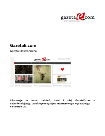 GazetaE.com Gazeta Elektroniczna informacje na temat założeń, treści i misji GazetaE.com najambitniejszego polskiego magazynu internetowego wydawanego na terenie UK. – O GazetaE.com GazetaE.com to darmowy magazyn internetowy skierowany do Polaków mieszkających w UK oraz do szerokiego grona odbiorców zainteresowanych Polską kulturą, sztuką, bieżącymi informacjami oraz integracją i wymianą kulturową pomiędzy UK a Polską. Magazyn jest dostępny w internecie na stronach www.gazetae.com oraz www.gazetaelektroniczna.com. Jest co dziennie aktualizowany bieżącymi newsami, ciekawymi artykułami, felietonami, foto-reportażami, podcastami z najciekawszych audycji radiowych oraz relacjami video. Dlaczego warto czytać GazetaE.com? Nieustannie pracujemy nad ulepszeniem naszego magazynu i pozyskaniem jak najciekawszych informacji. Zapewniamy najwyższą jakość słowa pisanego – zajmujące, ciekawe i inspirujące artykuły pisane z myślą o szerokim odbiorcy. Magazyn posiada nowoczesny i łatwy w obsłudze layout. Gazeta Elektroniczna jest pierwszym magazynem internetowym skierowanym do Polaków mieszkających w UK jaki zawiera najbardziej bieżące informacje i newsy aktualizowane kilka razy dziennie oraz reportaże, felietony i artykuły pisane ekskluzywnie dla naszego pisma. Jako jedyni w UK publikujemy również autorskie foto i video reportaże z najciekawszych imprez i wydarzeń jakie mają miejsce na terenie UK. Udostępniamy także całkowicie darmowe video porady niezbędne Polakom do asymilacji z prawami obowiązującymi w UK (bieżące informacje na temat prawa pracy, służby zdrowia, bezpieczeństwa itp.) oraz ciekawe i bezpłatne video lekcje angielskiego. Na łamach naszego magazynu czytelnicy mogą także odsłuchać ciekawych audycji skierowanych do Polonii z całego świata. Nasza redakcja składa się z doświadczonych i uznanych pisarzy, dziennikarzy, fotografików, filmowców i artystów. Traktujemy naszą pracę i sam magazyn bardzo poważnie i jesteśmy zdeterminowani aby ten się nieustająco rozwijał. Nasz projekt jest wspierany przez organizacje rządowe Polski (Polski Konsulat w Edynburgu) i Wielkiej Brytanii (Firstport Ltd) oraz przez Polskie i Międzynarodowe Stowarzyszenia Dziennikarskie. Współpracujemy również z TV Polonia i Radiem Talk FM. W skład Gazety Elektronicznej wchodzą działy: Wiadomości – codziennie uzupełniane najważniejsze informacje lokalne z Wielkiej Brytanii, jak również najważniejsze wiadomości z Polski i świata. Artykuły – dział zawierający ciekawe reportaże, felietony, wywiady tworzone przez ekipę dziennikarzy Gazety Elektronicznej. Foto – dział zawierający prace fotografików współpracujących z magazynem. Video – dział zawierający materiały video tworzone przez współpracowników Gazety Elektronicznej, filmy udostępnione nam przez instytucje (NHS, Bussines Gateway) oraz najciekawsze prace studentów kierunków filmowych. W dziale tym znajdować się będą reportaże, porady oraz lekcje angielskiego. Audio – dział zawierający materiały audio; audycje polonijnych stacji radiowych z całego świata, najlepsze podcasty w języku polskim dostępne w sieci, tworzone przez Gazetae.com najpiękniejsze polskie wiersze dla dzieci oraz felietony radiowe. Kalendarium Imprez – dział zawierający listę polecanych przez redakcję magazynu imprez, wystaw oraz koncertów odbywających się na terenie Wielkiej Brytanii. W sieci – dział zawierający linki i opisy najciekawszych, często nietypowych i niesamowitych filmów, stron internetowych i interaktywnych aplikacji. Gazetae.com to magazyn z misją. Naszym celem jest promowanie wśród Polonii wartości społeczeństw otwartych, multikulturowych. Gazeta Elektroniczna ma “poszerzać horyzonty”, nakłaniać do myślenia i analizowania otaczającego nas świata, ma skłaniać do żywego uczestnictwa w historii, kulturze i zmianach jakie maja miejsce wokół nas. Chcemy być rozrywką, ale mądrą i celową rozrywką. GazetaE.com wspiera starania o uaktywnienie tradycyjnej już polskiej indywidualności i wykorzystanie jej w wielokulturowym społeczeństwie. GazetaE.com dla biznesu GazetE.com to doskonałe miejsce do umieszczania reklam przez firmy i usługodawców zainteresowanych dotarciem do rynku Polskich emigrantów. Na terenie UK przebywa i pracuje obecnie około 1 mln Polaków (w Szkocji ok 70,000, w Północnej Anglii 400,000). Badania wykazują, że reklamy w internecie są atrakcyjne dla Polskiego odbiorcy i częściej niż prasowe przez ww. odbierane. Polacy w UK spędzają dużą ilość swojego wolnego czasu w internecie i reklamy pisane w jęz. polskim na stronach ich dotyczących są dla nich szczególnie atrakcyjne. Reklamodawcy jacy w największym stopniu skorzystać mogą z usług naszego magazynu to głównie: duże sieci komórkowe i telefoniczne, dostawcy internetu, różne lokalne punkty usługowe, firmy pośrednictwa w przekazie pieniędzy, prawnicy, firmy ubezpieczeniowe, przewoźnicy i wiele innych. Czytelnicy GazetaE.com Gazeta Elektroniczna skierowana jest głównie do Polaków mieszkających w UK lub osób zainteresowanych wyjazdem na Wyspy bądź planującym odwiedzenie tu bliskich. Polacy stanowią największy ruch emigracyjny w Unii Europejskiej od 2004 roku. Większość osób jaka pracuje i zamieszkuje w UK to ludzie młodzi, ambitni, dobrze wykształceni. Nie bojący się nowych wyzwań i pracowici. Zgodnie ze statystykami typowy Polak w UK ma między 18 a 44 lata (93% wszystkich polskich emigrantów), jest otwarty na nowe doświadczania i nie boi podjąć się ryzyka (np. nowej pracy, dalekiej podróży). Wielu Polaków planuje zostać w UK na stałe (ok. 40%) i mieszka tu od pomiędzy 3 a 5 lat. 93% osób to ludzie posiadający stałe zatrudnienie (około 50% Polaków pracuje w sektorze usługowym, 10% prowadzi własne firmy). Większość Polskich emigrantów żyje w małżeństwie lub posiada stałego pa