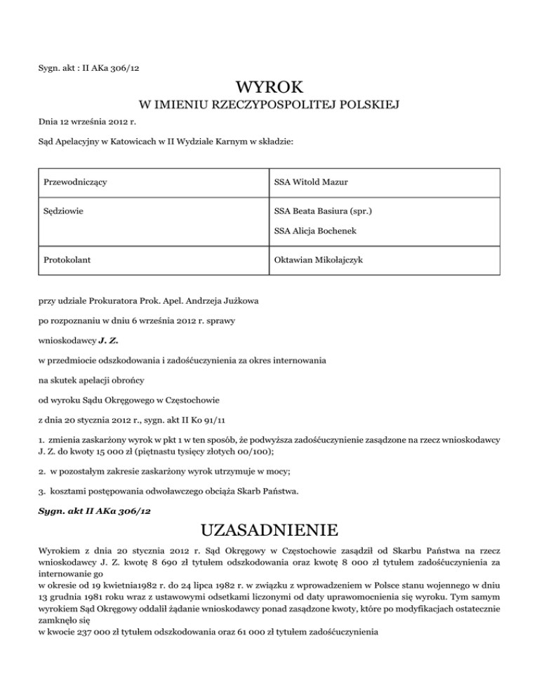 Sygn. akt : II AKa 306/12 WYROK W IMIENIU RZECZYPOSPOLITEJ POLSKIEJ Dnia 12 września 2012 r. Sąd Apelacyjny w Katowicach w II Wydziale Karnym w składzie: Przewodniczący SSA Witold Mazur Sędziowie SSA Beata Basiura (spr.) SSA Alicja Bochenek Protokolant Oktawian Mikołajczyk przy udziale Prokuratora Prok. Apel. Andrzeja Jużkowa po rozpoznaniu w dniu 6 września 2012 r. sprawy wnioskodawcy J. Z. w przedmiocie odszkodowania i zadośćuczynienia za okres internowania na skutek apelacji obrońcy od wyroku Sądu Okręgowego w Częstochowie z dnia 20 stycznia 2012 r., sygn. akt II Ko 91/11 1. zmienia zaskarżony wyrok w pkt 1 w ten sposób, że podwyższa zadośćuczynienie zasądzone na rzecz wnioskodawcy J. Z. do kwoty 15 000 zł (piętnastu tysięcy złotych 00/100); 2. w pozostałym zakresie zaskarżony wyrok utrzymuje w mocy; 3. kosztami postępowania odwoławczego obciąża Skarb Państwa. Sygn. akt II AKa 306/12 UZASADNIENIE Wyrokiem z dnia 20 stycznia 2012 r. Sąd Okręgowy w Częstochowie zasądził od Skarbu Państwa na rzecz wnioskodawcy J. Z. kwotę 8 690 zł tytułem odszkodowania oraz kwotę 8 000 zł tytułem zadośćuczynienia za internowanie go w okresie od 19 kwietnia1982 r. do 24 lipca 1982 r. w związku z wprowadzeniem w Polsce stanu wojennego w dniu 13 grudnia 1981 roku wraz z ustawowymi odsetkami liczonymi od daty uprawomocnienia się wyroku. Tym samym wyrokiem Sąd Okręgowy oddalił żądanie wnioskodawcy ponad zasądzone kwoty, które po modyfikacjach ostatecznie zamknęło się w kwocie 237 000 zł tytułem odszkodowania oraz 61 000 zł tytułem zadośćuczynienia w związku z internowaniem w okresie od 19 kwietnia do 24 lipca 1982 roku oraz 8000 zł odszkodowania i 13 000 zł zadośćuczynienia z tytułu ukrywania się przez wnioskodawcę w okresie od 13 grudnia 1981 roku do dnia internowania. Apelację od powyższego wyroku w części oddalającej wniosek wniósł pełnomocnik wnioskodawcy. Skarżący zarzucił: 1. Obrazę przepisów postępowania, która miała wpływ na treść wyroku tj. art. 7 k.p.k. przez deprecjację pojęcia zadośćuczynienia wbrew rozumieniu zawartemu w art.8 ust.1 ustawy z dnia 23 lutego 1991 roku o uznaniu za nieważne orzeczeń wydanych wobec osób represjonowanych za działalność na rzecz niepodległego bytu Państwa Polskiego oraz nieuwzględnienie zasad wiedzy i doświadczenia życiowego przy określeniu jego wysokości, 2. Błąd w ustaleniach faktycznych przyjętych za podstawę wyroku, który miał wpływ na jego treść przez: - ustalenie, że J. Z.nie mógł pracować u dotychczasowego pracodawcy tj. w (...)po wprowadzeniu stanu wojennego, bowiem związek zawodowy został zdelegalizowany, - przyjęcie, że nie przysługuje odszkodowanie za poniesioną szkodę w postaci utraty dochodów z tytułu wynagrodzenia J. Z.przed internowaniem do dnia 31 sierpnia 1982 roku, kiedy to został aresztowany, zarówno w (...), jak i z tytułu jego działalności artystycznej, - potraktowanie zadośćuczynienia jako symboliczne, oceniane przez wnioskodawcę z powodu zaniżonej wysokości w kategoriach powtórnego upokorzenia (w kwocie 8000 zł), gdyż nie przedstawia odczuwalnej wartości ekonomicznej, - nieuwzględnienie wszystkich elementów składających się na stopień cierpień oraz intensywność represji stosowanych wobec J. Z., zwłaszcza faktu szykanowania go przez dłuższy okres pomimo wyjątkowo trudnej sytuacji rodzinnej i stanu zdrowia (nawet przed i po internowaniu), - nieuwzględnienie wartości zabranych przez funkcjonariuszy SB publikacji książkowych należących do wnioskodawcy o łącznej wartości 30 000 zł. Stawiając te zarzuty skarżący wniósł o uchylenie wyroku w zaskarżonej części tj. oddalającej wniosek i przekazanie sprawy do ponownego rozpoznania. Sąd Apelacyjny zważył, co następuje: Apelacja pełnomocnika wnioskodawcy okazała się zasadna w części kwestionującej wysokość zasądzonego zadośćuczynienia i skutkowała zmianą zaskarżonego orzeczenia. W pozostałej części zarzuty i wnioski apelacji okazały się bezzasadne. W pierwszej kolejności należało stwierdzić, że Sąd Okręgowy prawidłowo przeprowadził przewód sądowy, gromadząc materiał dowodowy pozwalający na merytoryczne rozstrzygnięcie sprawy. Istotne ustalenia faktyczne dokonane przez Sąd nie wykraczają poza granice swobodnej oceny dowodów, poczynione zostały na podstawie prawidłowej analizy przeprowadzonych dowodów, zgodne były ze wskazaniami wiedzy i doświadczenia życiowego, znajdując odzwierciedlenie w uzasadnieniu orzeczenia. Sąd wskazał jakie fakty uznał za ustalone, na czym oparł swoje ustalenia i w jakim zakresie roszczenia wnioskodawcy ocenił jako zasadne. Odnosząc się do apelacji pełnomocnika wnioskodawcy w części, w której podnosił błąd w ustaleniach faktycznych, należało stwierdzić, że miała ona charakter głównie polemiczny w stosunku do prawidłowych i nie budzących wątpliwości ustaleń Sądu I instancji. Swobodna, a więc zgodna z zasadami sformułowanymi w art. 7 k.p.k., ocena materiału dowodowego stanowi uprawnienie Sądu meriti i pozostaje pod ochroną art. 7 k.p.k. tak długo, dopóki skarżący nie wykaże, iż Sąd ten oparł rozstrzygnięcie bądź na okolicznościach nieujawnionych w toku przewodu sądowego, bądź też ujawnionych, ale ocenionych w sposób sprzeczny ze wskazaniami wiedzy, logiki i doświadczeniem życiowym. Wszystkie okoliczności podnoszone przez pełnomocnika były znane Sądowi I instancji i poddane analizie. Na wstępie należy jeszcze raz powtórzyć za Sądem Okręgowym, iż zgodnie z treścią art. 8 ust. 1 ustawy z dnia 23 lutego 1991 r. o uznaniu za nieważne orzeczeń wydanych wobec osób represjonowanych za działalność na rzecz niepodległego bytu Państwa Polskiego (Dz. U. Nr 34, poz. 149 ze zm.) "Osobie, wobec której stwierdzono nieważność orzeczenia albo wydano decyzję o internowaniu w związku z wprowadzeniem w dniu 13 