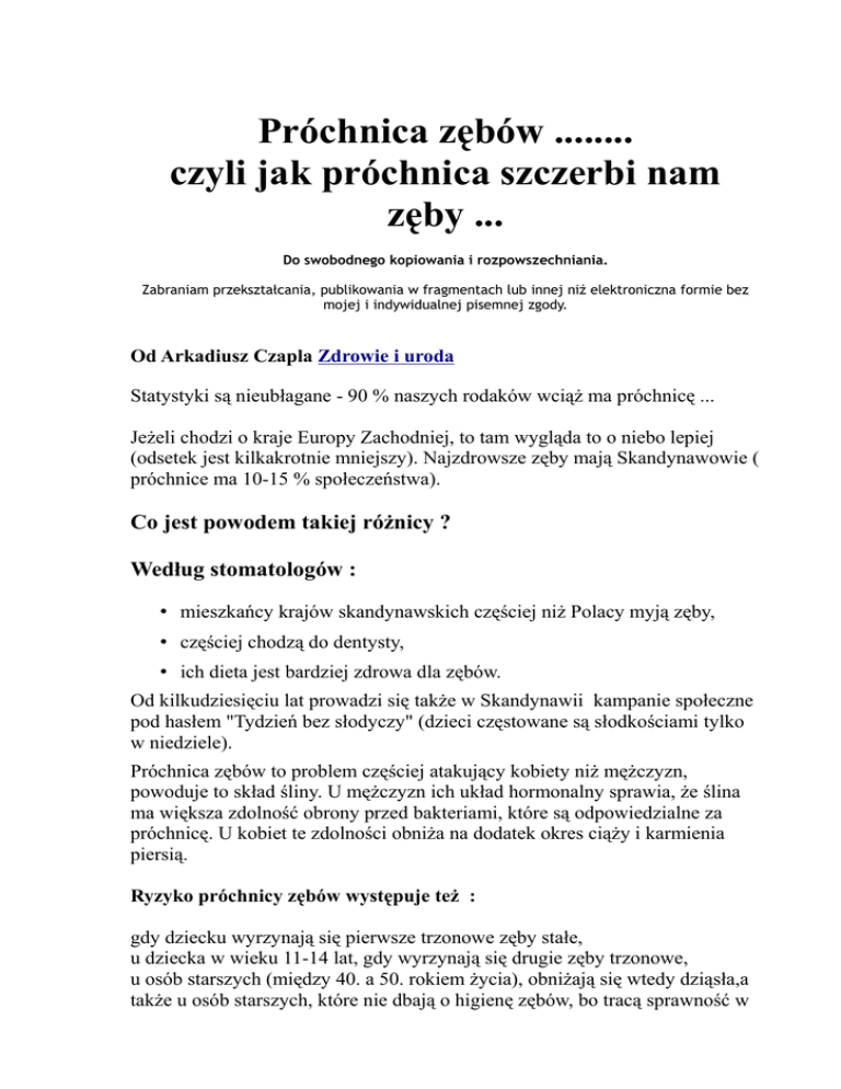 Próchnica zębów ........ czyli jak próchnica szczerbi nam zęby ... Do swobodnego kopiowania i rozpowszechniania. Zabraniam przekształcania, publikowania w fragmentach lub innej niż elektroniczna formie bez mojej i indywidualnej pisemnej zgody. Od Arkadiusz Czapla Zdrowie i uroda Statystyki są nieubłagane - 90 % naszych rodaków wciąż ma próchnicę ... Jeżeli chodzi o kraje Europy Zachodniej, to tam wygląda to o niebo lepiej (odsetek jest kilkakrotnie mniejszy). Najzdrowsze zęby mają Skandynawowie ( próchnice ma 10-15 % społeczeństwa). Co jest powodem takiej różnicy ? Według stomatologów : • mieszkańcy krajów skandynawskich częściej niż Polacy myją zęby, • częściej chodzą do dentysty, • ich dieta jest bardziej zdrowa dla zębów. Od kilkudziesięciu lat prowadzi się także w Skandynawii kampanie społeczne pod hasłem "Tydzień bez słodyczy" (dzieci częstowane są słodkościami tylko w niedziele). Próchnica zębów to problem częściej atakujący kobiety niż mężczyzn, powoduje to skład śliny. U mężczyzn ich układ hormonalny sprawia, że ślina ma większa zdolność obrony przed bakteriami, które są odpowiedzialne za próchnicę. U kobiet te zdolności obniża na dodatek okres ciąży i karmienia piersią. Ryzyko próchnicy zębów występuje też : gdy dziecku wyrzynają się pierwsze trzonowe zęby stałe, u dziecka w wieku 11-14 lat, gdy wyrzynają się drugie zęby trzonowe, u osób starszych (między 40. a 50. rokiem życia), obniżają się wtedy dziąsła,a także u osób starszych, które nie dbają o higienę zębów, bo tracą sprawność w rękach. Wiele publikacji zwraca uwagę na to, że osoby, które są dobrze wykształcone, bardziej zamożne, lepiej dbają o higienę, co powoduje lepszy stan uzębienia. Jednak według stomatologów trzeba podchodzić do tego ostrożnie, ponieważ wielu ich pacjentów (tych z najbardziej zaniedbanymi zębami to bardzo bogate osoby). Cztery przyczyny występowania próchnicy zębów (choroba rozwinie się jedynie wtedy, gdy wszystkie wystąpią jednocześnie) .. Bakterie - próchnica zębów inicjowana jest przez paciorkowce Streptococcus mutans. Gdy choroba dojdzie do głębszych partii zęba, to do pracy przystępują bakterie pałeczki - Lactobacillus. Bakterie te występują w jamie ustnej każdego z nas. Jednak w śladowych ilościach. Ich aktywność wzrasta i zaczynają się gwałtownie namnażać, gdy wraz z pokarmem dostarczymy im cukrów. Bakterie te bezpiecznie ukrywają się w płytce nazębnej. Na początku rozwijają się w niej tylko paciorkowce, ale gdy płytka nazębna dojrzeje ( np. osobnik nie myję zębów przez tydzień), to rozwiną się także bakterię pałeczki Lactobacillus. Cukry - przemiana cukrów powoduje, że paciorkowce wytwarzają w jamie ustnej zakwaszone środowisko, które sprzyja demineralizacji szkliwa. Cukry, które naturalnie występują w pokarmach (np. w owocach) nie są takie niebezpieczne, znacznie bardziej szkodliwe są cukry, które dodajemy do jedzenia (sacharoza dodawana do herbaty czy też słodyczy). Podatność zębów - tutaj wszystko uzależnione jest od naszych cech organizmu (m.in. czynniki genetyczne, które decydują o tym, czy nasze szkliwo jest słabe i bakteriom będzie łatwiej je naruszyć). Jeżeli jesteśmy osobom, która ma duża podatność na próchnice zębów, to nawet niewielka ilość spożywanych słodyczy znacznie podwyższy niebezpieczeństwo psucia się zębów. Czas - próchnica wystąpi wtedy, gdy wszystkie wymienione czynniki wystąpią jednocześnie i przez dłuższy okres. Dla jednej osoby musi to trwać kilkanaście lat, dla innej kilka. Gdy jesteśmy szczególnie podatni na próchnice, to wystarczy, że zaniedbamy higienę zębów przez kilkanaście tygodni. Przebieg próchnicy zęba .. Nasz ząb zbudowany jest z czterech rodzajów tkanki. Na powierzchni znajduje się szkliwo (jest to najtwardsza tkanka, która występuje w naszym organizmie), po szkliwem mamy inę i cement korzeniowy, a wewnętrzną komorę zęba wypełnia miazga. Pierwszy etap próchnicy zęba to pojawienie się na zaatakowanym szkliwie jedynie niewielkiej plamki. Nie jest to zmiana, którą można samu zauważyć (plamka jest biaława i matowa), więc nie różni się zbytnio od zdrowej tkanki. Nie przeoczy jej doświadczony dentysta, ponieważ inaczej rozprasza się na jej powierzchni światło. Taka plamka, która daję początek próchnicy, najczęściej pojawia się wzdłuż bruzd i dołków (jest to tzw. powierzchnia żująca zęba i trudno dostępna powierzchnia statyczna). Ten proces można jeszcze odwrócić, a plamka może całkowicie się zagoić. Następnie (kolejny etap choroby) dochodzi do próchnicy powierzchniowej. Mówi się wtedy już o ubytku (potoczna dziura w zębie) Powierzchnia zęba jest szorstka, a zmiany nie będzie można już zagoić. Próchnica średnia (zaawansowana postać choroby, do jednej trzeciej głębokości zębiny i próchnica głęboka (może dojść do samej miazgi) to kolejne etapy choroby. Przy próchnicy średniej ubytek (gdy znajduje się w widocznym miejscu) zmiany możemy zauważyć sami, gdy będziemy oglądać zęby w lustrze (używając lusterka dentystycznego). Gdy jesteśmy osobą bardzo wrażliwą, to na tym etapie choroby, możemy odczuwać ból, szczególnie po zjedzeniu czegoś słodkiego. U innych osób próchnica rozwija się dalej bez bólu. Dotkliwy ból pojawi się dopiero przy próchnicy głębokiej. Może pojawić się samoistnie, bez żadnego czynnika zewnętrznego. Może też boleć po zjedzeniu czegoś słodkiego, zimnego, gorącego oraz przy gryzieniu (jest to znak, że choroba zaatakowała już miazgę zęba). Jeżeli osoba chora nie wybierze się do dentysty, to nastąpi nieodwracalne zapalenie miazgi i martwica zęba. Ząb przestaje chwilowo boleć, ale martwa miazga staje się pożywką dla bakterii, które doprowadzają ją do rozkładu (zgorzel). To spowoduje zapalen