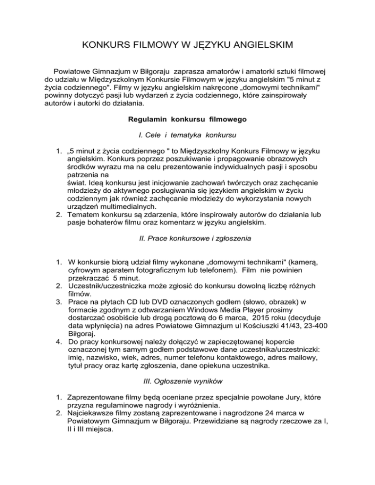 KONKURS FILMOWY W JĘZYKU ANGIELSKIM Powiatowe Gimnazjum w Biłgoraju zaprasza amatorów i amatorki sztuki filmowej do udziału w Międzyszkolnym Konkursie Filmowym w języku angielskim "5 minut z życia codziennego". Filmy w języku angielskim nakręcone „domowymi technikami" powinny dotyczyć pasji lub wydarzeń z życia codziennego, które zainspirowały autorów i autorki do działania. Regulamin konkursu filmowego I. Cele i tematyka konkursu 1. „5 minut z życia codziennego " to Międzyszkolny Konkurs Filmowy w języku angielskim. Konkurs poprzez poszukiwanie i propagowanie obrazowych środków wyrazu ma na celu prezentowanie indywidualnych pasji i sposobu patrzenia na świat. Ideą konkursu jest inicjowanie zachowań twórczych oraz zachęcanie młodzieży do aktywnego posługiwania się językiem angielskim w życiu codziennym jak również zachęcanie młodzieży do wykorzystania nowych urządzeń multimedialnych. 2. Tematem konkursu są zdarzenia, które inspirowały autorów do działania lub pasje bohaterów filmu oraz komentarz w języku angielskim. II. Prace konkursowe i zgłoszenia 1. W konkursie biorą udział filmy wykonane „domowymi technikami" (kamerą, cyfrowym aparatem fotograficznym lub telefonem). Film nie powinien przekraczać 5 minut. 2. Uczestnik/uczestniczka może zgłosić do konkursu dowolną liczbę różnych filmów. 3. Prace na płytach CD lub DVD oznaczonych godłem (słowo, obrazek) w formacie zgodnym z odtwarzaniem Windows Media Player prosimy dostarczać osobiście lub drogą pocztową do 6 marca, 2015 roku (decyduje data wpłynięcia) na adres Powiatowe Gimnazjum ul Kościuszki 41/43, 23-400 Biłgoraj. 4. Do pracy konkursowej należy dołączyć w zapieczętowanej kopercie oznaczonej tym samym godłem podstawowe dane uczestnika/uczestniczki: imię, nazwisko, wiek, adres, numer telefonu kontaktowego, adres mailowy, tytuł pracy oraz kartę zgłoszenia, dane opiekuna uczestnika. III. Ogłoszenie wyników 1. Zaprezentowane filmy będą oceniane przez specjalnie powołane Jury, które przyzna regulaminowe nagrody i wyróżnienia. 2. Najciekawsze filmy zostaną zaprezentowane i nagrodzone 24 marca w Powiatowym Gimnazjum w Biłgoraju. Przewidziane są nagrody rzeczowe za I, II i III miejsca. IV. Zasady uczestnictwa 1. Przesłanie filmu do konkursu jest równoznaczne z akceptacją niniejszych zasad, pozwoleniem na publiczną prezentację prac oraz wykorzystanie ich do celów promocyjnych konkursu. 2. Koszty przesyłki ponoszą autorzy/autorki prac. Nadesłane prace i dokumenty nie podlegają zwrotowi. 3. Praca konkursowa nie może naruszać praw autorskich oraz prawa do prywatności osób trzecich. Prezentowane w niej treści nie mogą przedstawiać ani propagować zachowań zabronionych przez prawo, nieobyczajnych lub godzących w zasady dobrego wychowania i kultury osobistej. 4. Uczestnik oświadcza, że jest autorem zgłoszonej pracy oraz posiada do niej wszelkie prawa autorskie. Równocześnie zgadza się na wykorzystanie filmu w celach promocji konkursu. 5. W przypadku wykorzystania w filmie materiałów archiwalnych bądź fragmentów innych filmów konieczne jest posiadanie przez uczestnika zgody oraz dołączenie do karty zgłoszenia oświadczenia o tym, że taką zgodę posiada. 6. Zgłoszenie prac na konkurs uważane będzie za uznanie warunków regulaminu, wyrażenie zgody na publikowanie danych osobowych zgodnie z ustawą z dnia 28.08.1997r. o ochronie danych osobowych [Dz.U.Nr.133 poz.883] oraz rozszerzenie praw autorskich oraz majątkowych na rzecz Powiatowego Gimnazjum w Biłgoraju. Tym samym uczestnicy konkursu nie mogą rozpowszechniać prac konkursowych poprzez np. umieszczanie ich w Internecie przed ogłoszeniem oficjalnych wyników konkursu. 7. Pełnoletni uczestnicy konkursu zobowiązani są do złożenia pisemnego oświadczenia, w którym wyrażają zgodę na przetwarzanie swoich danych osobowych [w tym wykorzystanie wizerunku]. W przypadku osób niepełnoletnich konieczne jest wyrażenie pisemnej zgody rodziców lub prawnych opiekunów. Kontakt do organizatora: Powiatowe Gimnazjum w Biłgoraju ul. Kościuszki 41/43, 23-400 Biłgoraj tel. 84 686 04 42 Adres e-mail szkoły: [email protected] Sekretariat szkoły: [email protected] W. Waszczuk-Różańska tel. 697 956 529