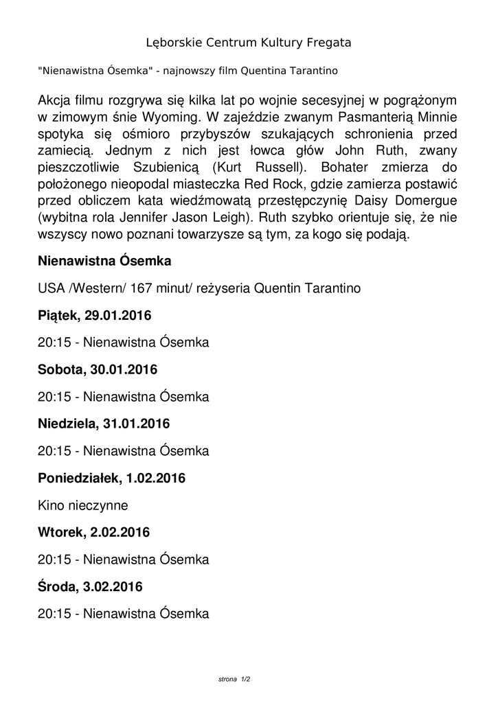 Lęborskie Centrum Kultury Fregata "Nienawistna Ósemka" - najnowszy film Quentina Tarantino Akcja filmu rozgrywa się kilka lat po wojnie secesyjnej w pogrążonym w zimowym śnie Wyoming. W zajeździe zwanym Pasmanterią Minnie spotyka się ośmioro przybyszów szukających schronienia przed zamiecią. Jednym z nich jest łowca głów John Ruth, zwany pieszczotliwie Szubienicą (Kurt Russell). Bohater zmierza do położonego nieopodal miasteczka Red Rock, gdzie zamierza postawić przed obliczem kata wiedźmowatą przestępczynię Daisy Domergue (wybitna rola Jennifer Jason Leigh). Ruth szybko orientuje się, że nie wszyscy nowo poznani towarzysze są tym, za kogo się podają. Nienawistna Ósemka USA /Western/ 167 minut/ reżyseria Quentin Tarantino Piątek, 29.01.2016 20:15 - Nienawistna Ósemka Sobota, 30.01.2016 20:15 - Nienawistna Ósemka Niedziela, 31.01.2016 20:15 - Nienawistna Ósemka Poniedziałek, 1.02.2016 Kino nieczynne Wtorek, 2.02.2016 20:15 - Nienawistna Ósemka Środa, 3.02.2016 20:15 - Nienawistna Ósemka strona 1/2 Czwartek, 4.02.2016 20:15 - Nienawistna Ósemka Ceny biletów 2D: 13 (normalny), 12 (ulgowy) i 11 (zamówienia zbiorowe powyżej 15 osób). Rezerwacje telefoniczne przyjmowane są w kinie „Fregata” od poniedziałku do piątku w godzinach od 10:00 do 15:00 pod numerem telefonu 59 8622-530. strona 2/2 Powered by TCPDF (www.tcpdf.org)