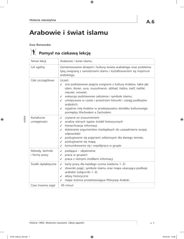 Historia starożytna A.6 Arabowie i świat islamu Ewa Ronowska U20509 Pomysł na ciekawą lekcję Temat lekcji Arabowie i świat islamu. Cel ogólny Zainteresowanie dziejami i kulturą świata arabskiego oraz problematyką związaną z narodzinami islamu i kształtowaniem się imperium arabskiego. Cele szczegółowe Uczeń: ✓ zna podstawowe pojęcia związane z kulturą Arabów, takie jak: islam, Koran, sura, muzułmanin, dżihad, hidżra, kalif, kalifat, meczet, minaret; ✓ wskazuje podstawowe założenia i symbole islamu; ✓ umiejscawia w czasie i przestrzeni kierunki i zasięg podbojów arabskich; ✓ wyjaśnia rolę Arabów w przekazywaniu dorobku kulturowego pomiędzy Wschodem a Zachodem. Kształcone umiejętności ✓ ✓ ✓ ✓ ✓ ✓ ✓ Metody, techniki i formy pracy ✓ Środki dydaktyczne ✓ Czas trwania zajęć czytanie ze zrozumieniem analiza różnych typów źródeł historycznych hierarchizacja informacji dobieranie argumentów niezbędnych do uzasadnienia swojej odpowiedzi posługiwanie się pojęciami właściwymi dla danego tematu posługiwanie się mapą komunikowanie się i współpraca w grupie podająca – objaśnienie praca w grupach ✓ praca z różnymi źródłami informacji ✓ karty pracy dla każdego ucznia (zadania 1–2) ✓ słowniki pojęć, symbole islamu oraz mapa ukazująca podboje arabskie (załączniki 1–3) ✓ atlasy historyczne ✓ mapa ścienna przedstawiająca Półwysep Arabski 45 minut Historia i WOS. Skuteczne nauczanie. Udany egzamin 8105_Historia_A6.indd 1 s. 1 09-04-20 15:26 Historia starożytna A.6 Przebieg zajęć E Etapy l k ji lekcji Czynności C ś i nauczyciela i l i uczniów ió 4 Podajemy temat lekcji. W ramach krótkiego wprowadzenia omawiamy położenie geograficzne i warunki naturalne Półwyspu Arabskiego (korzystamy z atlasu lub mapy ściennej). Wskazujemy Mekkę i Medynę. Badanie (I) i przekształcanie (I) 8 Dzielimy uczniów na cztery grupy. Prosimy, aby zapoznali się z treścią tekstów źródłowych i poleceń przypisanych ich grupie (zadanie 1). Każdemu zespołowi przydzielamy również mapę ukazującą podboje arabskie (załącznik 3). Gdy uczniowie pracują w grupach, rozdajemy kserokopie słowniczka zawierającego objaśnienia podstawowych pojęć związanych z islamem (załącznik 1). Prezentacja (I) 8 W tej części lekcji następuje prezentacja wyników pracy poszczególnych grup. Prezentacja grupy IV musi odbywać się przy użyciu atlasów lub mapy ściennej. Jeśli zajdzie taka potrzeba, uzupełniamy odpowiedzi uczniów i wyjaśniamy podstawową terminologię związaną z islamem. Badanie (II) i przekształcanie (II) 15 Prezentujemy i objaśniamy symbole islamu (załącznik 2). Następnie przedstawiamy krótko osiągnięcia nauki arabskiej oraz podkreślamy rolę, jaką Arabowie odegrali w przekazywaniu osiągnięć cywilizacji starożytnych i dalekowschodnich średniowiecznym Europejczykom (np. cyfry arabskie). Polecamy uczniom, aby zapoznali się z tekstem źródłowym (wyznaczony uczeń może odczytać tekst na głos) i przygotowali się do ustnej odpowiedzi na pytania (zadanie 2). Prezentacja (II) 4 Chętni uczniowie odpowiadają na pytania. Podsumowanie 6 Na koniec zajęć prosimy uczniów, aby wymienili najważniejsze cechy islamu. Pozwalamy wypowiedzieć się chętnym osobom. Jako pisemną pracę domową polecamy przygotowanie zestawienia zawierającego najważniejsze osiągnięcia kultury arabskiej. U20509 Wprowadzenie s. 2 8105_Historia_A6.indd 2 C as Czas w minutach Historia i WOS. Skuteczne nauczanie. Udany egzamin 09-04-20 15:26 Historia starożytna A.6 Zadania dla ucznia 1. Pracując w grupach, wykonajcie polecenia. GRUPA I Przeczytajcie tekst i przygotujcie plan ustnej wypowiedzi na temat życia i działalności Mahometa. Na notatki wykorzystajcie miejsce pod tekstem. Mahomet (ur. ok. 570 r. w Mekce, zm. w 632 r. w Medynie) U20509 Reformator społeczny i religijny, twórca islamu i prawodawca arabski. Urodził się w rodzinie kupieckiej, ale w dzieciństwie zaznał biedy. Kiedy miał około 40 lat doznał, jak wierzył, objawienia od Boga Allaha za pośrednictwem Archanioła Gabriela. Od tego czasu uznawał się za proroka Allaha i głosił nową religię mono-teistyczną (islam) wśród Arabów, którzy dotąd wierzyli w istnienie wielu bóstw. Jednak mieszkańcy Mekki odrzucili jego religię, dlatego Mahomet musiał opuścić rodzinne miasto i wraz z grupą zwolenników schronił się w Medynie. Data tej ucieczki, zwanej hidżrą (rok 622 ery chrześcijańskiej), przyjęta została potem za pierwszy rok ery muzułmańskiej. Począwszy od niej liczone są kolejne lata w kalendarzu islamskim. W Medynie Mahomet szybko zdobył licznych wyznawców; miasto stało się centrum nowej religii. W założonej przez Mahometa pierwszej gminie muzułmańskiej (islamskiej) powstały nowe przepisy prawne i zasady życia społecznego, które następnie zostały spisane w Koranie i zaczęły obowiązywać wszystkich wyznawców Allaha. W 630 roku Mahomet zdobył Mekkę, gdzie zniszczył posągi wszystkich bogów, zachowując jednak kult Czarnego Kamienia w świątyni Kaaba. Do dziś jest to najważniejsze święte miejsce islamu. Wyznawcy innych religii nie mają tam wstępu. Mekka stała się z woli Mahometa stolicą nowego państwa arabskiego. Po śmierci Mahometa na czele muzułmanów stanął jego teść, który przyjął tytuł kalifa, czyli następcy proroka. .............................................................................................................................................. .............................................................................................................................................. .............................................................................................................................................. .....................................................................................................................