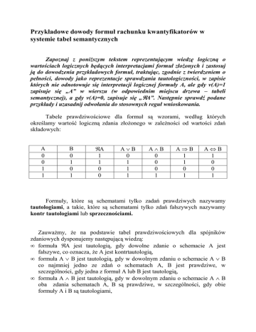 Przykładowe dowody formuł rachunku kwantyfikatorów w systemie tabel semantycznych Zapoznaj z poniŜszym tekstem reprezentującym wiedzę logiczną o wartościach logicznych będących interpretacjami formuł złoŜonych i zastosuj ją do dowodzenia przykładowych formuł, traktując, zgodnie z twierdzeniem o pełności, dowody jako reprezentacje sprawdzania tautologiczności, w zapisie których nie odnotowuje się interpretacji logicznej formuły A, ale gdy v(A)=1 zapisuje się „A” w wierszu (w odpowiednim miejscu drzewa – tabeli semantycznej), a gdy v(A)=0, zapisuje się „¬A”. Następnie sprawdź podane przykłady i uzasadnij odwołania do stosownych reguł wnioskowania. Tabele prawdziwościowe dla formuł są wzorami, według których określamy wartość logiczną zdania złoŜonego w zaleŜności od wartości zdań składowych: A 0 0 1 1 B 0 1 0 1 ¬A 1 1 0 0 A∨B 0 1 1 1 A∧B 0 0 0 1 A⇒B 1 1 0 1 A⇔B 1 0 0 1 Formuły, które są schematami tylko zadań prawdziwych nazywamy tautologiami, a takie, które są schematami tylko zdań fałszywych nazywamy kontr tautologiami lub sprzecznościami. ZauwaŜmy, Ŝe na podstawie tabel prawdziwościowych dla spójników zdaniowych dysponujemy następującą wiedzą: • formuła ¬A jest tautologią, gdy dowolne zdanie o schemacie A jest fałszywe, co oznacza, Ŝe A jest kontrtautologią, • formuła A ∨ B jest tautologią, gdy w dowolnym zdaniu o schemacie A ∨ B co najmniej jedno ze zdań o schematach A, B jest prawdziwe, w szczególności, gdy jedna z formuł A lub B jest tautologią, • formuła A ∧ B jest tautologią, gdy w dowolnym zdaniu o schemacie A ∧ B oba zdania schematach A, B są prawdziwe, w szczególności, gdy obie formuły A i B są tautologiami, • formuła A ⇒ B jest tautologią, gdy w dowolnym zdaniu o schemacie A ⇒ B, jeŜeli zdanie o schemacie A jest prawdziwe, to zdanie o schemacie B jest prawdziwe, w szczególności, jeŜeli formuła A jest tautologią, to B jest teŜ tautologią, • formuła A ⇔ B jest tautologią, gdy w dowolnym zdaniu o schemacie A ⇔ B oba zdania o schematach A, B mają tę samą wartość logiczną, w szczególności, gdy obie formuły A i B są tautologiami lub kontrtautologiami, RozwaŜmy teraz formuły poprzedzone kwantyfikatorami. Niech A(x) jest dowolną formułą, w której x jest jedyną zmienną wolną. Oznaczmy zbiór wszystkich zdań, których schematem jest ta formuła przez P, gdy wszystkie zdania tego zbioru są prawdziwe, przez F, gdy są fałszywe, a przez T, gdy niektóre zdania tego zbioru są prawdziwe, a niektóre fałszywe. Wiedzę o wartościach logicznych zdań, których schematem jest formuła ∀xA(x) lub formuła ∃xA(x) reprezentuje tabela Wiedzę reprezentowaną przez powyŜszą tabelę, dla dowolnych funkcji interpretacji, moŜemy teŜ sformułować następująco: • jeŜeli formuła ∀xA(x) jest schematem zdania prawdziwego, to formuła A(x) jest schematem zdań wśród których kaŜde zdanie jest prawdzie, np. zdanie o schemacie A(c), gdzie wybór termu c nie zaleŜy od formuły A(x), a jedynie od dziedziny argumentu x, jest więc dowolny, • jeŜeli formuła ∃xA(x) jest schematem zdania prawdziwego, to formuła A(x) jest schematem zdań wśród których co najmniej jedno zdanie jest prawdzie, np. zdanie o schemacie A(c), gdzie wybór termu c zaleŜy od formuły A(x) i od dziedziny argumentu x, a więc moŜe być dokonany tylko raz podczas formalizacji tekstu, • jeŜeli formuła ¬∀xA(x) jest schematem zdania prawdziwego, to formuła ¬A(x) jest schematem zdań wśród których co najmniej jedno zdanie jest prawdzie, np. zdanie o schemacie ¬A(c), gdzie wybór termu c zaleŜy od formuły A(x) i od dziedziny argumentu x, a więc moŜe być dokonany tylko raz podczas formalizacji tekstu, • jeŜeli formuła ¬∃xA(x) jest schematem zdania prawdziwego, to formuła ¬A(x) jest schematem zdań wśród których kaŜde zdanie jest prawdzie, np. zdanie o schemacie ¬A(c), gdzie wybór termu c nie zaleŜy od formuły A(x), a jedynie od dziedziny argumentu x, jest więc dowolny, Przykład 1. L1. (modus ponendo ponens) (((A⇒B)∧ A) ⇒ B) Dowód. 1. ¬(((A⇒B)∧ A) ⇒ B) 2. ((A⇒B)∧ A) 3. ¬B 4. (A⇒B) 5. A 6.1 ¬A 6.2 sprz. 5, 6.1 6. ¬A⇒ sprz. 7.1 B 7.1 sprz. 3, 7.1 7. B⇒ sprz. 6. sprz. (załdow.mwp.) (1, (NC)) (1, (NC)) (2, (K)) (2, (K)) (4, (C), zał.dod.) (6.1->6,2) (4, (C), zał.dod.) (7.1->7,2) (z 4 wynika sprz., 6, 7) L2. (modus tollendo tollens) (((A⇒B)∧ ¬B) ⇒ ¬A) Dowód. (analogiczny jak w L1) L3. (modus tollendo ponens) (((A∨B)∧ ¬B) ⇒ A) Dowód. 1. ¬(((A∨B)∧ ¬B) ⇒ A) 2. ((A∨B)∧ ¬B) 3. ¬A 4. (A∨B) 5. ¬B 6.1 A 6.2 sprz. 3, 6.1 6. A ⇒ sprz. 7.1 B 7.2 sprz. 5, 7.1 7. B ⇒ sprz. 8. sprz. (zał.dow.nwp.) (1, (NC)) (1, (NC)) (2, (K)) (2, (K)) (4,(A), zał.dod) (6.1->6.2) (4, (A), zał.dod.) (7.1->7.2) (z 4 wynika sprz., 6, 7) L4. (prawo transpozycji) ((A ⇒ B) ⇔ (¬B ⇒ ¬A)) Dowód. 1. ¬((A ⇒ B) ⇔ (¬B ⇒ ¬A)) 2.1 (A ⇒ B) ∧ ¬(¬B ⇒ ¬A) 2.2 (A ⇒ B) 2.3 ¬(¬B ⇒ ¬A) 2.4 ¬B 2.5 ¬¬A 2.6 A 2.7.1 ¬A 2.7.2 sprz. 2.6, 2.7.1 2.8.1 B 2.8.1 sprz. 2.4, 2.8.1 3.1 ¬(A ⇒ B) ∧ (¬B ⇒ ¬A) 3.2 ¬(A ⇒ B) 3.3 (¬B ⇒ ¬A) 3.4 A 3.5 ¬B 3.6.1 ¬¬B 3.6.2 B 3.6.3 sprz. 3.5, 3.6.2 3.7.1 ¬A 3.7.2 sprz. 3.4, 3.7.1 3. sprz. (zał.dow.nwp.) (1, (NE), zał.dod.) (2.1, (K)) (2.1, (K)) (2.3, (NC)) (2.3, (NC)) (2.5, (NN)) (2.1, (C), zał.dod.) (2.2, (C), zał.dod.) (1. (NE), zał.dod.)) (3.1, (K)) (3.1, (K)) (3.2, (NC)) (3.2, (NC)) (3.3, (C), zał.dod.) (3.6.1, (NN)) (3.3, (C), zał.dod.) Dowód. (notacja drzewowa) ¬((A ⇒ B) ⇔ (¬B ⇒ ¬A)) ¬(A ⇒ B) (¬B ⇒ ¬A) (A ⇒ B) ¬(¬B ⇒ ¬A) ¬B ¬¬A A A ¬B ¬¬B B ¬A ¬A B L5. (prawo redukcji do absurdu) (((A ⇒ B) ∧ (A ⇒ ¬B)) ⇒ ¬A) Dowód. (notacja drzewowa) ¬(((A ⇒ B) ∧ (A ⇒ ¬B)) ⇒ ¬A) ((A ⇒ B) ∧ (A ⇒ ¬B)) ¬¬A A (A ⇒ B) (A ⇒ ¬B) ¬A B ¬A ¬B L6. (prawo negacji implikacji) (¬