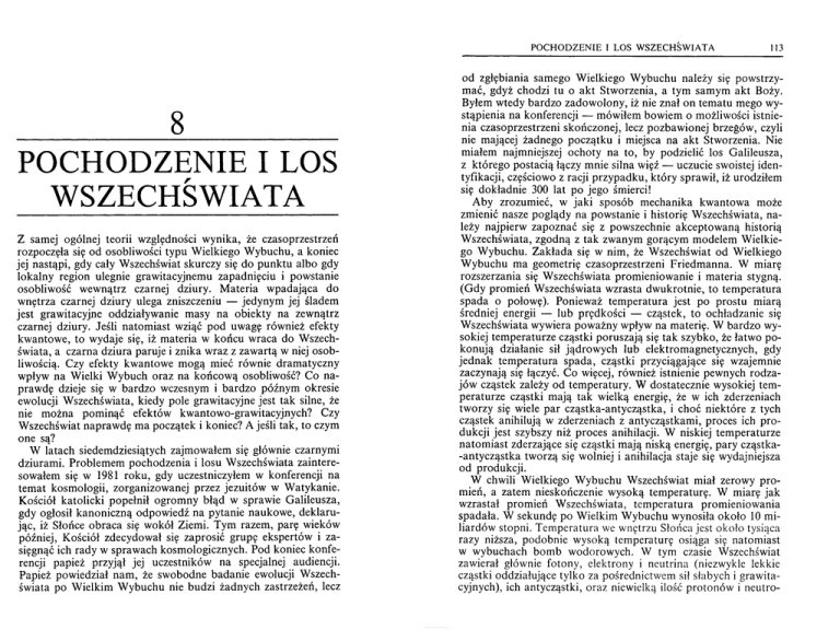 POCHODZENIE I LOS WSZECHŚWIATA 8 POCHODZENIE I LOS WSZECHŚWIATA _____________________________ _____________________________ Z samej ogólnej teorii względności wynika, że czasoprzestrzeń rozpoczęła się od osobliwości typu Wielkiego Wybuchu, a koniec jej nastąpi, gdy cały Wszechświat skurczy się do punktu albo gdy lokalny region ulegnie grawitacyjnemu zapadnięciu i powstanie osobliwość wewnątrz czarnej dziury. Materia wpadająca do wnętrza czarnej dziury ulega zniszczeniu — jedynym jej śladem jest grawitacyjne oddziaływanie masy na obiekty na zewnątrz czarnej dziury. Jeśli natomiast wziąć pod uwagę również efekty kwantowe, to wydaje się, iż materia w końcu wraca do Wszech świata, a czarna dziura paruje i znika wraz z zawartą w niej osob liwością. Czy efekty kwantowe mogą mieć równie dramatyczny wpływ na Wielki Wybuch oraz na końcową osobliwość? Co na prawdę dzieje się w bardzo wczesnym i bardzo późnym okresie ewolucji Wszechświata, kiedy pole grawitacyjne jest tak silne, że nie można pominąć efektów kwantowo-grawitacyjnych? Czy Wszechświat naprawdę ma początek i koniec? A jeśli tak, to czym one są? W latach siedemdziesiątych zajmowałem się głównie czarnymi dziurami. Problemem pochodzenia i losu Wszechświata zaintere sowałem się w 1981 roku, gdy uczestniczyłem w konferencji na temat kosmologii, zorganizowanej przez jezuitów w Watykanie. Kościół katolicki popełnił ogromny błąd w sprawie Galileusza, gdy ogłosił kanoniczną odpowiedź na pytanie naukowe, deklaru jąc, iż Słońce obraca się wokół Ziemi. Tym razem, parę wieków później, Kościół zdecydował się zaprosić grupę ekspertów i za sięgnąć ich rady w sprawach kosmologicznych. Pod koniec konfe rencji papież przyjął jej uczestników na specjalnej audiencji. Papież powiedział nam, że swobodne badanie ewolucji Wszech świata po Wielkim Wybuchu nie budzi żadnych zastrzeżeń, lecz 113 od zgłębiania samego Wielkiego Wybuchu należy się powstrzy mać, gdyż chodzi tu o akt Stworzenia, a tym samym akt Boży. Byłem wtedy bardzo zadowolony, iż nie znał on tematu mego wy stąpienia na konferencji — mówiłem bowiem o możliwości istnie nia czasoprzestrzeni skończonej, lecz pozbawionej brzegów, czyli nie mającej żadnego początku i miejsca na akt Stworzenia. Nie miałem najmniejszej ochoty na to, by podzielić los Galileusza, z którego postacią łączy mnie silna więź — uczucie swoistej iden tyfikacji, częściowo z racji przypadku, który sprawił, iż urodziłem się dokładnie 300 lat po jego śmierci! Aby zrozumieć, w jaki sposób mechanika kwantowa może zmienić nasze poglądy na powstanie i historię Wszechświata, na leży najpierw zapoznać się z powszechnie akceptowaną historią Wszechświata, zgodną z tak zwanym gorącym modelem Wielkie go Wybuchu. Zakłada się w nim, że Wszechświat od Wielkiego Wybuchu ma geometrię czasoprzestrzeni Friedmanna. W miarę rozszerzania się Wszechświata promieniowanie i materia stygną. (Gdy promień Wszechświata wzrasta dwukrotnie, to temperatura spada o połowę). Ponieważ temperatura jest po prostu miarą średniej energii — lub prędkości — cząstek, to ochładzanie się Wszechświata wywiera poważny wpływ na materię. W bardzo wy sokiej temperaturze cząstki poruszają się tak szybko, że łatwo po konują działanie sił jądrowych lub elektromagnetycznych, gdy jednak temperatura spada, cząstki przyciągające się wzajemnie zaczynają się łączyć. Co więcej, również istnienie pewnych rodza jów cząstek zależy od temperatury. W dostatecznie wysokiej tem peraturze cząstki mają tak wielką energię, że w ich zderzeniach tworzy się wiele par cząstka-antycząstka, i choć niektóre z tych cząstek anihilują w zderzeniach z antycząstkami, proces ich pro dukcji jest szybszy niż proces anihilacji. W niskiej temperaturze natomiast zderzające się cząstki mają niską energię, pary cząstka-antycząstka tworzą się wolniej i anihilacja staje się wydajniejsza od produkcji. W chwili Wielkiego Wybuchu Wszechświat miał zerowy pro mień, a zatem nieskończenie wysoką temperaturę. W miarę jak wzrastał promień Wszechświata, temperatura promieniowania spadała. W sekundę po Wielkim Wybuchu wynosiła około 10 mi liardów stopni. Temperatura we wnętrzu Słońca jest około tysiąca razy niższa, podobnie wysoką temperaturę osiąga się natomiast w wybuchach bomb wodorowych. W tym czasie Wszechświat zawierał głównie fotony, elektrony i neutrina (niezwykle lekkie cząstki oddziałujące tylko za pośrednictwem sił słabych i grawita cyjnych), ich antycząstki, oraz niewielką ilość protonów i neutro KRÓTKA HISTORIA CZASU POCHODZENIE I LOS WSZECHŚWIATA nów. W miarę rozszerzania się Wszechświata i spadku temperatu ry malało tempo produkcji par elektron-antyelektron, aż wreszcie stało się wolniejsze niż tempo anihilacji. Wtedy większość elektronów i antyelektronów uległa anihilacji, tworząc fotony; ocalały tylko nieliczne elektrony. Natomiast neutrina i antyneutrina nie zniknęły, ponieważ oddziałują ze sobą zbyt słabo. Powinny one istnieć po dziś dzień; gdybyśmy potrafili je wykryć, uzyskalibyśmy wspaniałe potwierdzenie naszkicowanego tutaj obrazu wczesnej historii Wszechświata. Niestety, neutrina te mają zbyt niską energię, by można je było wykryć bezpośrednio. Jeśli jednak mają małą, lecz różną od zera masę, jak to sugeruje nie potwierdzony eksperyment rosyjski z 1981 roku, moglibyśmy wykryć je pośrednio. Mianowicie mogą one stanowić część „cie mnej materii”, której grawitacyjne przyciąganie jest dostatecznie silne, by powstrzymać ekspansję Wszechświata i spowodować jego skurczenie się. Mniej więcej w sto sekund po Wielkim Wybuchu temperatura spadła do miliarda stopni; taka temperatura panuje we wnętrzach najgorętszych gwiazd. W tej temperaturze protony i neutrony ma ją