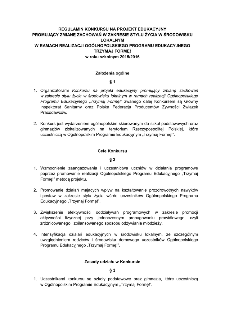 REGULAMIN KONKURSU NA PROJEKT EDUKACYJNY PROMUJĄCY ZMIANĘ ZACHOWAŃ W ZAKRESIE STYLU ŻYCIA W ŚRODOWISKU LOKALNYM W RAMACH REALIZACJI OGÓLNOPOLSKIEGO PROGRAMU EDUKACYJNEGO TRZYMAJ FORMĘ! w roku szkolnym 2015/2016 Założenia ogólne §1 1. Organizatorami Konkursu na projekt edukacyjny promujący zmianę zachowań w zakresie stylu życia w środowisku lokalnym w ramach realizacji Ogólnopolskiego Programu Edukacyjnego „Trzymaj Formę!” zwanego dalej Konkursem są Główny Inspektorat Sanitarny oraz Polska Federacja Producentów Żywności Związek Pracodawców. 2. Konkurs jest wydarzeniem ogólnopolskim skierowanym do szkół podstawowych oraz gimnazjów zlokalizowanych na terytorium Rzeczypospolitej Polskiej, które uczestniczą w Ogólnopolskim Programie Edukacyjnym „Trzymaj Formę!”. Cele Konkursu §2 1. Wzmocnienie zaangażowania i uczestnictwa uczniów w działania programowe poprzez promowanie realizacji Ogólnopolskiego Programu Edukacyjnego „Trzymaj Formę!” metodą projektu. 2. Promowanie działań mających wpływ na kształtowanie prozdrowotnych nawyków i postaw w zakresie stylu życia wśród uczestników Ogólnopolskiego Programu Edukacyjnego „Trzymaj Formę!”. 3. Zwiększenie efektywności oddziaływań programowych w zakresie promocji aktywności fizycznej przy jednoczesnym propagowaniu prawidłowego, czyli zróżnicowanego i zbilansowanego sposobu odżywiania młodzieży. 4. Intensyfikacja działań edukacyjnych w środowisku lokalnym, ze szczególnym uwzględnieniem rodziców i środowiska domowego uczestników Ogólnopolskiego Programu Edukacyjnego „Trzymaj Formę!”. Zasady udziału w Konkursie §3 1. Uczestnikami konkursu są szkoły podstawowe oraz gimnazja, które uczestniczą w Ogólnopolskim Programie Edukacyjnym „Trzymaj Formę!”. 2. Każda szkoła może nadesłać 1 pracę konkursową. 3. Realizatorami zadania konkursowego są zespoły projektowe (nauczycieli i uczniów) składające się z co najmniej 1 nauczyciela oraz 5-10 osobowej grupy uczniów. Funkcję koordynatora projektu pełni nauczyciel. 4. Zadanie Konkursowe polega na przygotowaniu i opisaniu projektu edukacyjnego zrealizowanego albo będącego w trakcie realizacji oraz przesłaniu do Organizatorów konkursu pracy konkursowej obejmującej kartę projektu zgodną z załącznikiem nr 2 do niniejszego regulaminu oraz sprawozdanie z przebiegu realizacji projektu, zgodne z załącznikiem nr 3 do niniejszego regulaminu. 5. Sprawozdanie, o którym mowa w ust. 4 zawiera dokumentację zdjęciową, a także może zawierać opracowane lub wydane materiały promocyjno-oświatowe, pomoce przygotowane w ramach realizacji projektu (np. filmy, ulotki, broszury czy prezentacje multimedialne). 6. Prace konkursowe należy przesłać do właściwych terenowo dla poszczególnych placówek powiatowych stacji sanitarno-epidemiologicznych wraz z formularzami zgłoszeniowymi oraz oświadczeniami, o których mowa w § 5 ust. 3 niniejszego regulaminu. Harmonogram Konkursu §4 1. Uczestnicy przesyłają dokumenty o których mowa w §3 ust. 6 do właściwych terenowo dla poszczególnych placówek powiatowych stacji sanitarno-epidemiologicznych w terminie do dnia 15 kwietnia 2016 r. (decyduje data stempla pocztowego). 2. Powiatowe stacje sanitarno-epidemiologiczne przeprowadzają ocenę prac konkursowych na poziomie powiatowym. Państwowy Powiatowy Inspektor Sanitarny powołuje jury na poziomie powiatowym, które ocenia prace konkursowe. Kryteria oceny przez jury na poziomie powiatowym są zgodne z kryteriami określonymi w § 5 niniejszego regulaminu. W terminie do dnia 6 maja 2016 r. jury na poziomie powiatowym przesyła do wojewódzkiej stacji sanitarno-epidemiologicznej 1 pracę, która została najlepiej oceniona. 3. Wojewódzkie stacje sanitarno-epidemiologiczne przeprowadzają ocenę prac konkursowych na poziomie wojewódzkim. Państwowy Wojewódzki Inspektor Sanitarny powołuje jury na poziomie wojewódzkim, które ocenia prace konkursowe. Kryteria oceny przez jury na poziomie wojewódzkim są zgodne z kryteriami określonymi w § 5 niniejszego regulaminu. W terminie do dnia 20 maja 2016 r. jury na poziomie wojewódzkim przesyła do Głównego Inspektoratu Sanitarnego 1 pracę, która została najlepiej oceniona. 4. Główny Inspektor Sanitarny w terminie do dnia 20 maja 2016 r. powołuje Komisję Konkursową na poziomie krajowym. W skład Komisji wchodzić będą: dwóch przedstawicieli Departamentu Promocji Zdrowia, Biostatystyki i Analiz w Głównym Inspektoracie Sanitarnym; dwóch przedstawicieli Polskiej Federacji Producentów Żywności Związku Pracodawców; jeden przedstawiciel jednostki naukowo-badawczej będącej partnerem Konkursu. 5. Komisja Konkursowa na poziomie krajowym w terminie do dnia 3 czerwca 2016 r. oceni prace konkursowe i wyłoni zwycięzców. Ogłoszenie wyników oraz wręczenie nagród będzie miało miejsce w trakcie uroczystego finału konkursu w dniach 15-17 czerwca 2016 r. (środa–piątek) w Warszawie. Informacja o miejscu i godzinie uroczystego finału konkursu zostanie przekazana zwycięzcom w terminie do dnia 10 czerwca 2016 r. Kryteria oceny prac konkursowych §5 1. Nadesłane prace konkursowe będą podlegać ocenie jury na poziomie powiatowym, jury na poziomie wojewódzkim oraz Komisji Konkursowej na poziomie krajowym. 2. Prace konkursowe oceniane będą pod względem formalnym i merytorycznym. 3. Przy ocenie formalnej prac konkursowych jury konkursowe i Komisja Konkursowa biorą pod uwagę następujące kryteria: wpłynięcie prac konkursowych w terminie przewidzianym w §4 ust. 1; kompletność dokumentów konkursowych, w tym: załączenie formularza zgłoszeniowego szkoły zgodnego z załącznikiem nr 1 do niniejszego regulaminu; załączenie oświadczeń potwierdzających zgodę uczestników Konkursu na przetwarzanie przez Organizatorów ich danych osobowych na potrzeby Konkursu zgodnych z załącznikiem nr 4 do niniejszego regulaminu. 4. Prace konkurs