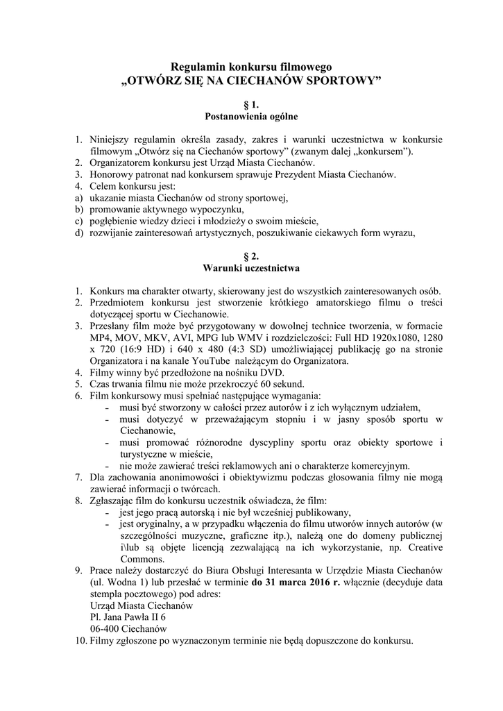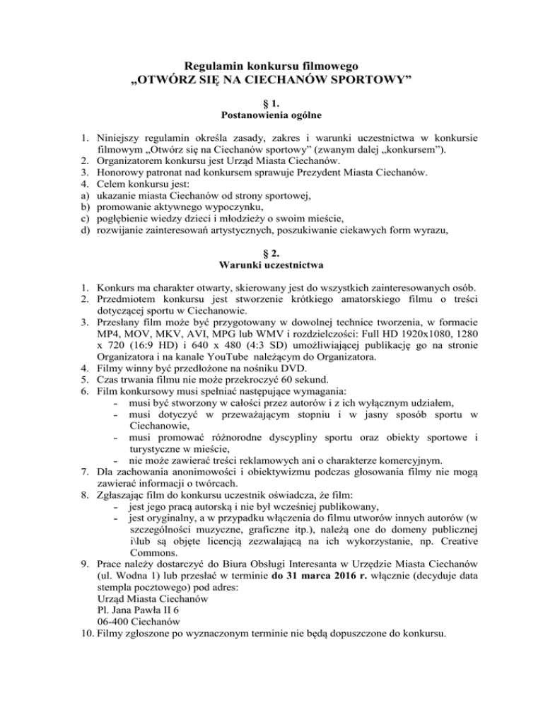 Regulamin konkursu filmowego „OTWÓRZ SIĘ NA CIECHANÓW SPORTOWY” § 1. Postanowienia ogólne 1. Niniejszy regulamin określa zasady, zakres i warunki uczestnictwa w konkursie filmowym „Otwórz się na Ciechanów sportowy” (zwanym dalej „konkursem”). 2. Organizatorem konkursu jest Urząd Miasta Ciechanów. 3. Honorowy patronat nad konkursem sprawuje Prezydent Miasta Ciechanów. 4. Celem konkursu jest: a) ukazanie miasta Ciechanów od strony sportowej, b) promowanie aktywnego wypoczynku, c) pogłębienie wiedzy dzieci i młodzieży o swoim mieście, d) rozwijanie zainteresowań artystycznych, poszukiwanie ciekawych form wyrazu, § 2. Warunki uczestnictwa 1. Konkurs ma charakter otwarty, skierowany jest do wszystkich zainteresowanych osób. 2. Przedmiotem konkursu jest stworzenie krótkiego amatorskiego filmu o treści dotyczącej sportu w Ciechanowie. 3. Przesłany film może być przygotowany w dowolnej technice tworzenia, w formacie MP4, MOV, MKV, AVI, MPG lub WMV i rozdzielczości: Full HD 1920x1080, 1280 x 720 (16:9 HD) i 640 x 480 (4:3 SD) umożliwiającej publikację go na stronie Organizatora i na kanale YouTube należącym do Organizatora. 4. Filmy winny być przedłożone na nośniku DVD. 5. Czas trwania filmu nie może przekroczyć 60 sekund. 6. Film konkursowy musi spełniać następujące wymagania: ˗ musi być stworzony w całości przez autorów i z ich wyłącznym udziałem, ˗ musi dotyczyć w przeważającym stopniu i w jasny sposób sportu w Ciechanowie, ˗ musi promować różnorodne dyscypliny sportu oraz obiekty sportowe i turystyczne w mieście, ˗ nie może zawierać treści reklamowych ani o charakterze komercyjnym. 7. Dla zachowania anonimowości i obiektywizmu podczas głosowania filmy nie mogą zawierać informacji o twórcach. 8. Zgłaszając film do konkursu uczestnik oświadcza, że film: ˗ jest jego pracą autorską i nie był wcześniej publikowany, ˗ jest oryginalny, a w przypadku włączenia do filmu utworów innych autorów (w szczególności muzyczne, graficzne itp.), należą one do domeny publicznej i\lub są objęte licencją zezwalającą na ich wykorzystanie, np. Creative Commons. 9. Prace należy dostarczyć do Biura Obsługi Interesanta w Urzędzie Miasta Ciechanów (ul. Wodna 1) lub przesłać w terminie do 31 marca 2016 r. włącznie (decyduje data stempla pocztowego) pod adres: Urząd Miasta Ciechanów Pl. Jana Pawła II 6 06-400 Ciechanów 10. Filmy zgłoszone po wyznaczonym terminie nie będą dopuszczone do konkursu. 11. Każda koperta powinna być zaklejona, opatrzona godłem (pseudonimem) z dopiskiem „Konkurs filmowy”. Do każdej pracy należy dołączyć poprawnie wypełniony i podpisany formularz zgłoszeniowy wraz z oświadczeniem o prawach autorskich (załącznik nr 1 do regulaminu) umieszczony w osobnej, zaklejonej kopercie opatrzonej godłem autora. 12. Jedna osoba może zgłosić jeden film. 13. Prace oceniać będzie komisja konkursowa powołana przez Prezydenta Miasta Ciechanów. 14. Przedmiotem oceny komisji konkursowej będzie zawartość merytoryczna i artystyczna Filmu, oryginalny sposób ujęcia tematu, walory informacyjne i edukacyjne filmu oraz przekaz wypływający z Filmu § 3. Nagrody 1. Konkurs przewiduje przyznanie jednej nagrody głównej. 2. Nagrodą główną w konkursie jest tablet i roczny karnet na basen. 3. Nagroda nie podlega zamianie na inną nagrodę lub jej równowartość pieniężną. § 4. Pozostałe informacje 1. Organizator nie zwraca autorom nadesłanych prac. Przechodzą one na własność Organizatora. 2. Zgłoszenie filmu do konkursu jest równoznaczne z akceptacją postanowień Regulaminu. 3. Uczestnik wyraża zgodę na przetwarzanie, publikowanie danych osobowych zgodnie z ustawą z dnia 28.08.1997 r. o ochronie danych osobowych (Dz. U. 2015. poz. 2135) przez Organizatora na potrzeby Konkursu oraz publikacji jego wyników. 4. Uczestnik konkursu, składając swój podpis na formularzu zgłoszeniowym oświadcza, że: ˗ posiada pełnię praw autorskich do filmu i przenosi je na Organizatora w zakresie niezbędnym do jego publikacji i/lub innego rozpowszechnienia, ˗ przenosi nieodpłatnie na rzecz Organizatora autorskie prawa majątkowe bez ograniczeń czasowych i terytorialnych, na polach eksploatacji wskazanych w art. 50 ustawy o prawie autorskim i prawach pokrewnych z dnia 4 lutego 1994r. w tym w szczególności w zakresie publicznego udostępniania, utrwalania, zwielokrotnienia, w tym techniką cyfrową, wprowadzenia do obrotu, wyświetlania, nadawania, udostępniania na stronie internetowej Organizatora oraz we wszelkich materiałach promocyjnych i reklamowych, bez względu na sposób ich zwielokrotniania i wprowadzania do obrotu. 5. Szczegółowych informacji dotyczących konkursu udziela Wydział Kontaktów Społecznych, tel.: 23 674 92 17, e-mail: [email protected].